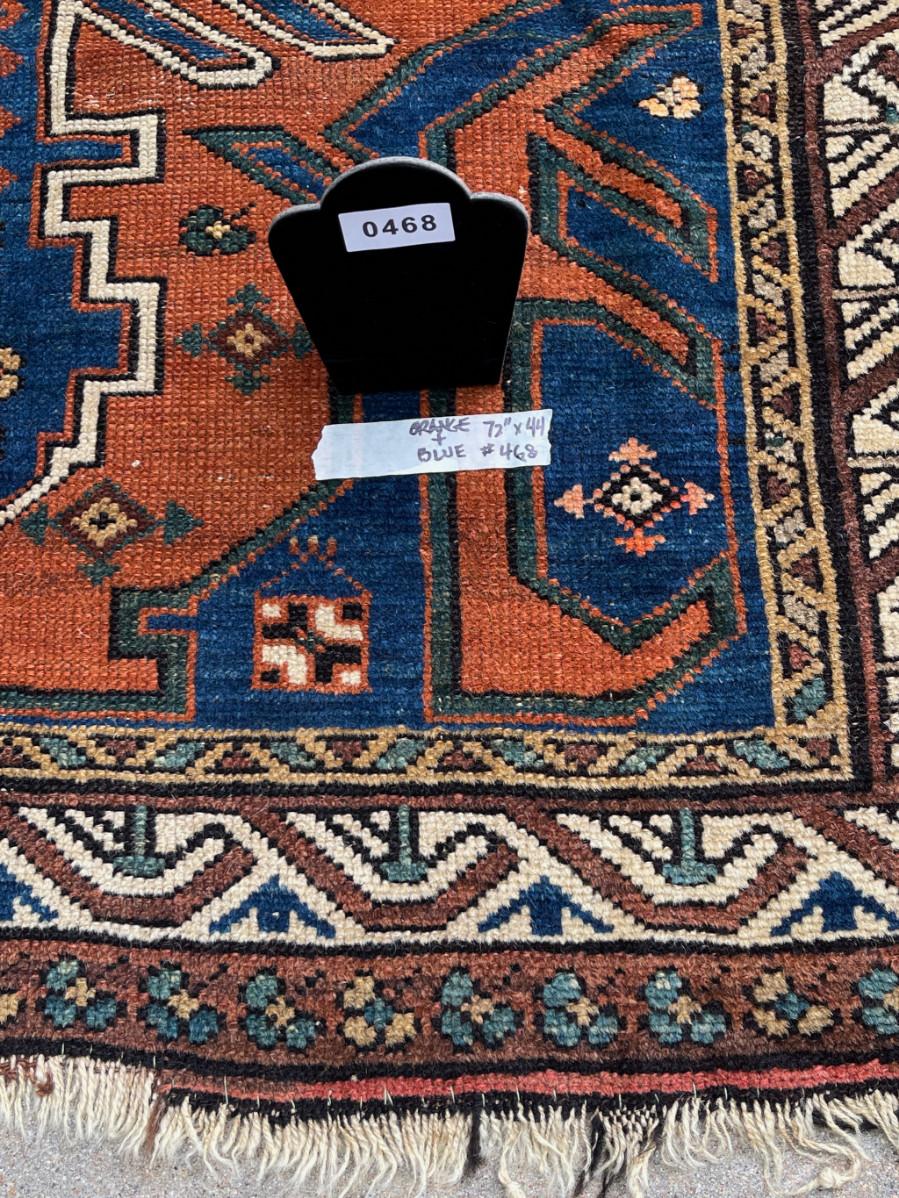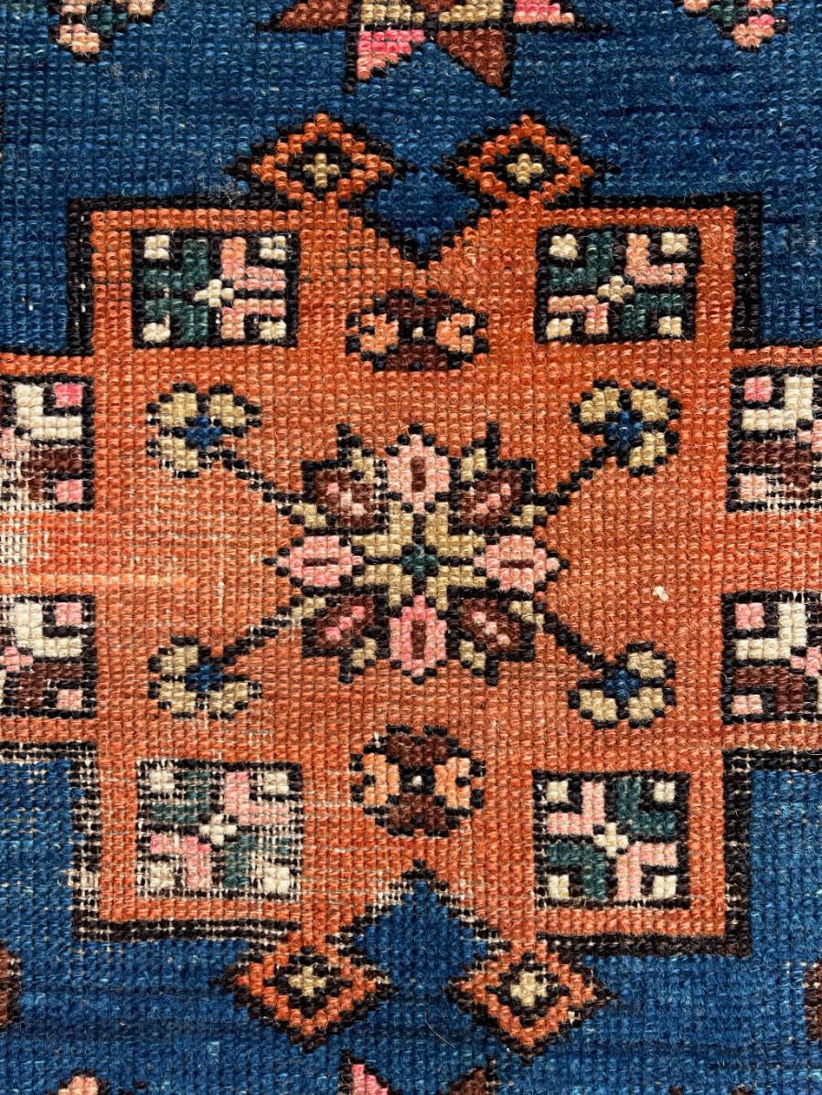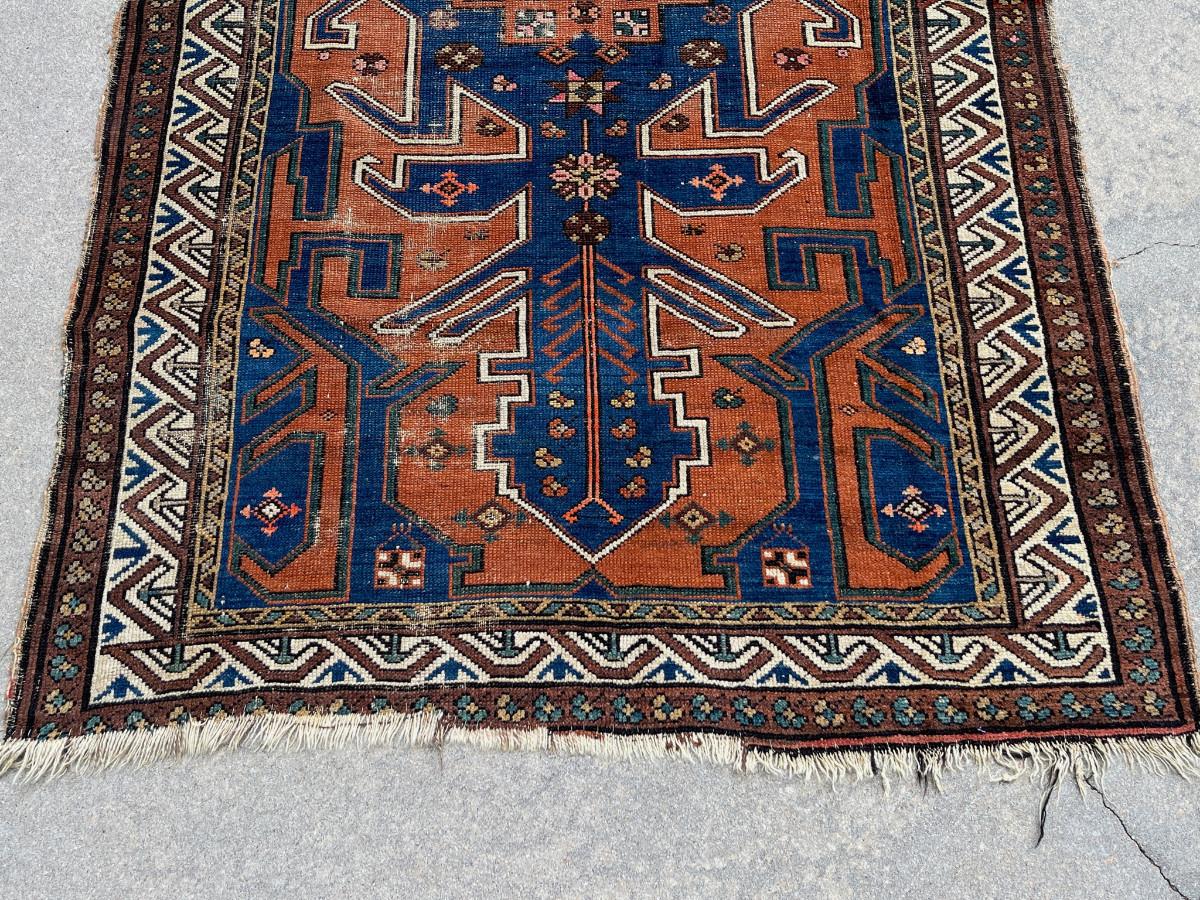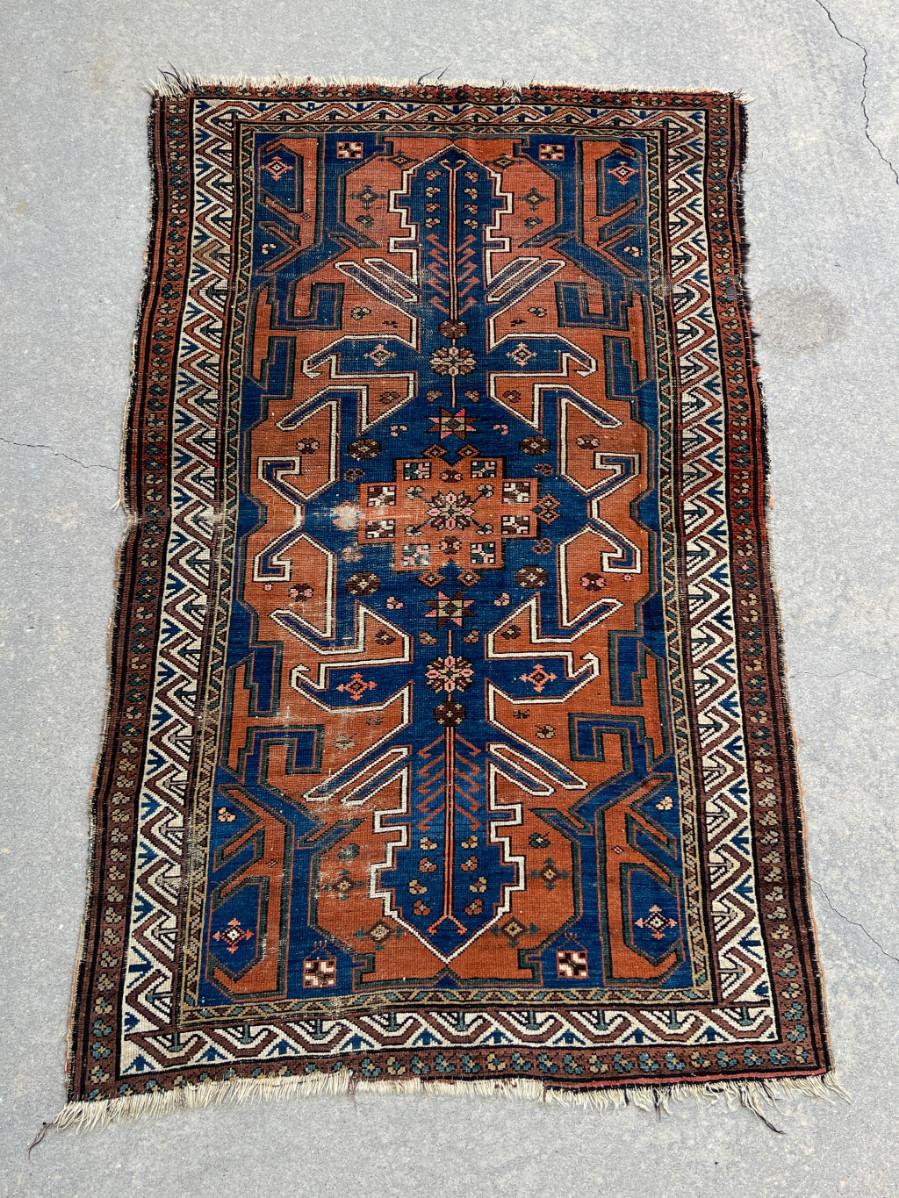 This rug exhibits expected high traffic wear, with one central 2.5 x 2.5 patch of pile worn down to the weft. Still, the well defined tribal pattern and colors are a fine early example from this region. Please refer to the photos for your own assessment of condition.