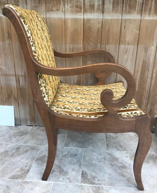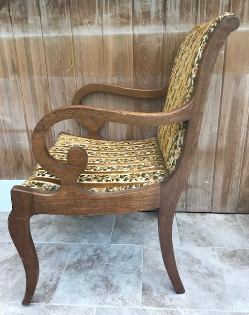 Description: Antique armchair in soft olive color fabric. Measurement approximate: 32 H X 23 W / Seat - 21 W x 19 Length. Shipping Cost: Local pick up only or contact us for quote.