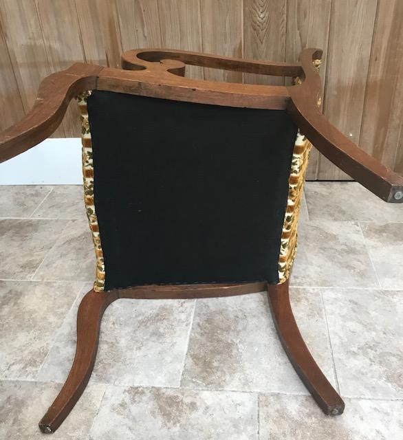 Description: Antique armchair in soft olive color fabric. Measurement approximate: 32 H X 23 W / Seat - 21 W x 19 Length. Shipping Cost: Local pick up only or contact us for quote.