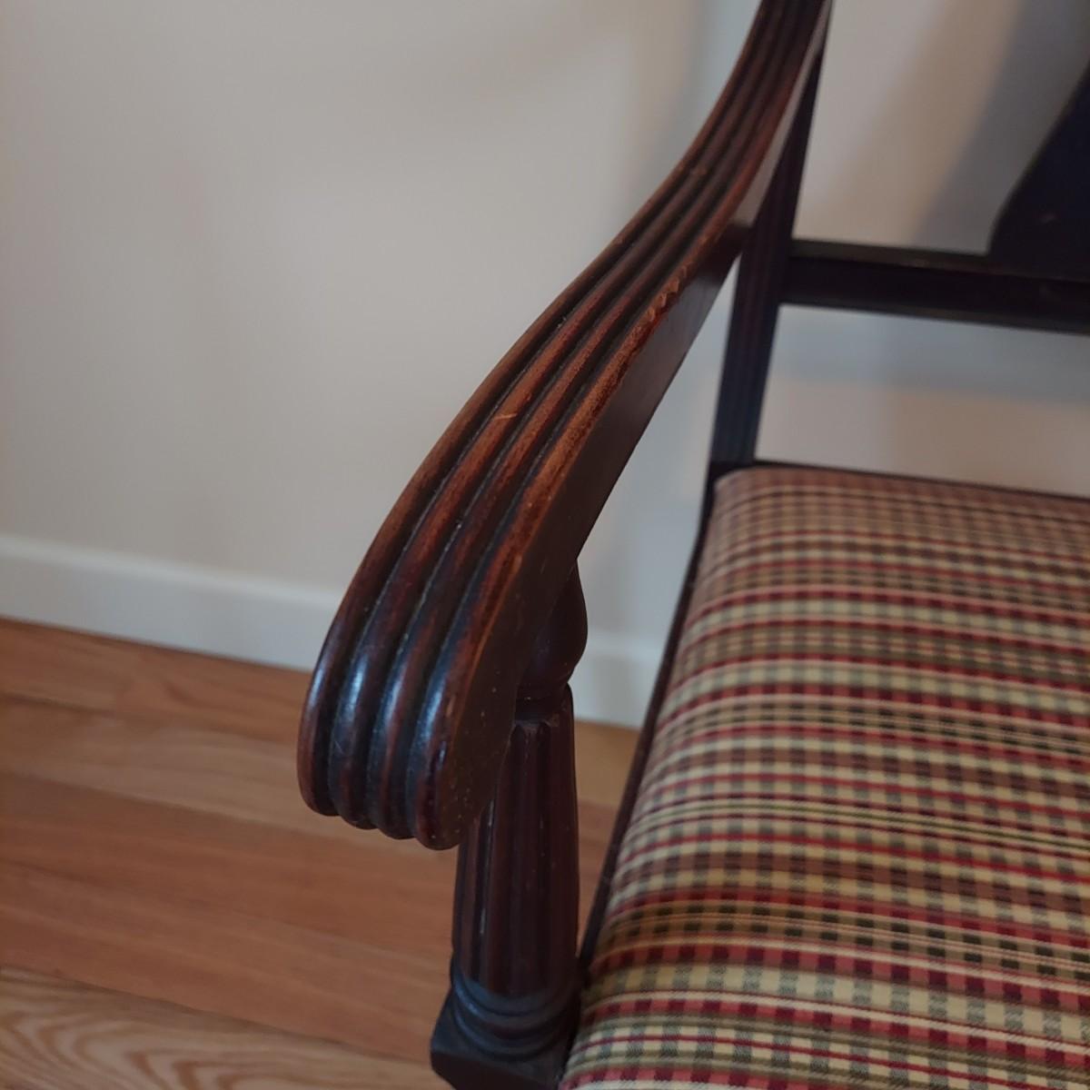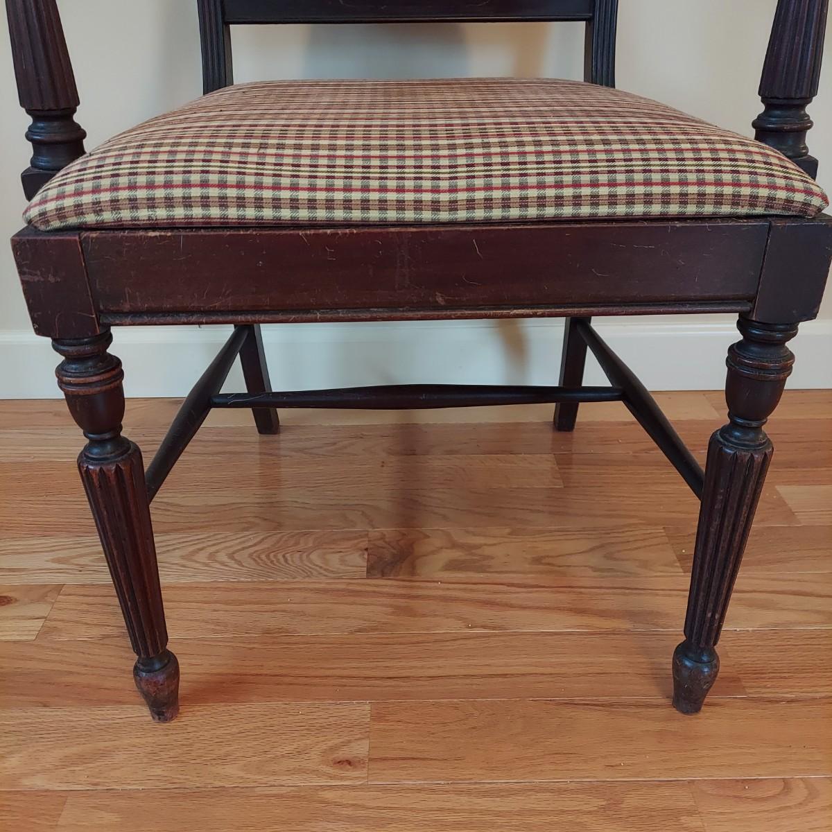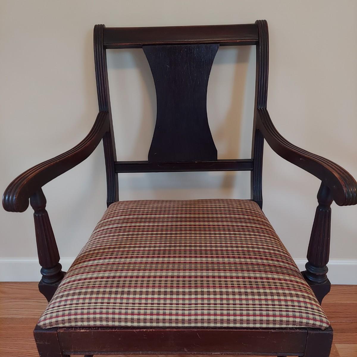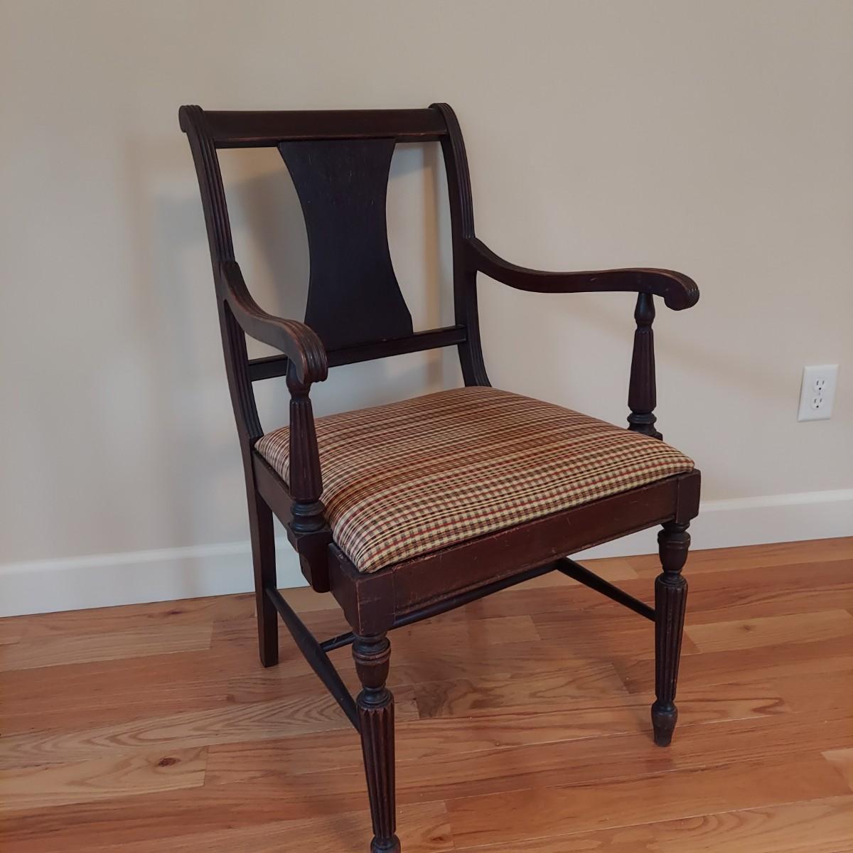 Chair with wooden frame and upholstered seat. Appears to be an antique style. Measures approximately 22” x 21” x 36"H with a 19” seat height. Please see photos for details. Local Pickup Only