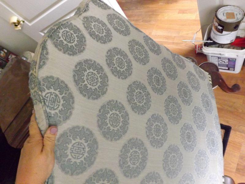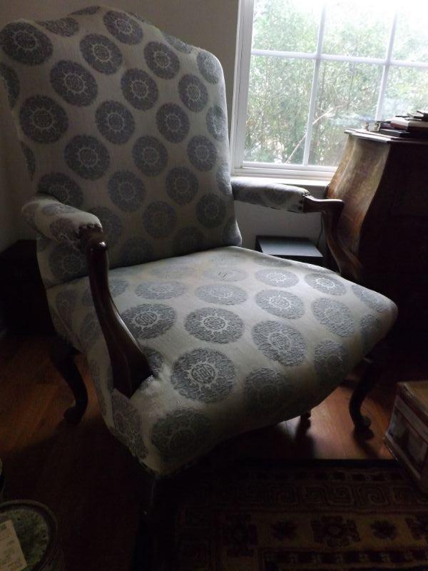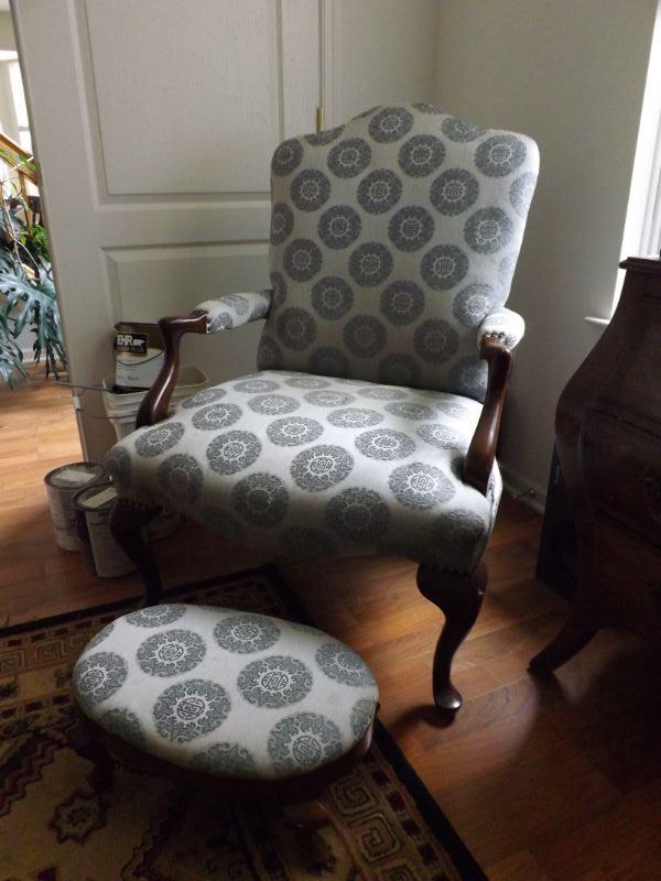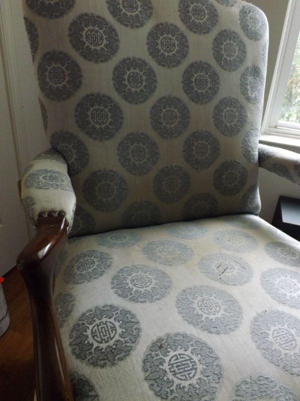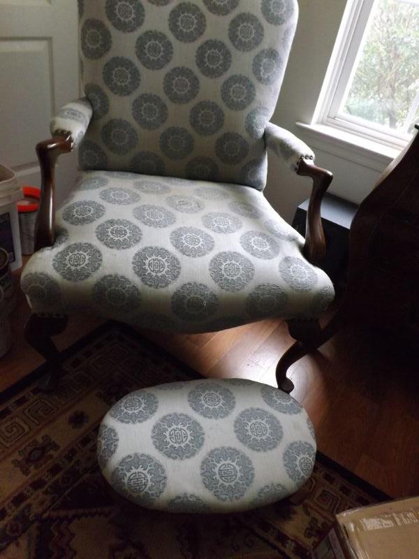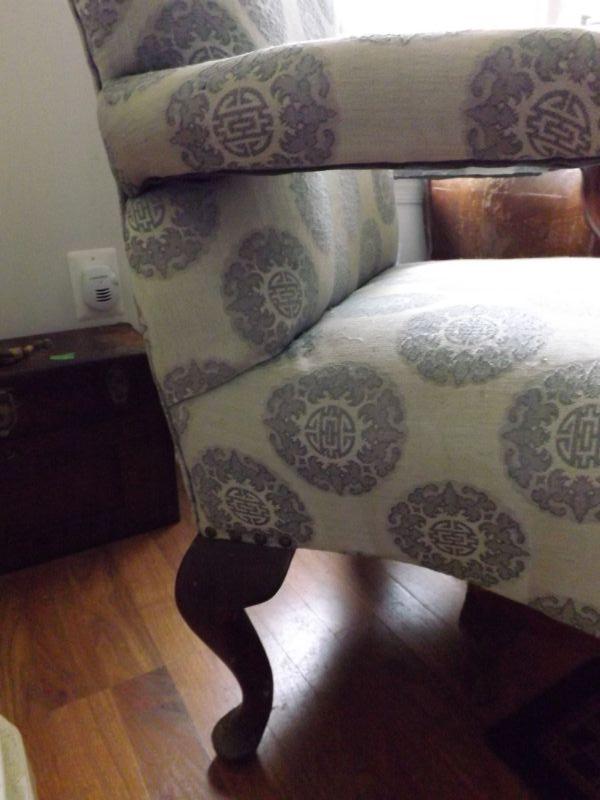 Antique Armchair with footstool. Needs a good cleaning, but otherwise good condition. **Please read Terms and Conditions before placing a bid. Pick up is Sunday, September 1, 2019 from 10am to 4pm in Williamstown. All sales are final. All sales are as is, where is. Please review all photos. Any props included in photos are not included in listing. All measurements are approximate. Comes from home with cats.