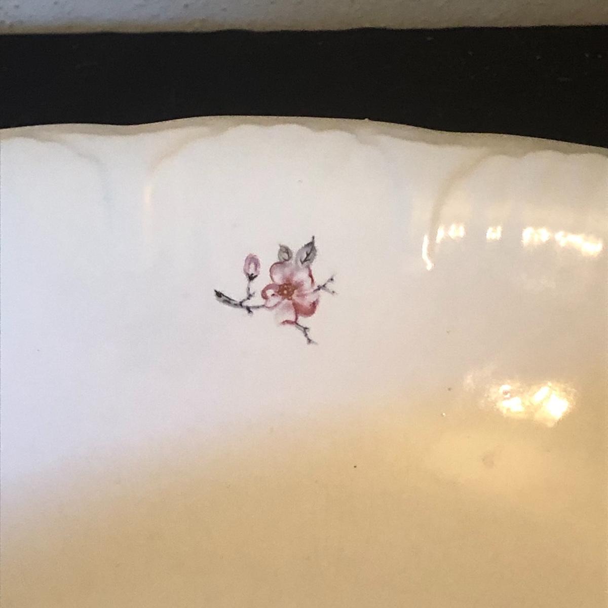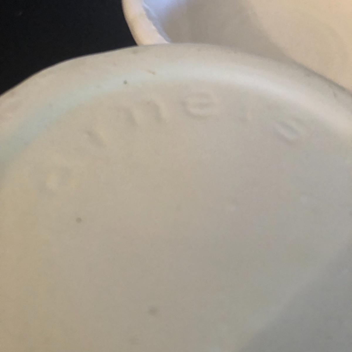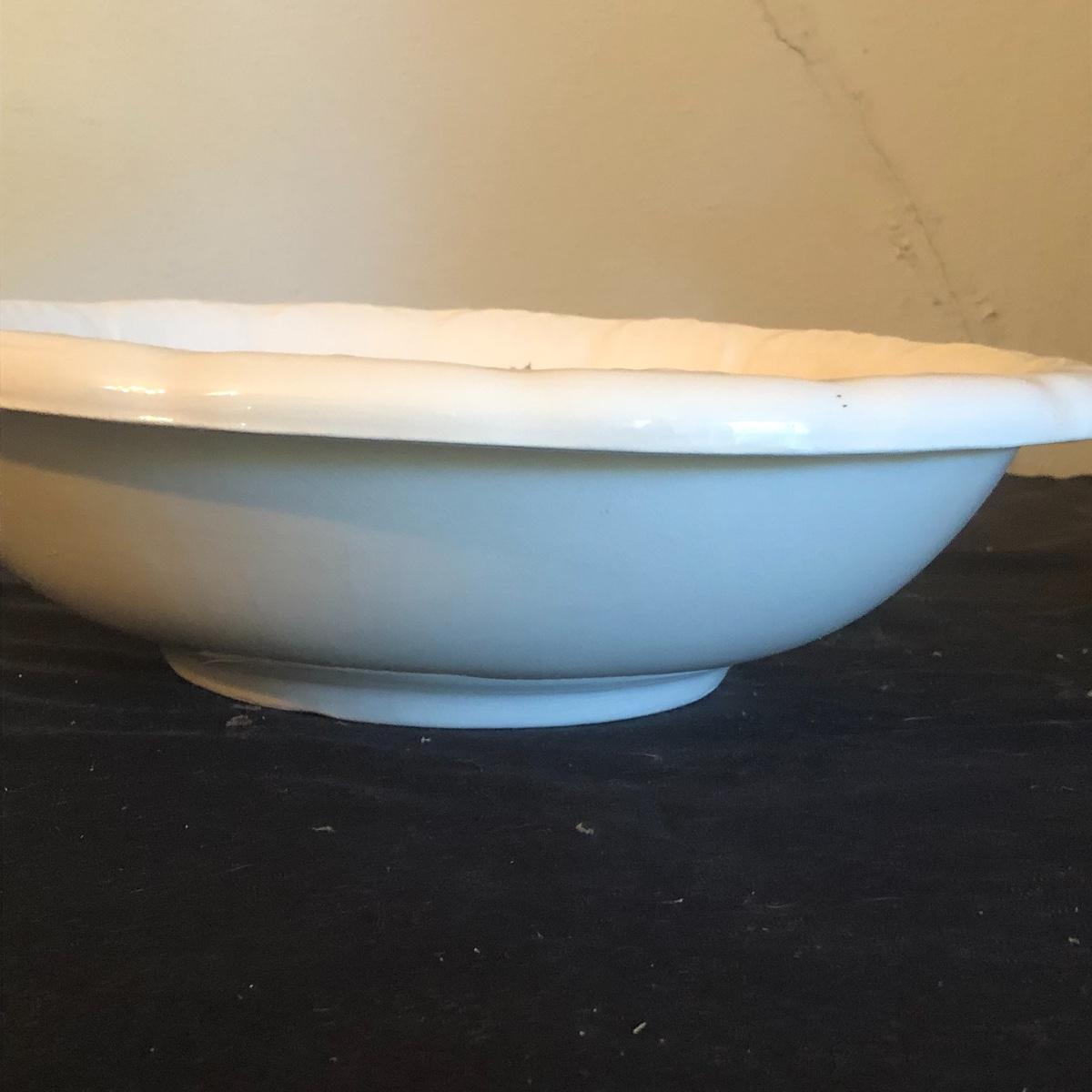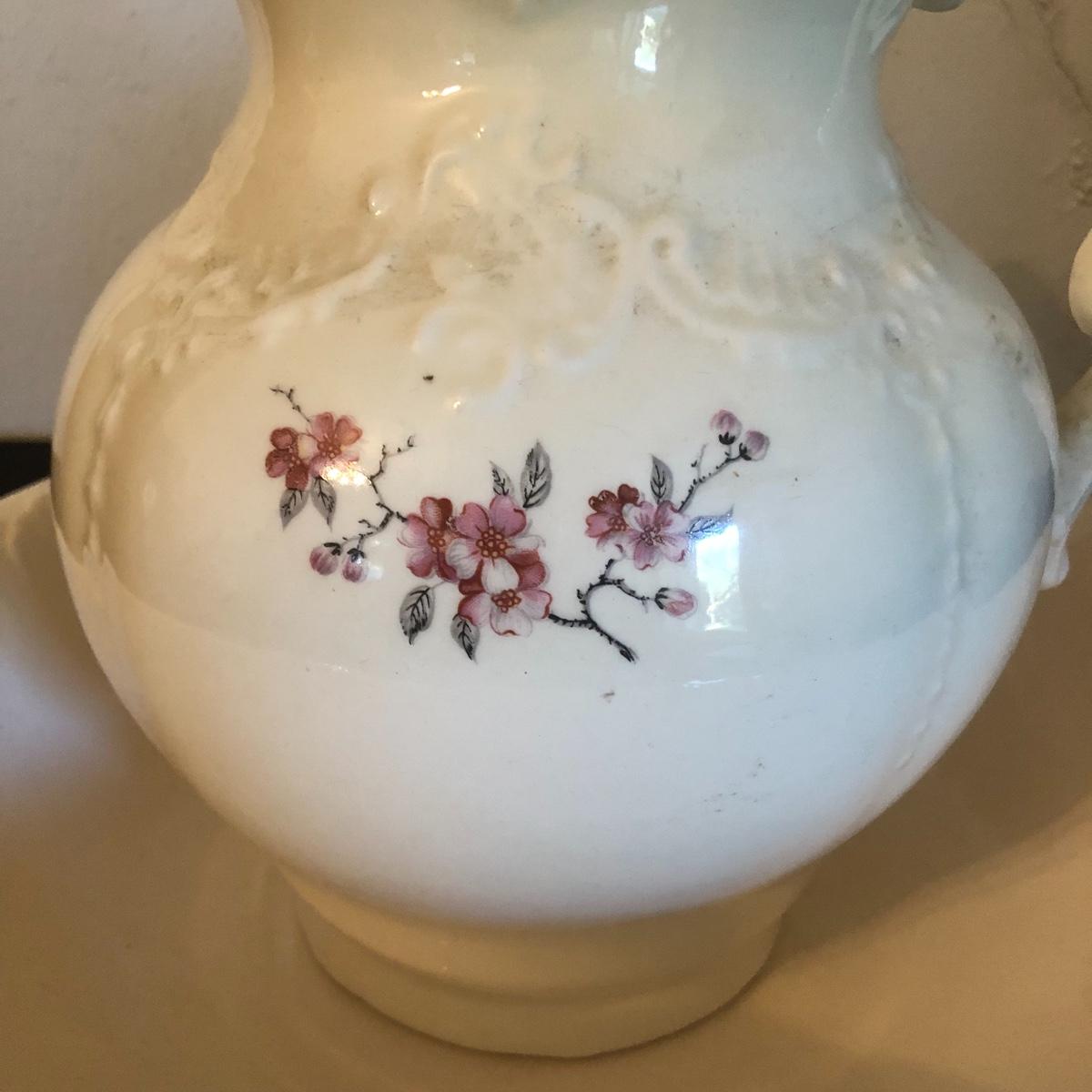 This large pitcher and bowl are cream colored with a rise motif. Some minor crazing in the glaze and there is a mark on the bowl which looks like paint or grout.