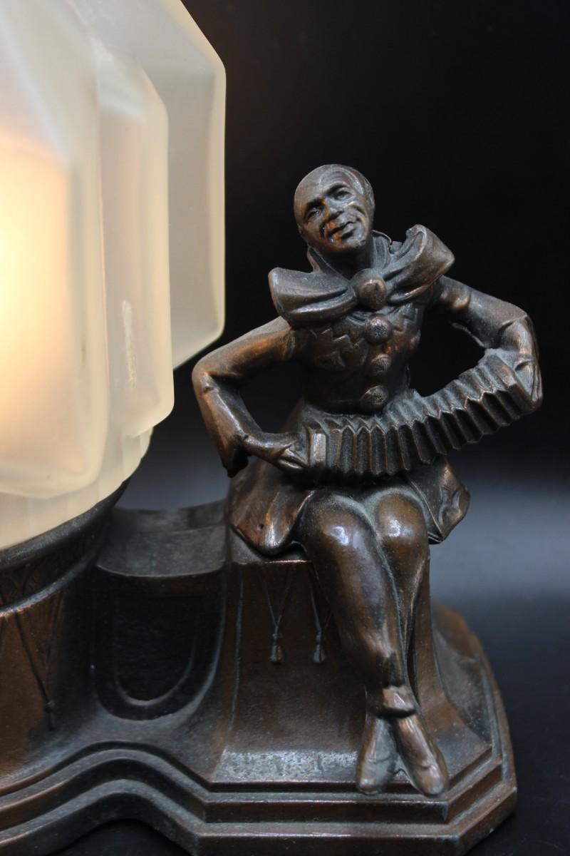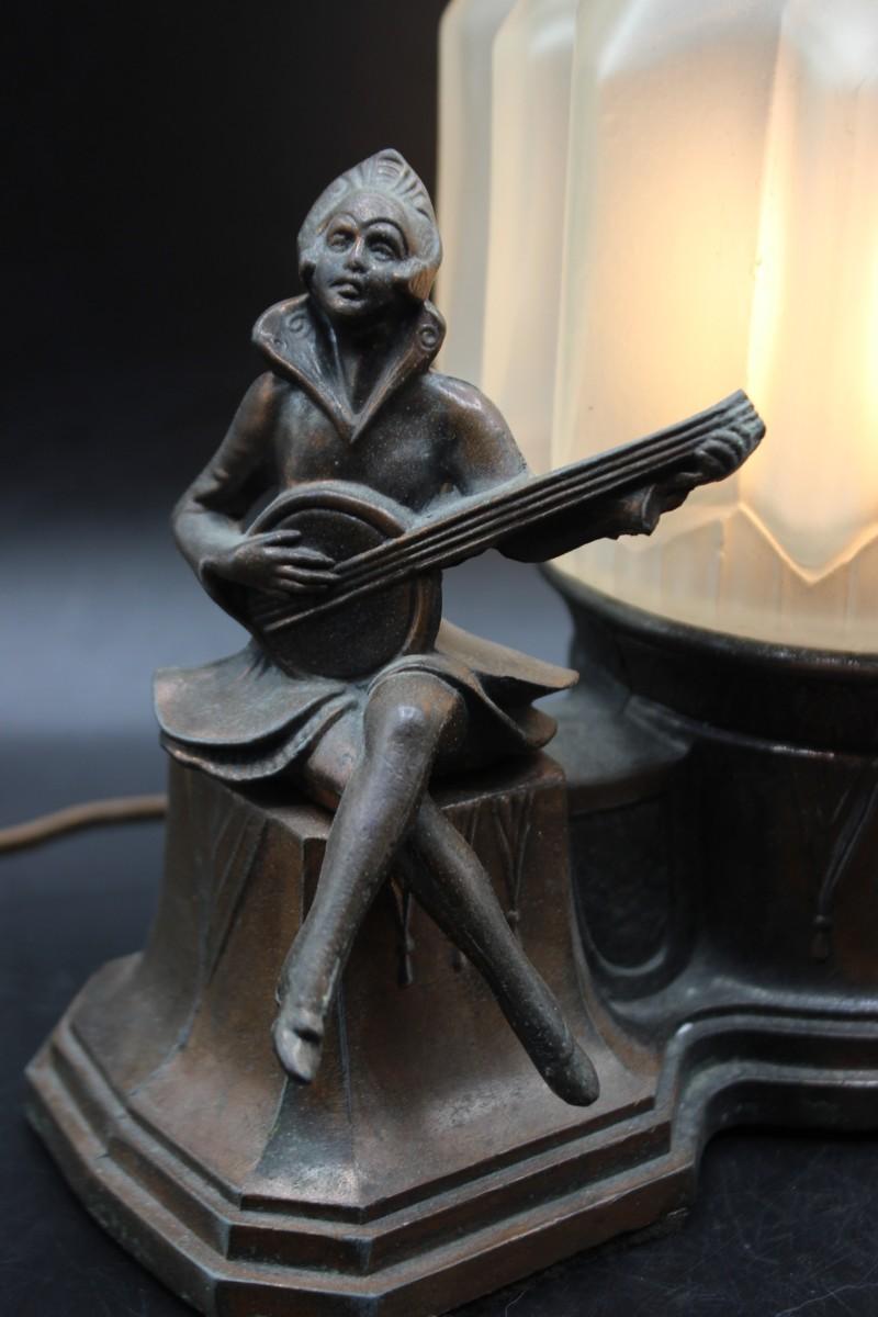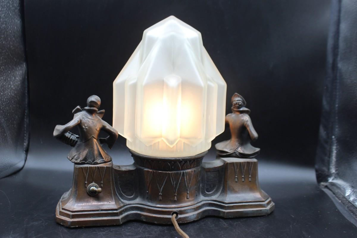 Antique Art Deco Harlequin & Pierrot Bronze Metal Cast Radio Lamp, there is no significant damage to the radio lamp and is in good condition. The lamp works perfectly when plugged in and can be dimmed, check pictures for more details. There is no significant damage to the glass and is in good vintage condition, check pictures for more details and for sizing.