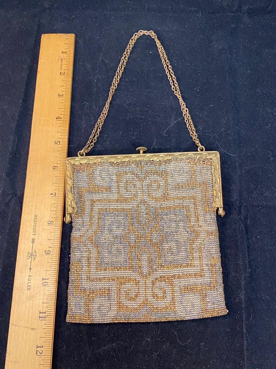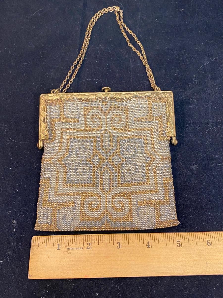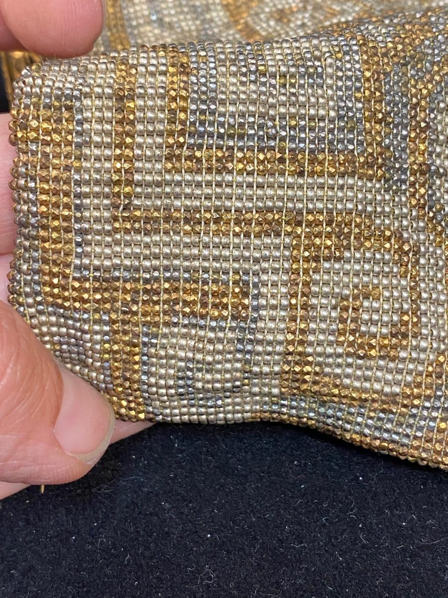 Antique Art Deco Micro Bead Handbag Purse Hand-Made France. Silver & gold geometric design. In good condition, no holes. Push button latch. Bag is about 5" size, overall length is about 11".