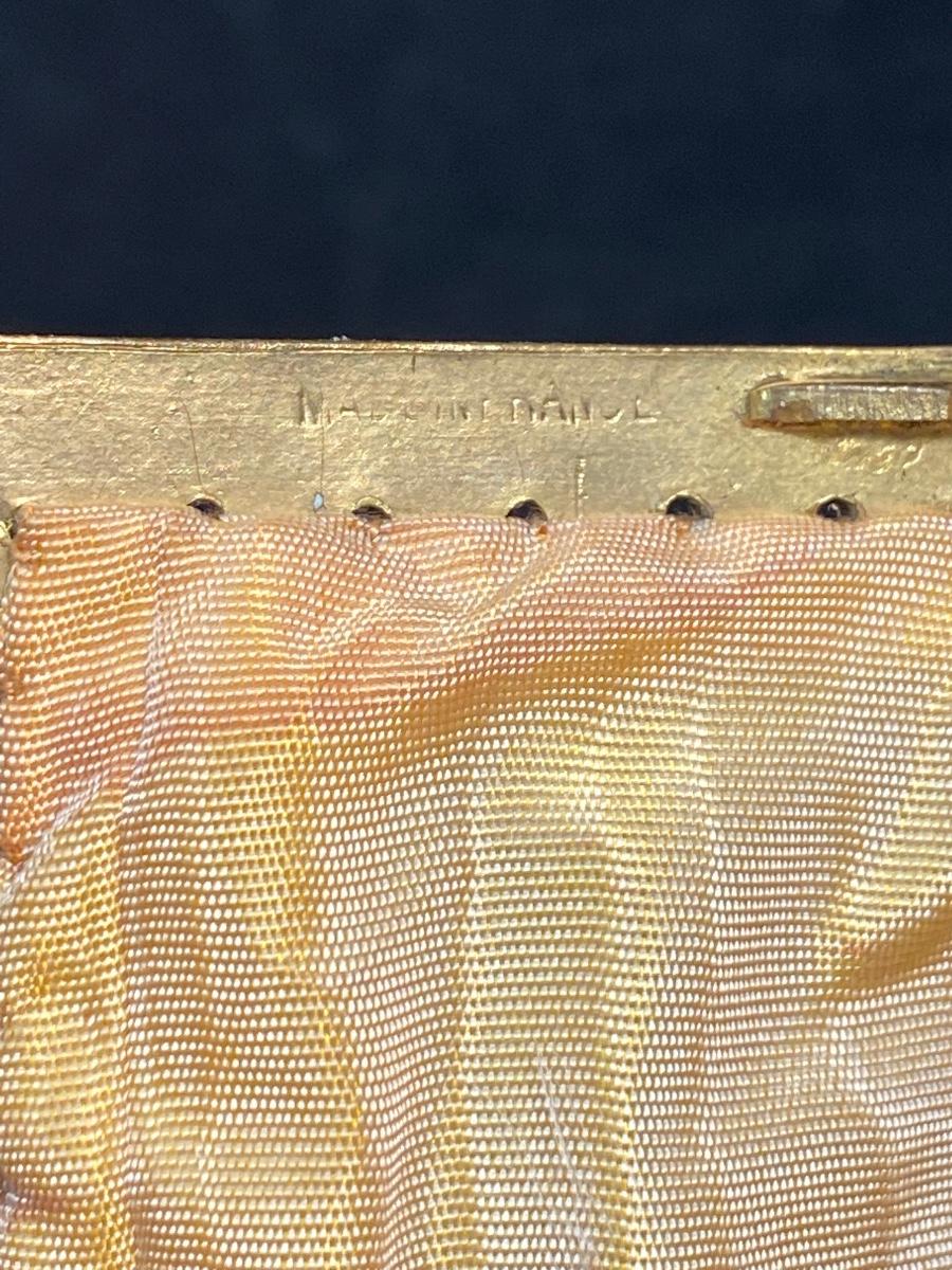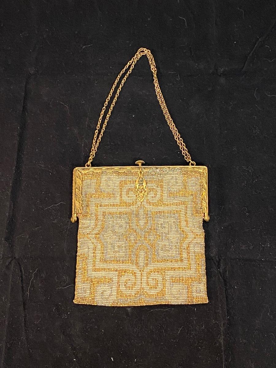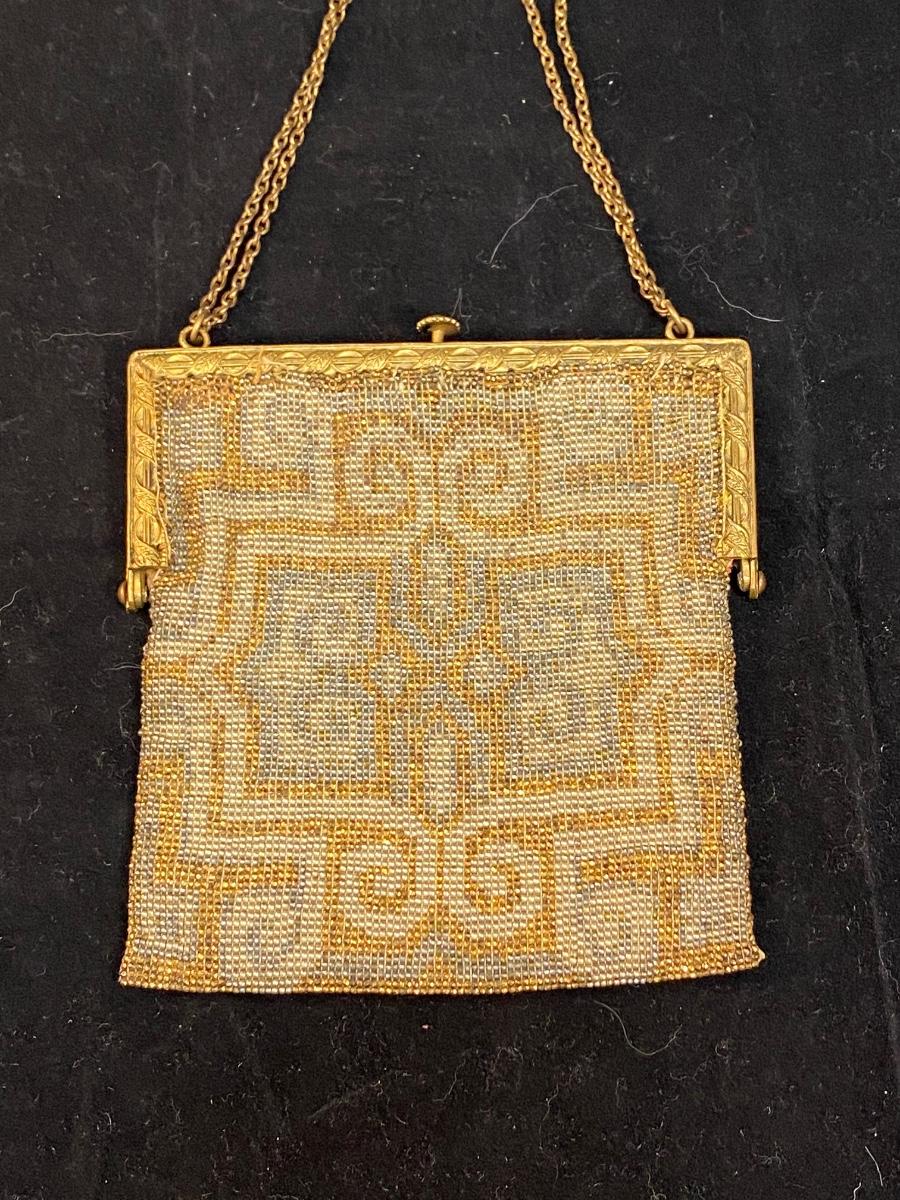 Antique Art Deco Micro Bead Handbag Purse Hand-Made France. Silver & gold geometric design. In good condition, no holes. Push button latch. Bag is about 5" size, overall length is about 11".