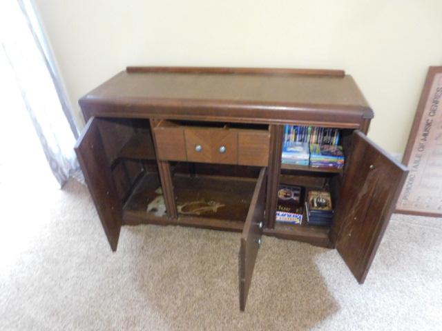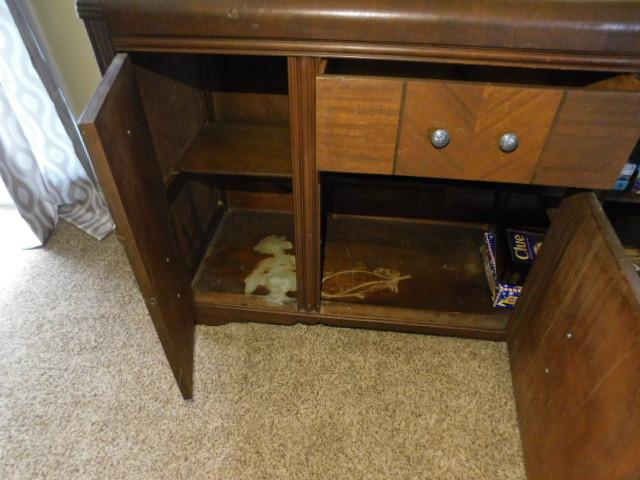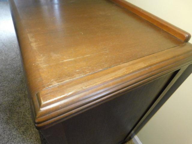 Antique Art Deco Waterfall Buffet 55"x19"x37" has some wear and scratches to surface. Stains on the shelves inside. Nice item