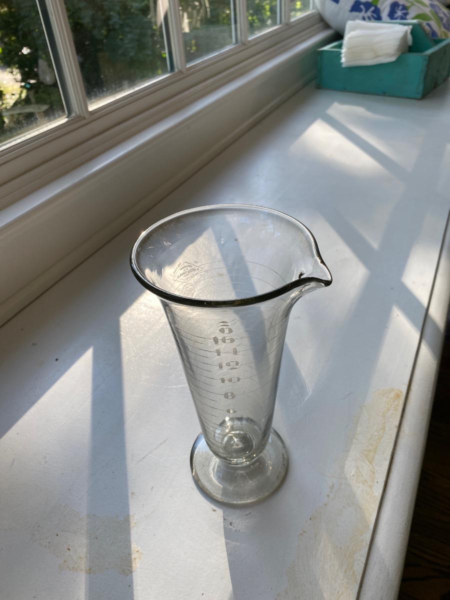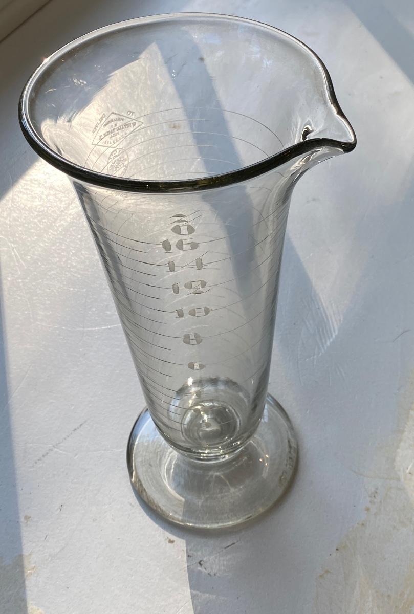 Great old lab beaker that would be fabulous on a cocktail cart or bar. Nice Art Deco sloped shape with wonderful folded spout, deco lettering of the ounces ( goes to 16 oz , ie 2 cups)