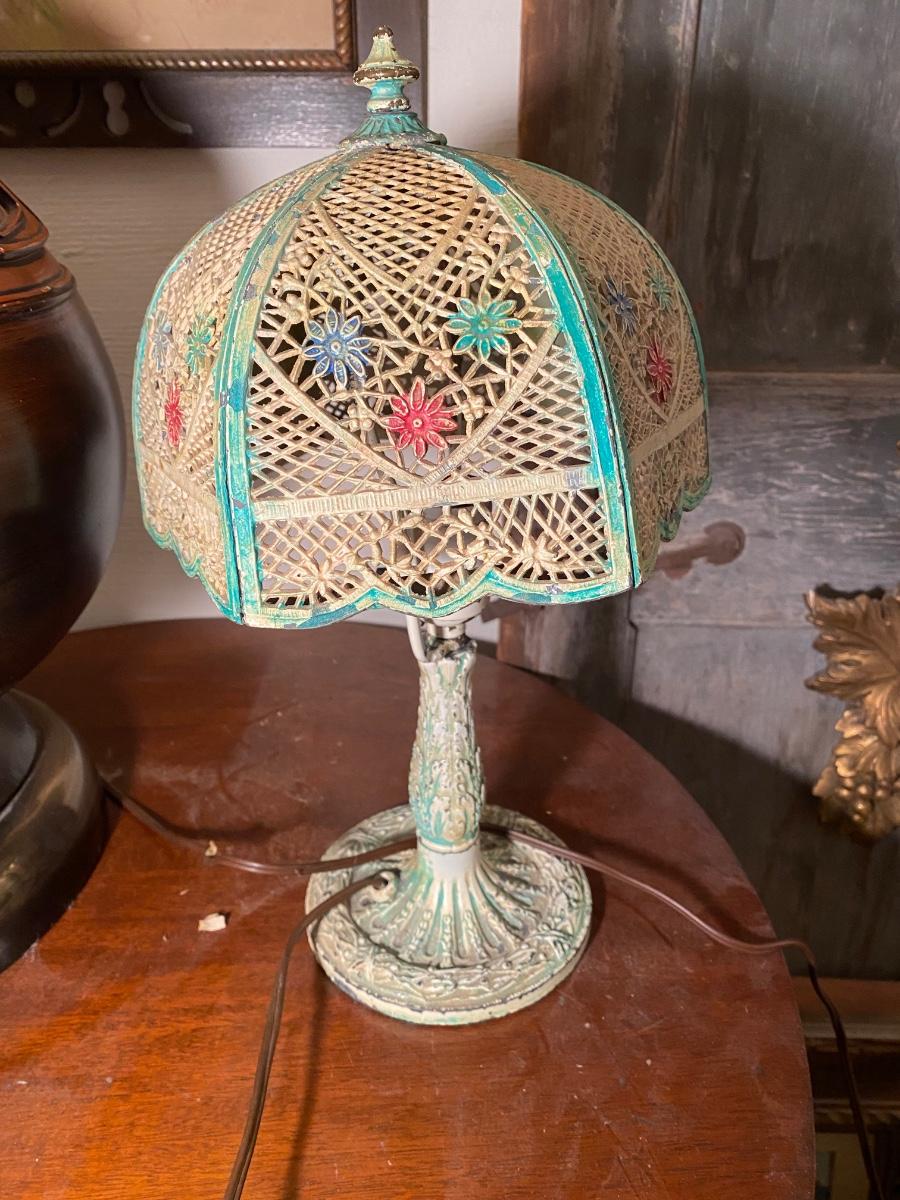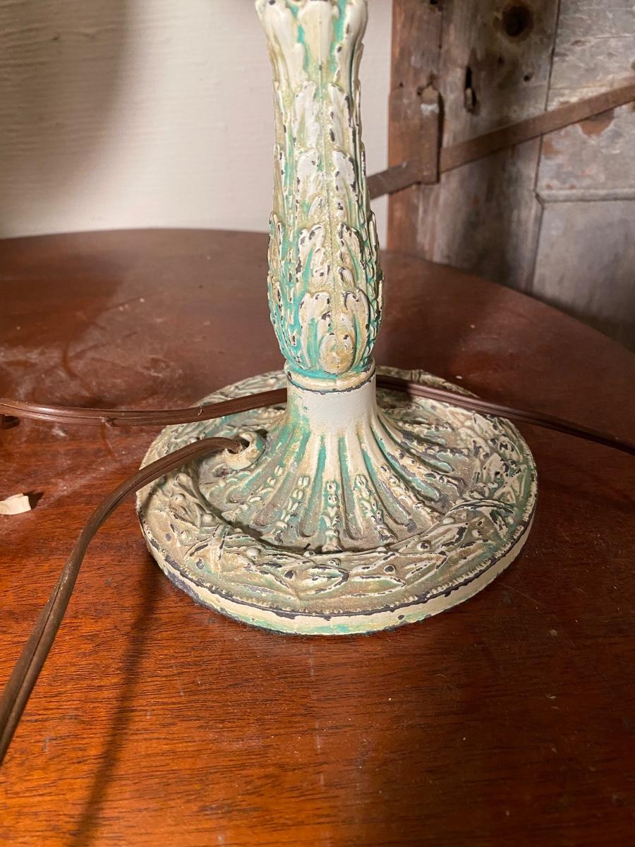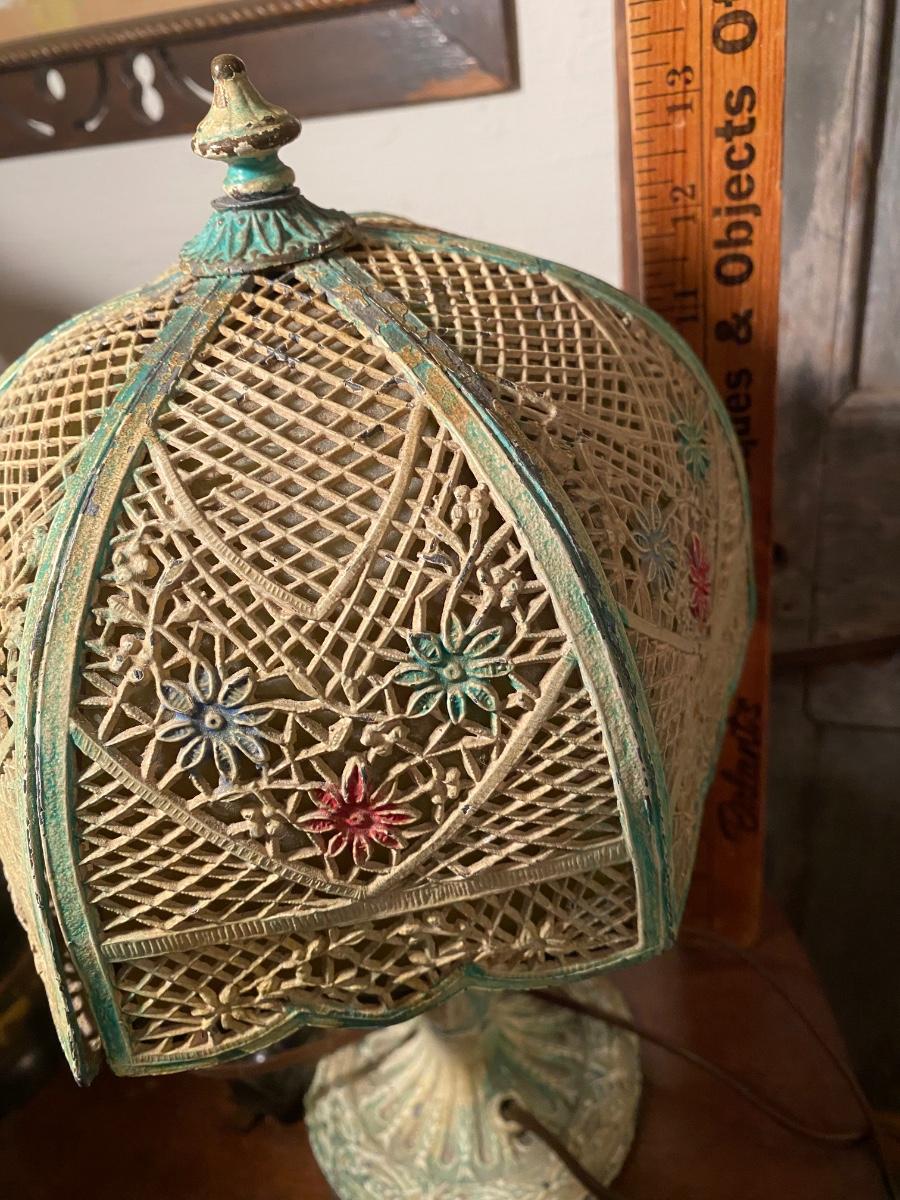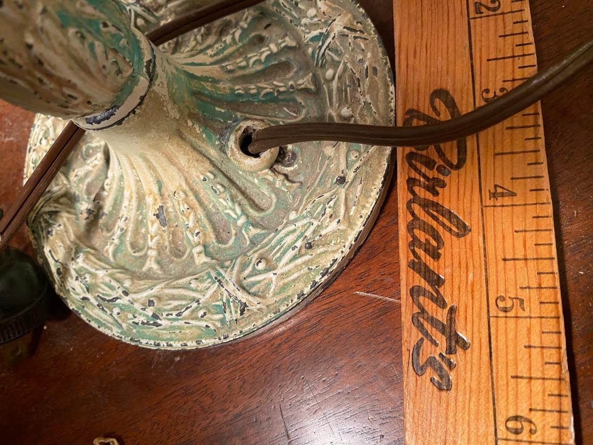 Antique Art Nouveau Cast Iron Table Lamp. 2panels have no glass, older plug might need to be swtched out. Wear on paint gives it a sweet distressed look. 13" high