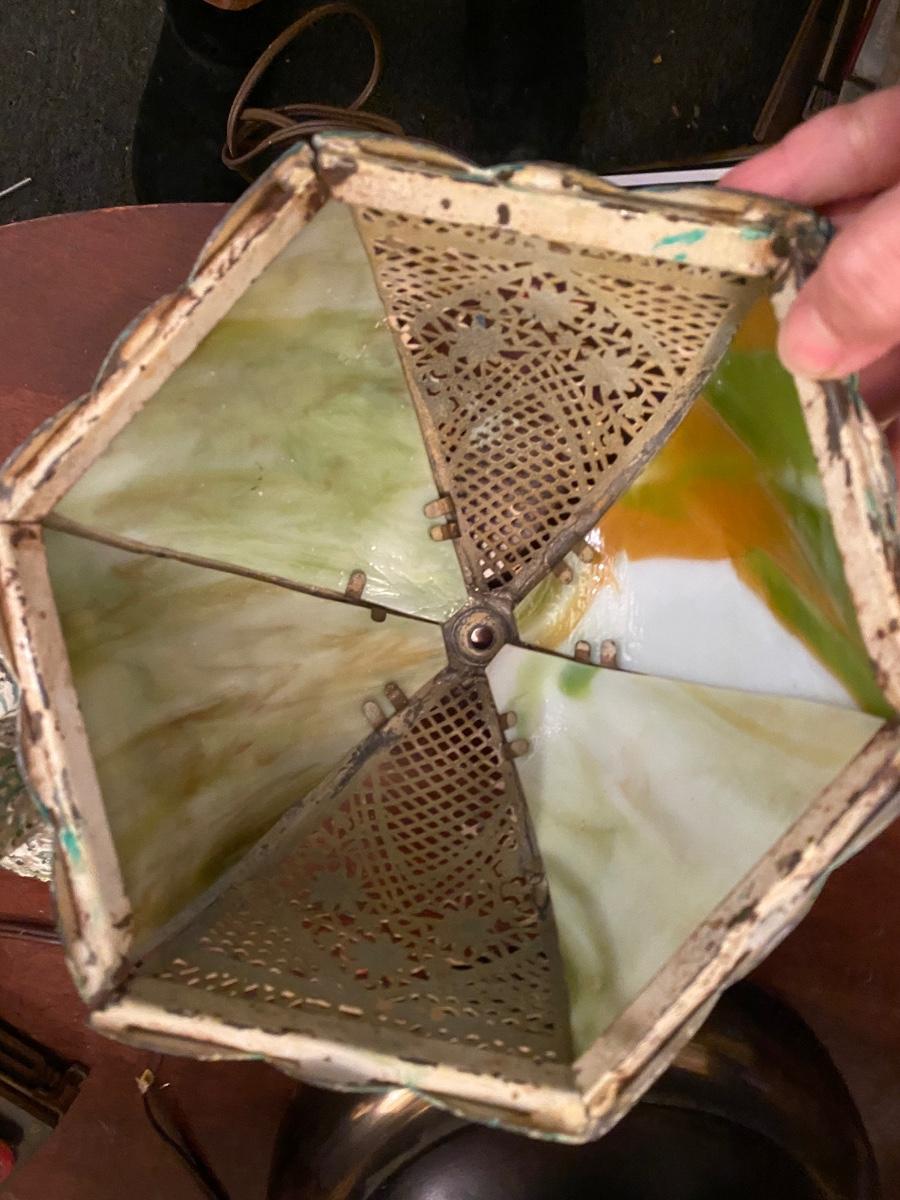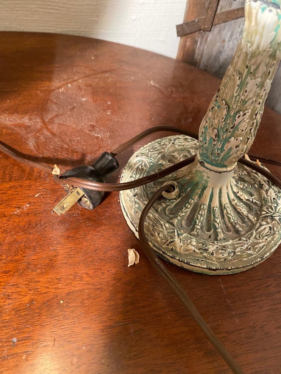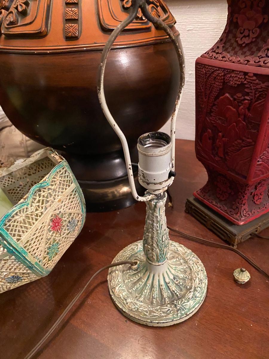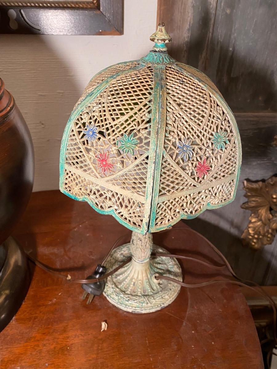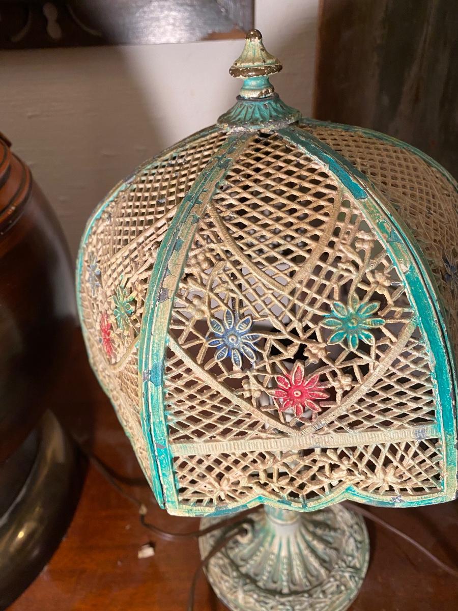 Antique Art Nouveau Cast Iron Table Lamp. 2panels have no glass, older plug might need to be swtched out. Wear on paint gives it a sweet distressed look. 13" high