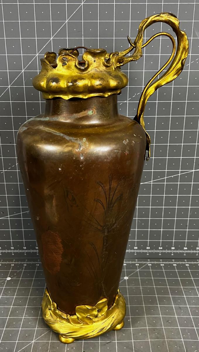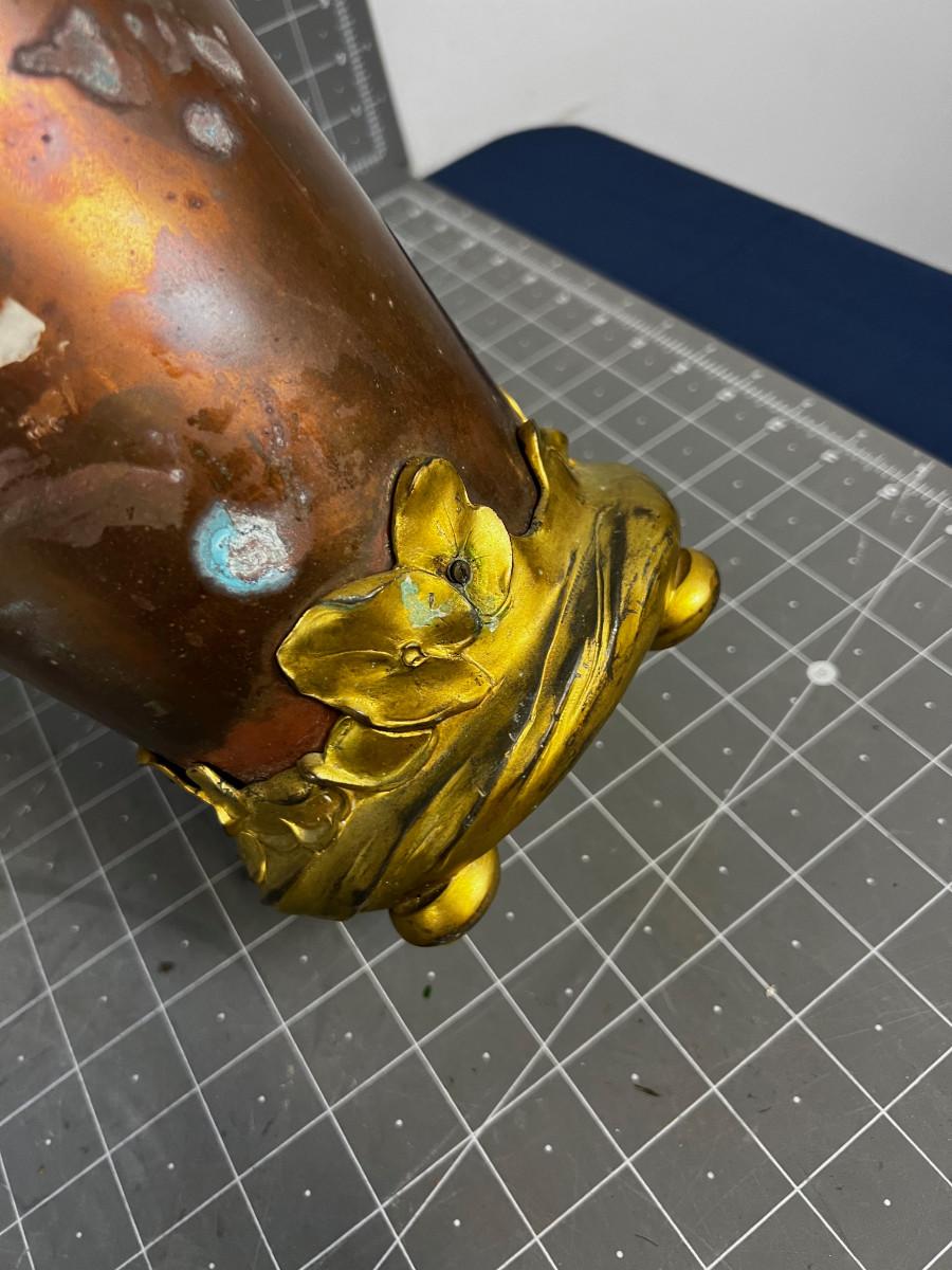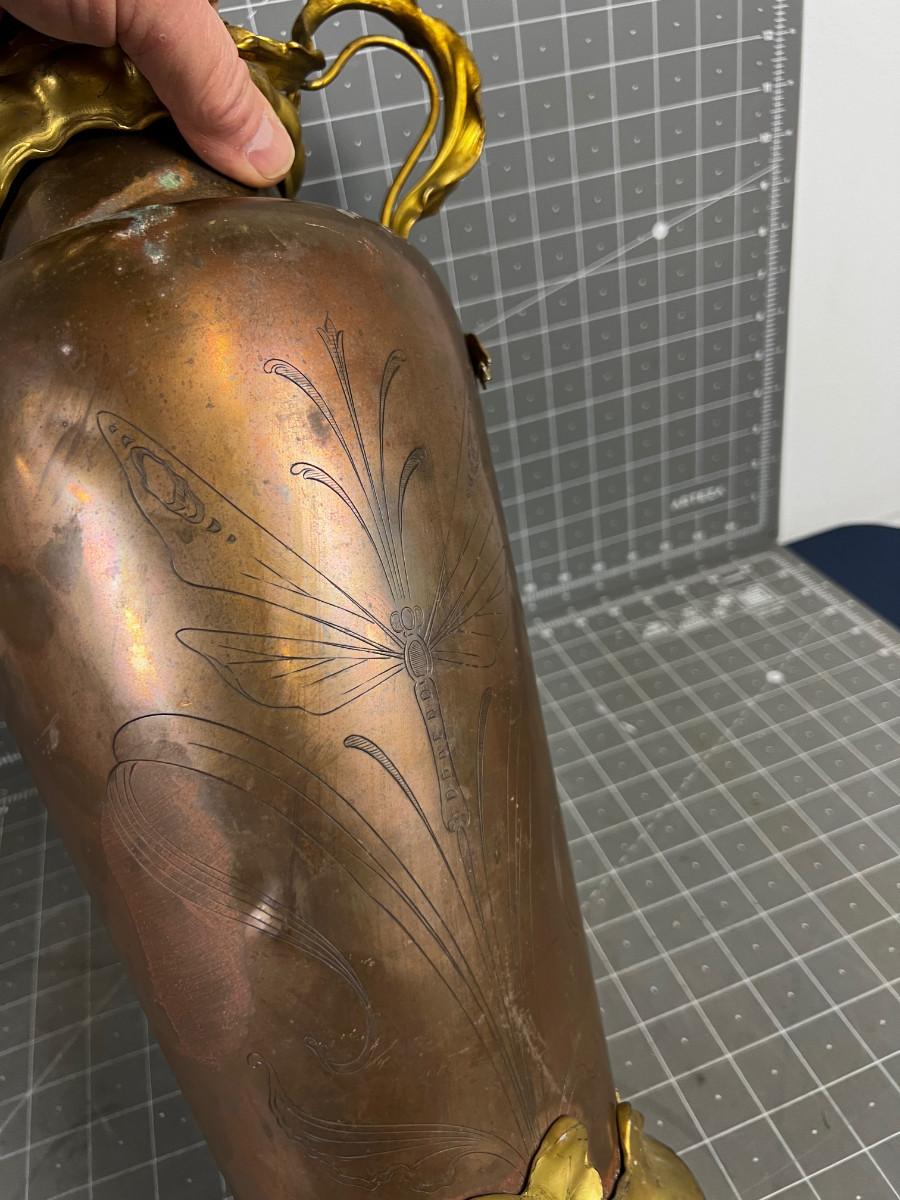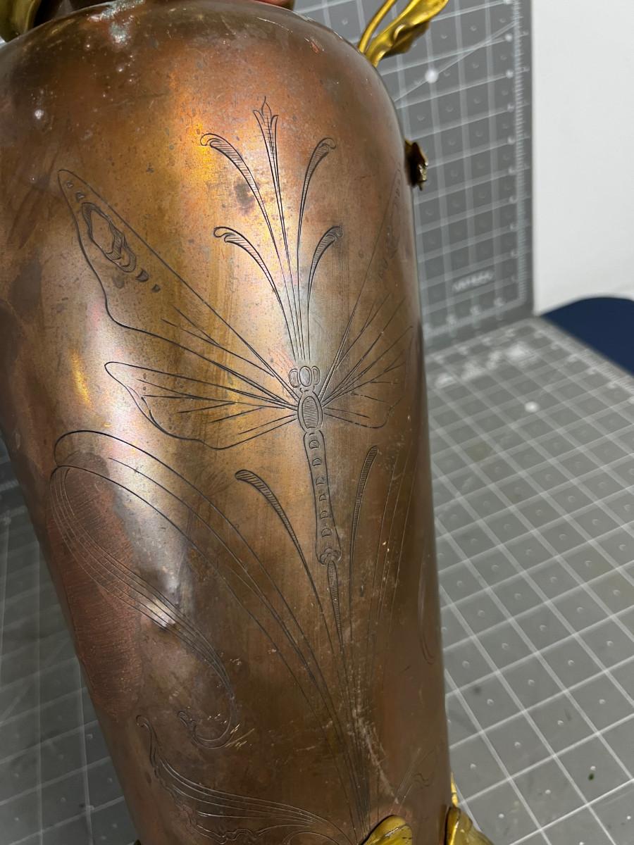 Antique Art Nouveau Copper and Bronze Vase with Etched Dragon Fly