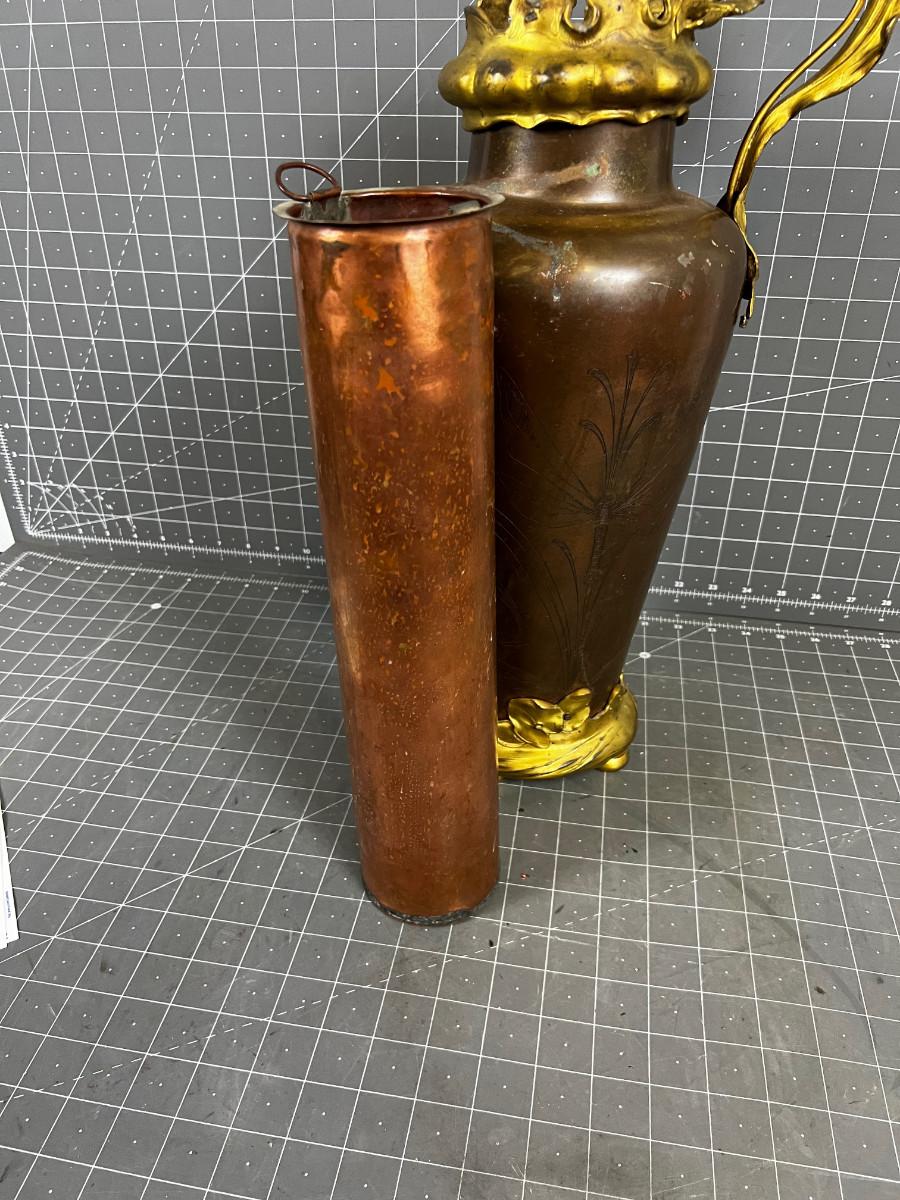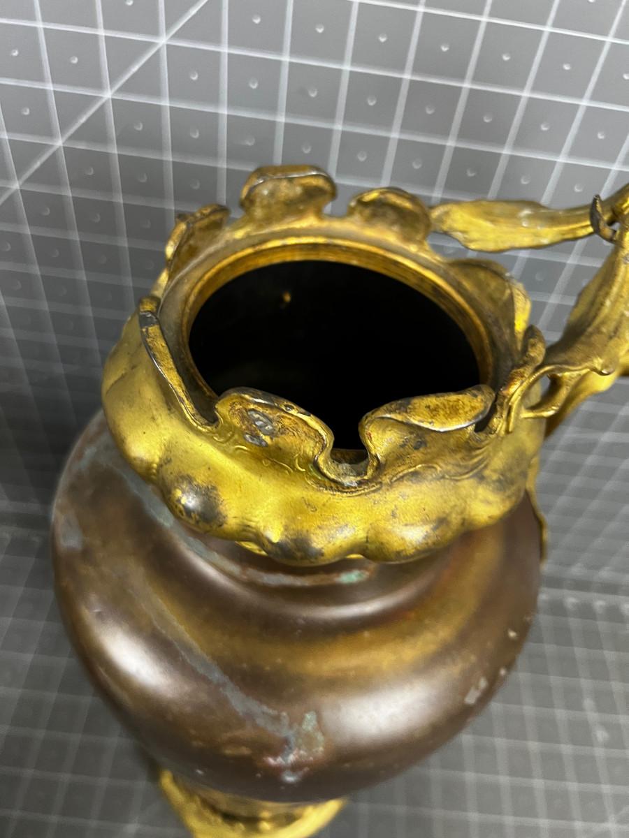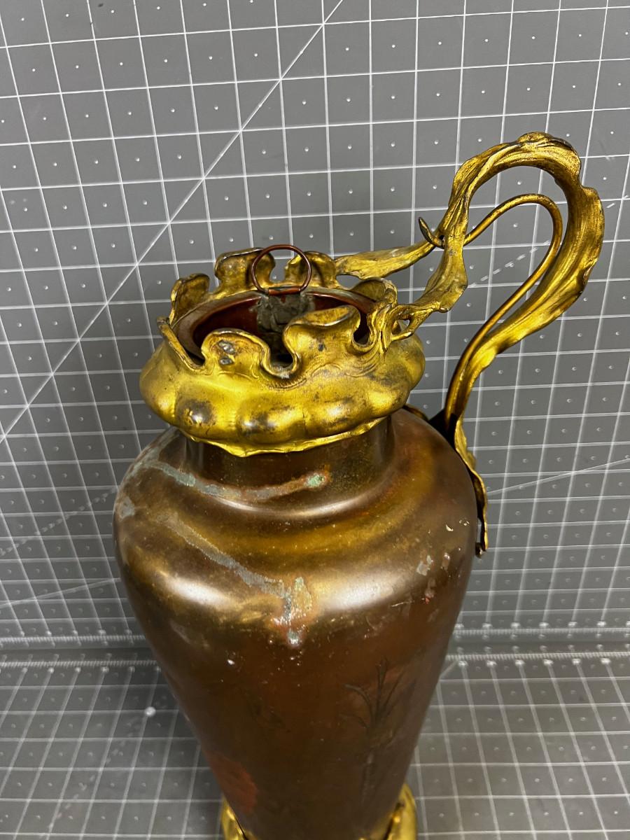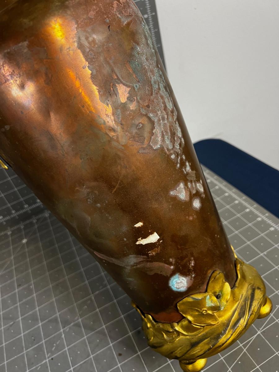 Antique Art Nouveau Copper and Bronze Vase with Etched Dragon Fly