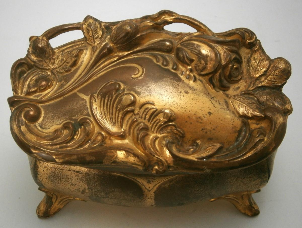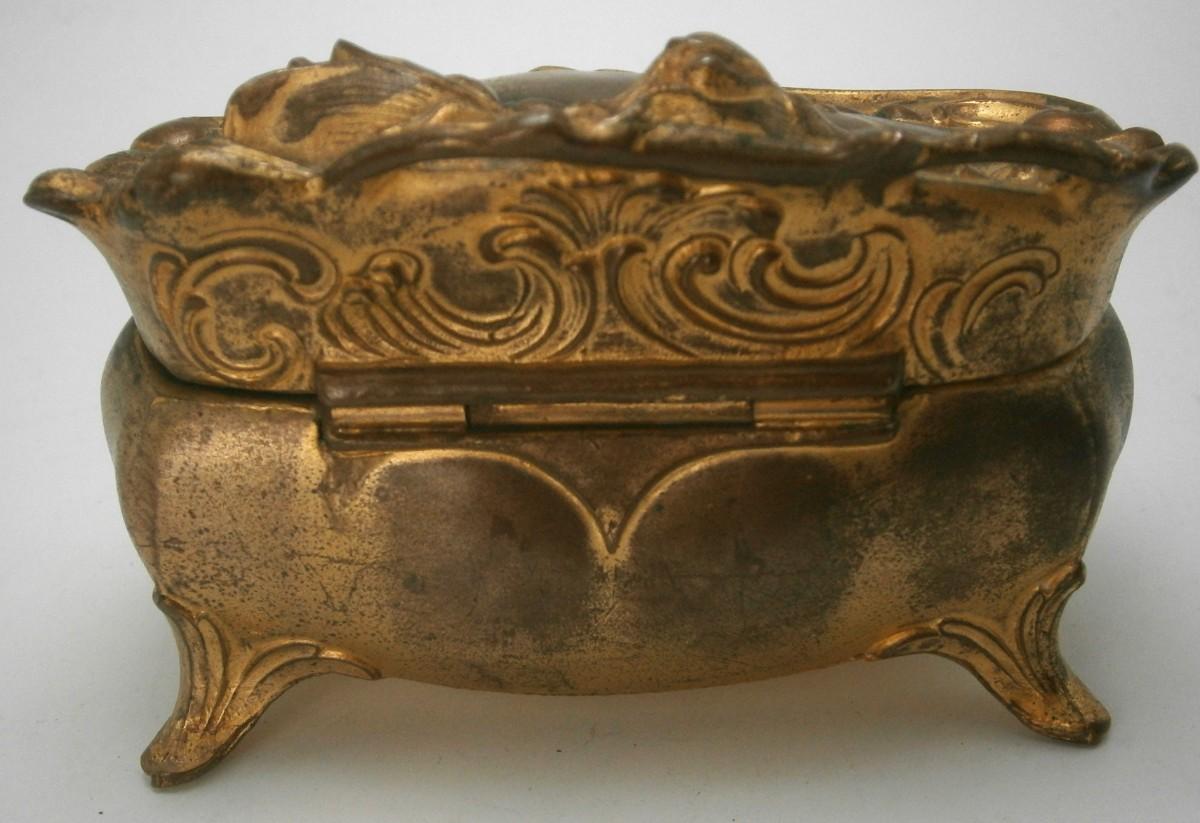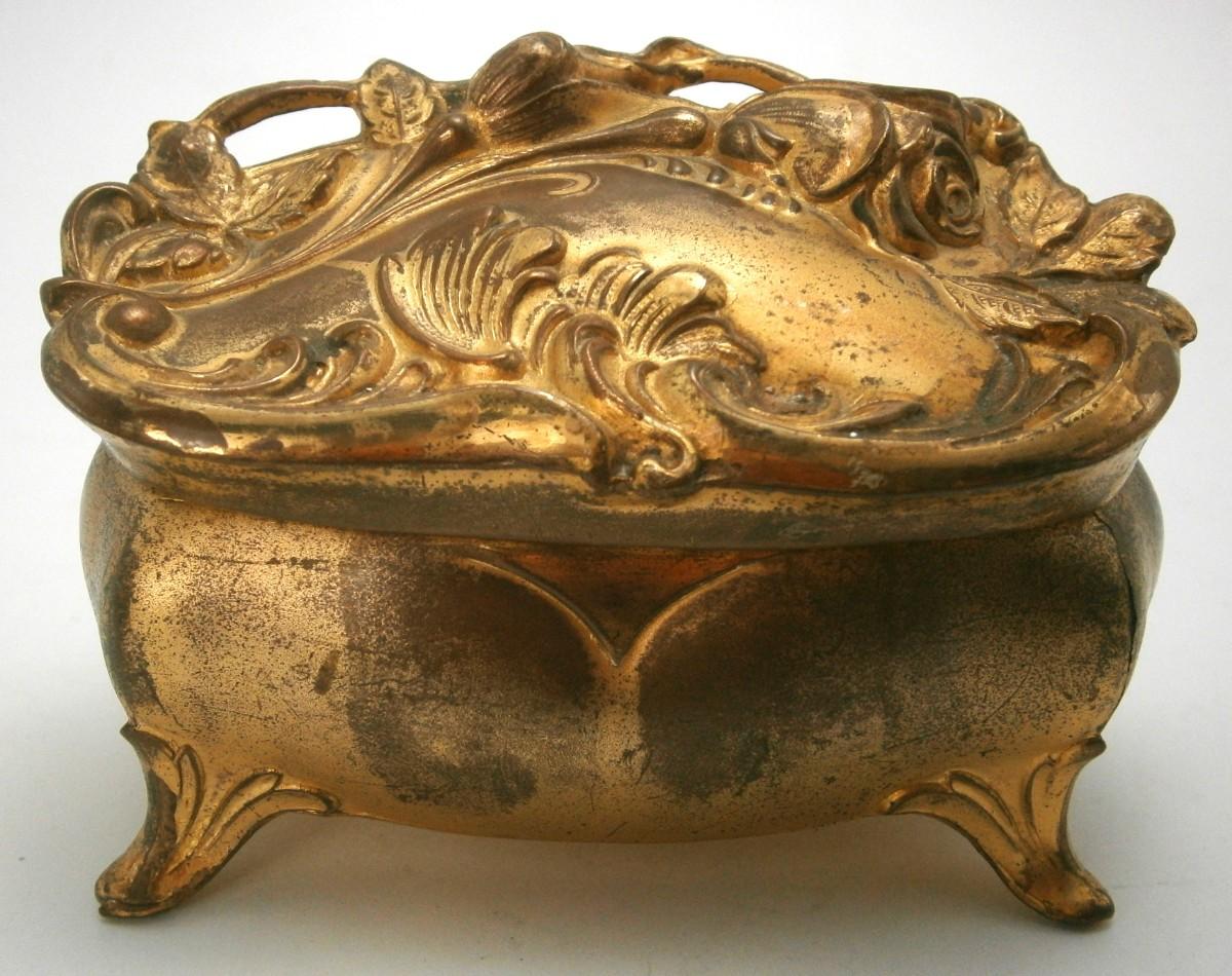 Antique Art Nouveau Gilded Jewelry Casket Trinket Box by Jennings Brothers. 2 in. tall x 3 3/4 in. wide, white metal with gold finish, silk lining (frayed).