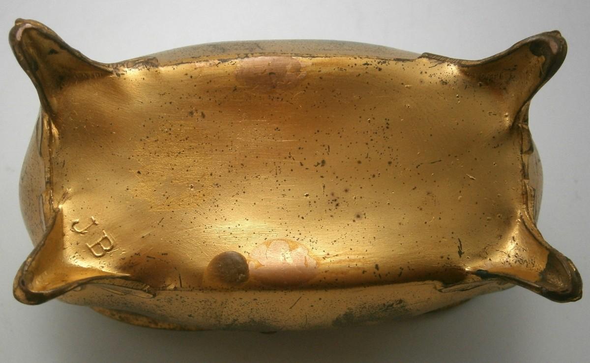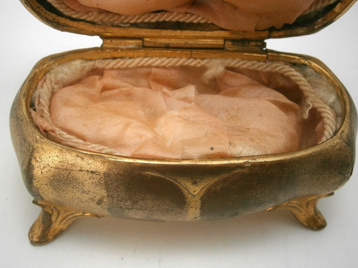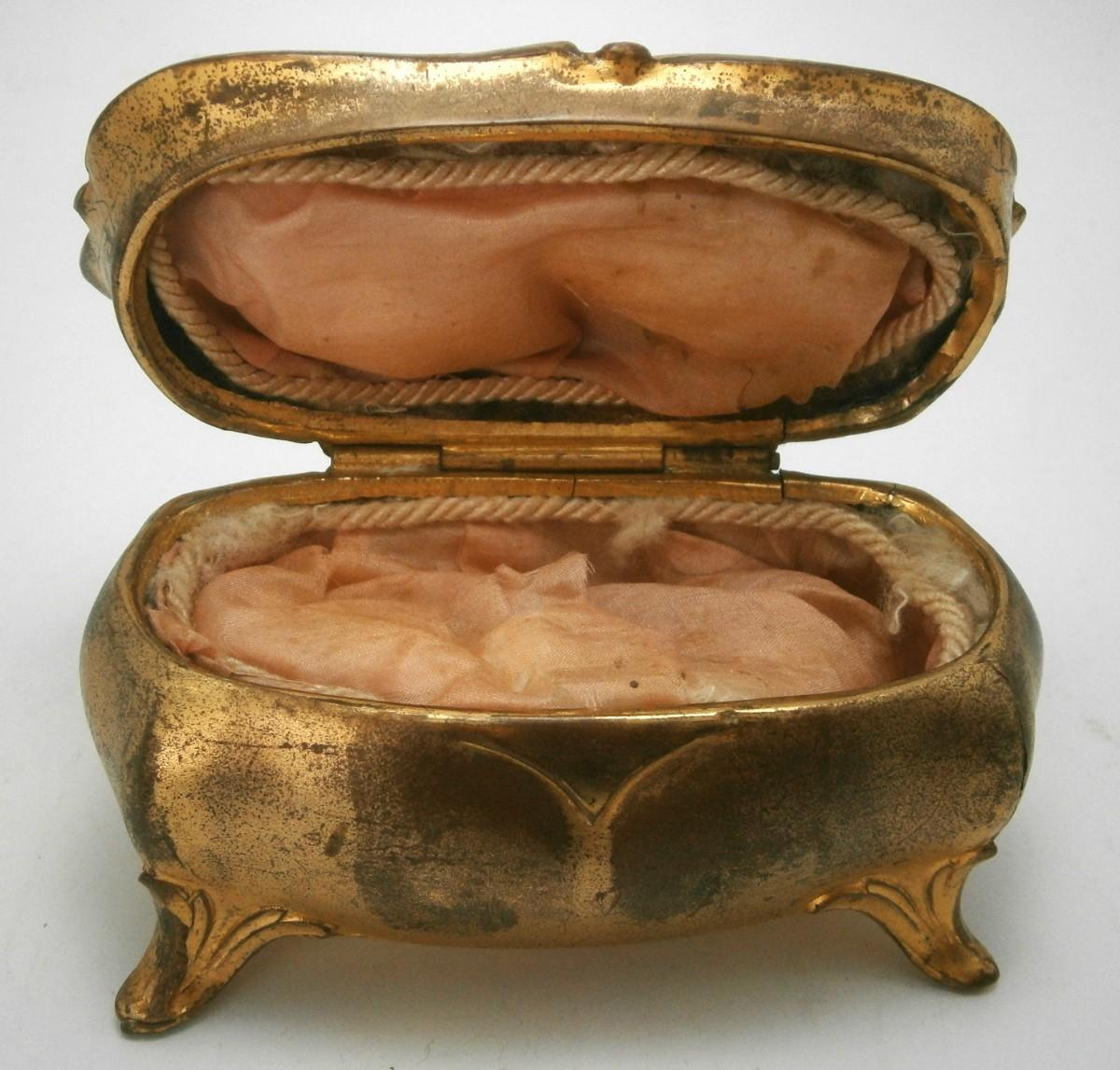 Antique Art Nouveau Gilded Jewelry Casket Trinket Box by Jennings Brothers. 2 in. tall x 3 3/4 in. wide, white metal with gold finish, silk lining (frayed).