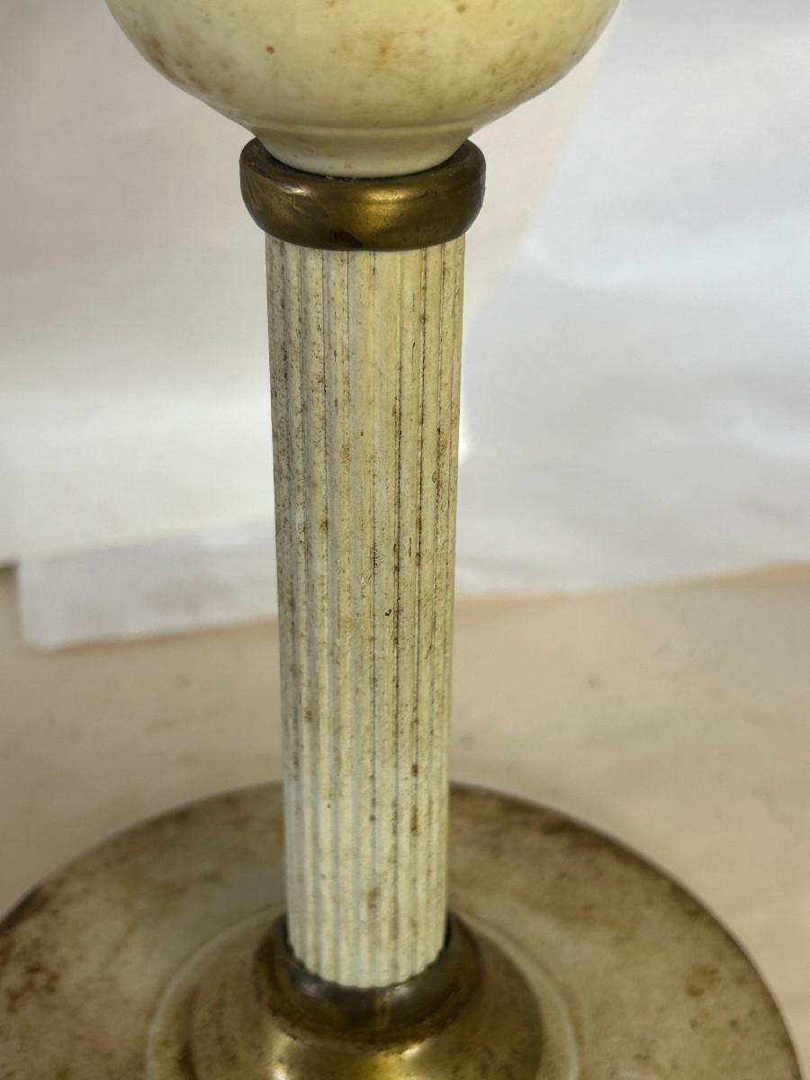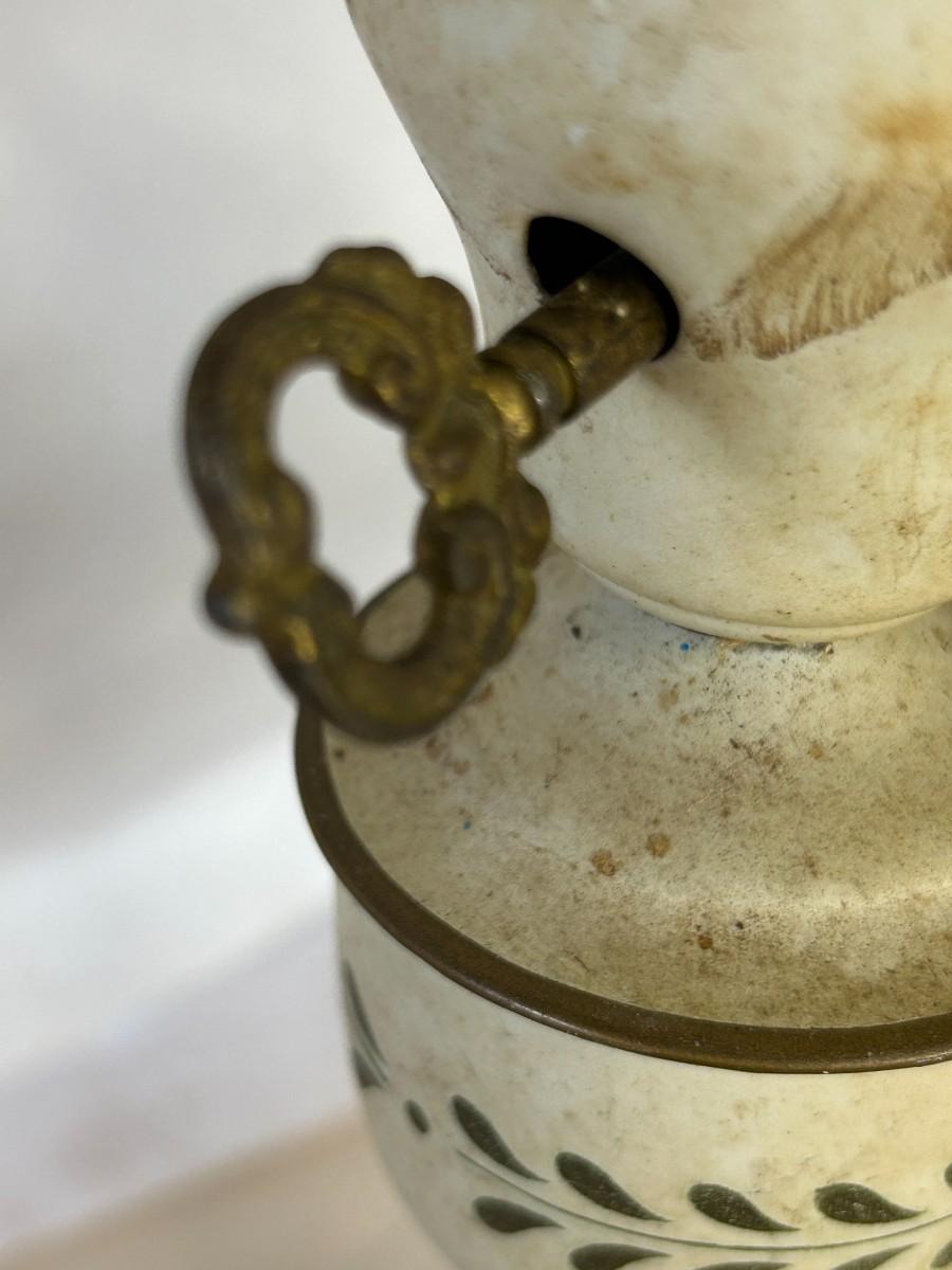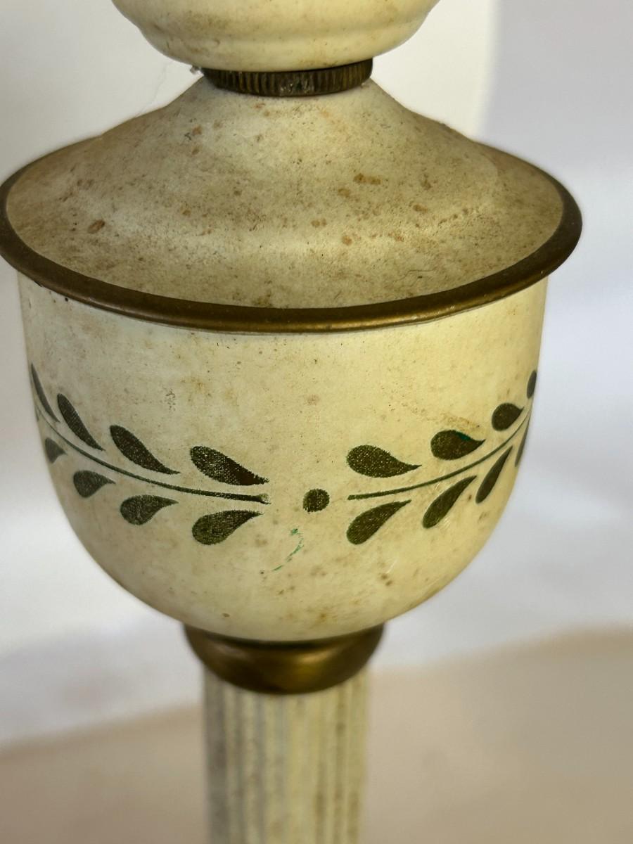 The metal bedroom lamp has a beautiful leaf design that remains lovely. The entire lamp will need restoration as oxidation and age have taken their toll on this beauty. The Greek Key turns perfectly.