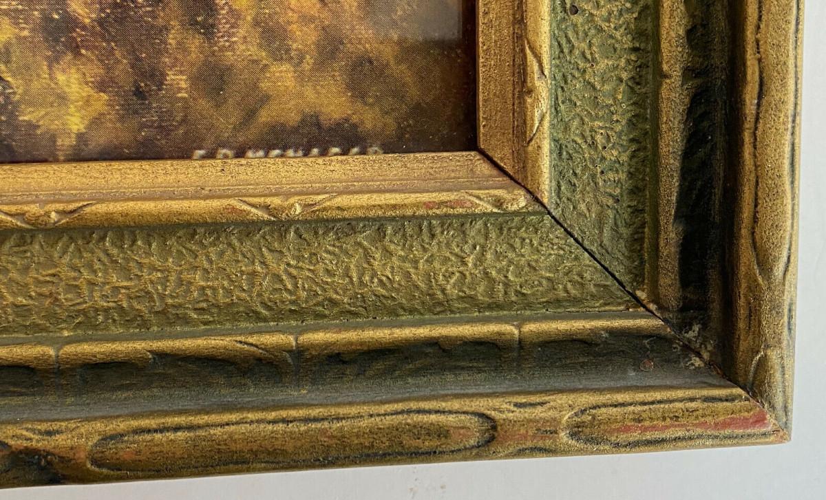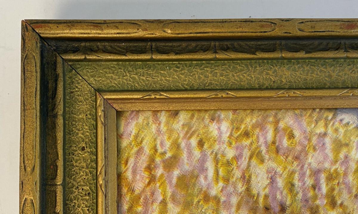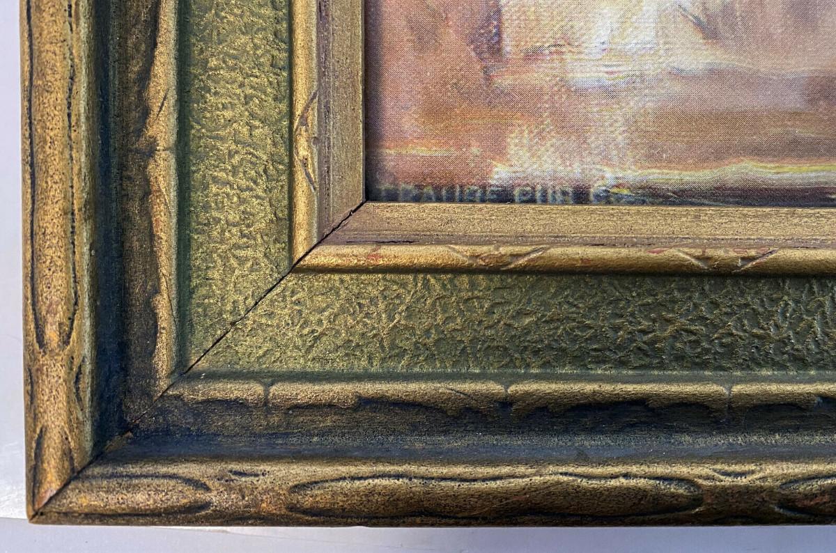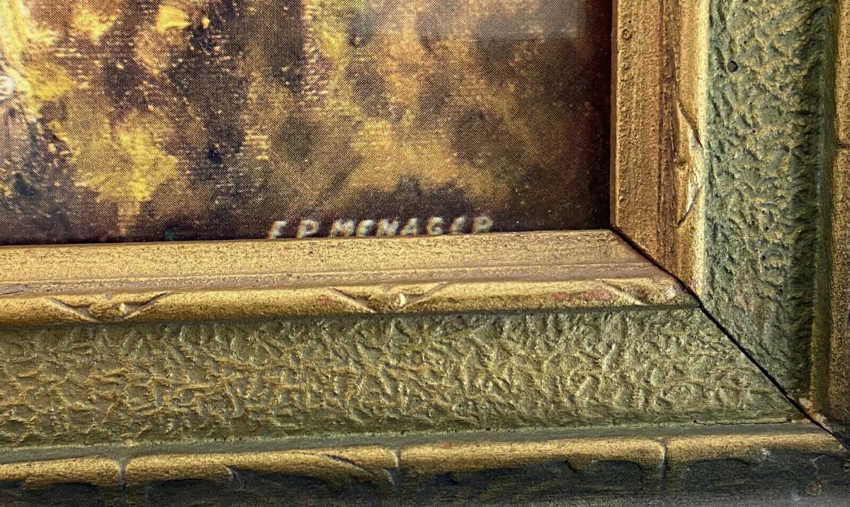 Here is a framed lithograph print from early in the twentieth century...This mythical landscape in the style of R. Atkinson Fox or Maxfield Parrish is signed in print E.P. MEMAGER...and the TRAUBE PUB. CO....I have found scant information on the artist or the publisher? Marvelous period frame measures 18.5 x 12.5"...some light rubbing and normal age wear on frame...the impressionistic image is 15.5 x 9.5"...appears to be original backpaper..As shown...Circa 1920's...Note some reflection. Photographed through glass...Offered with no reserve...