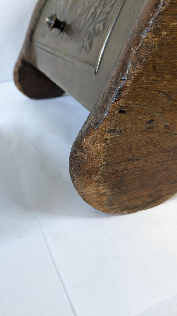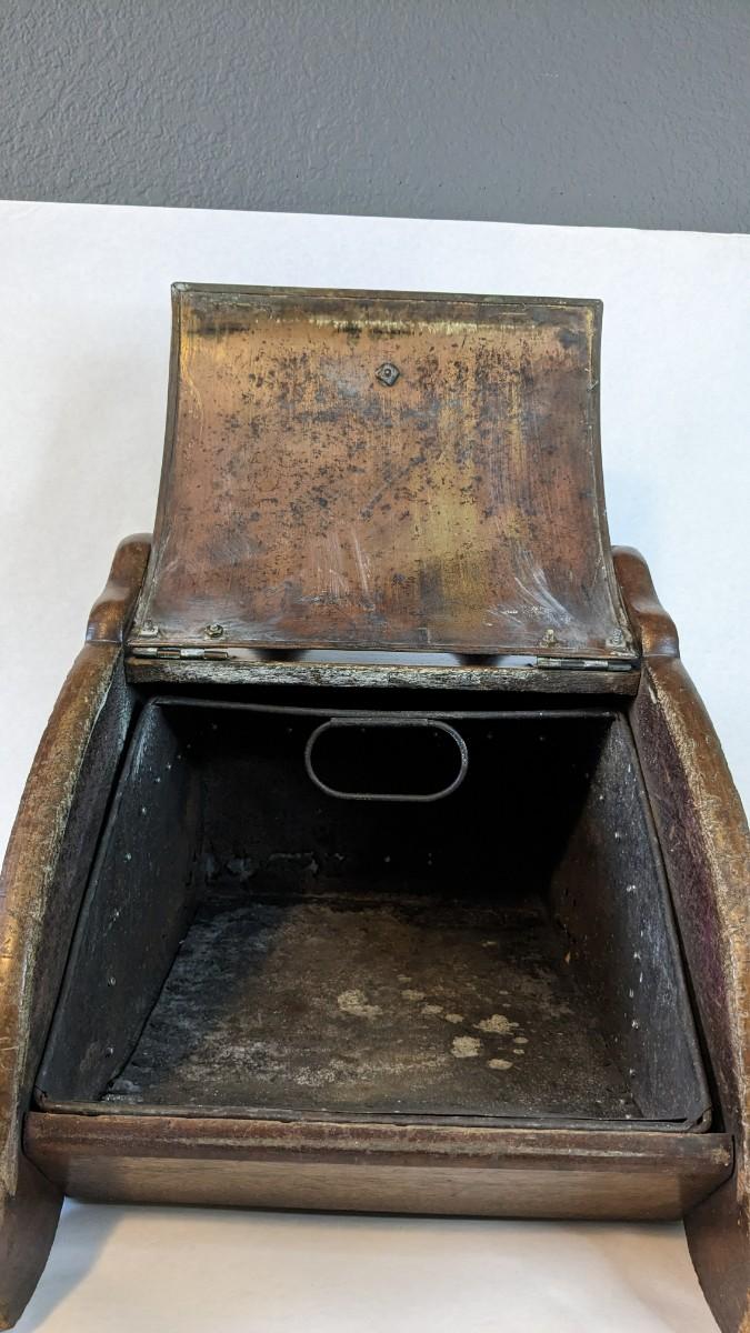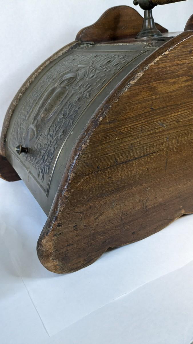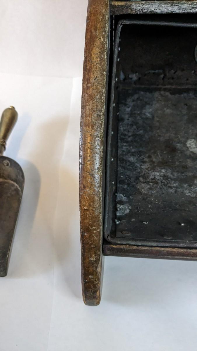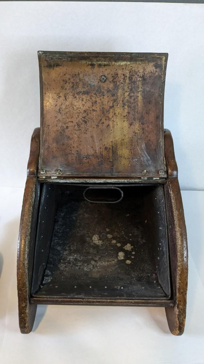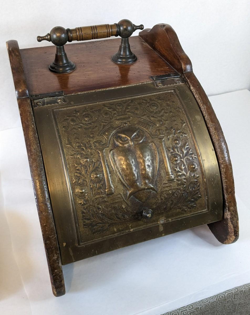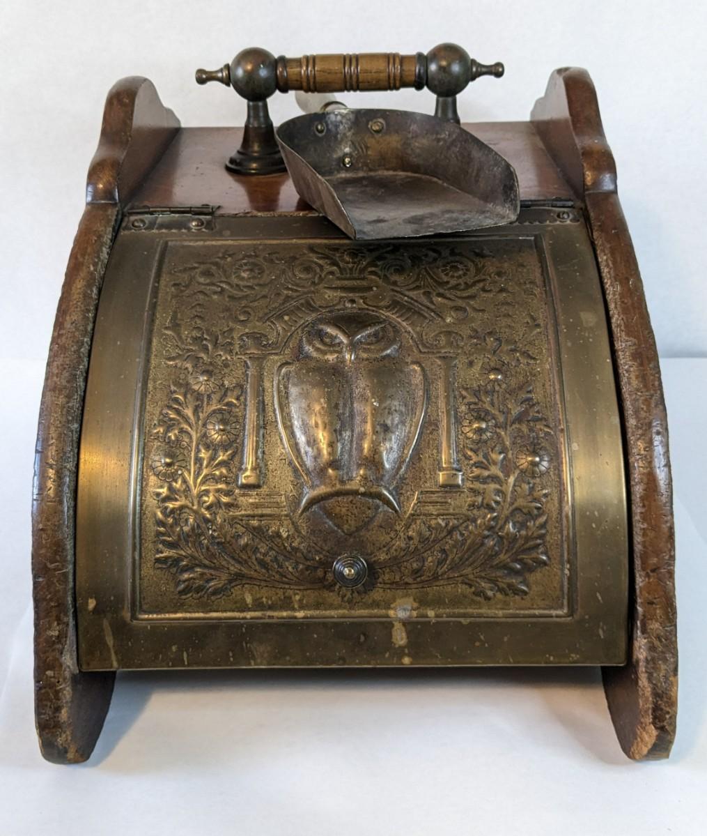 18 5/8"x13.5"x13.5". This beautiful and very rare find features a stunning owl surrounded by arches and foliage stamped into a brass panel. Set into a solid wood frame that is lined with metal for easy coal storage and access. All original with wear showing thoughout the piece. Please note cracking at hinges, various gouges and wear to wood as well as worn edge to scoop.