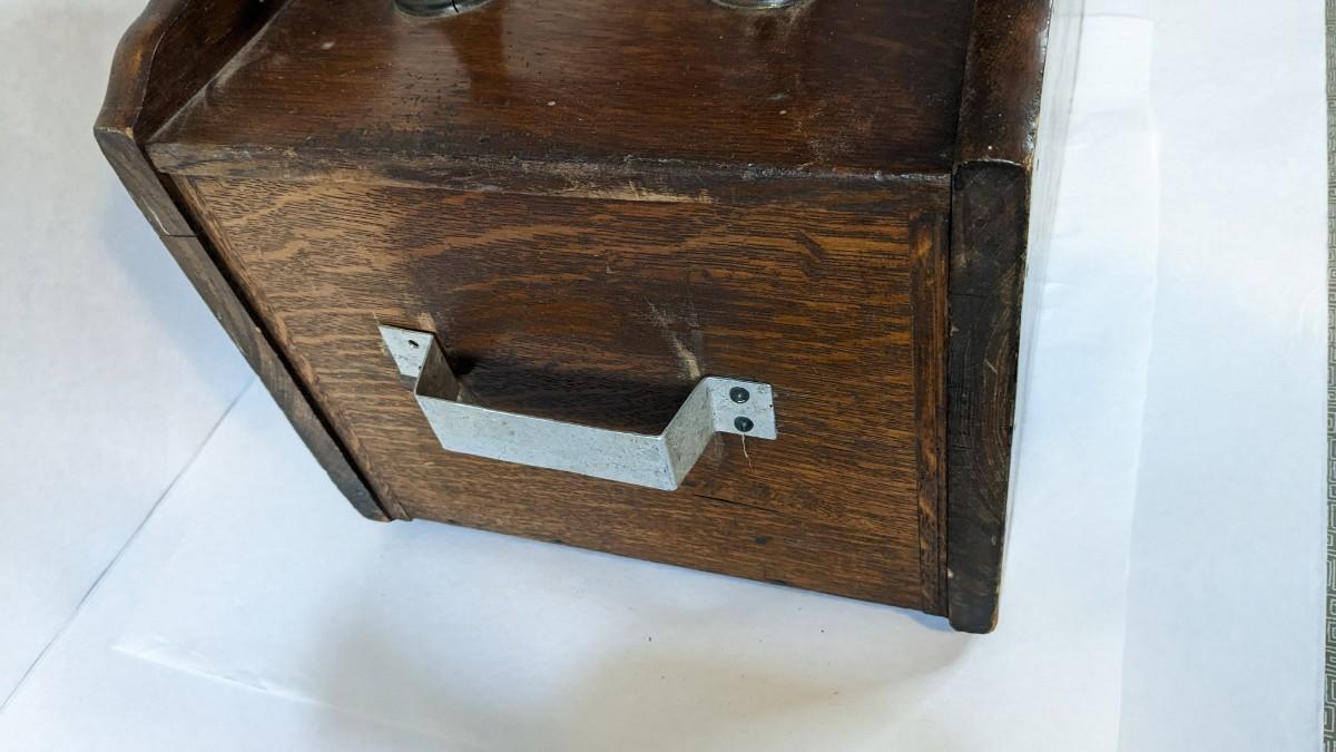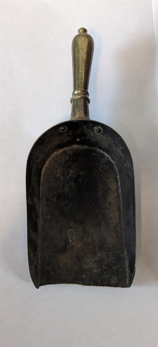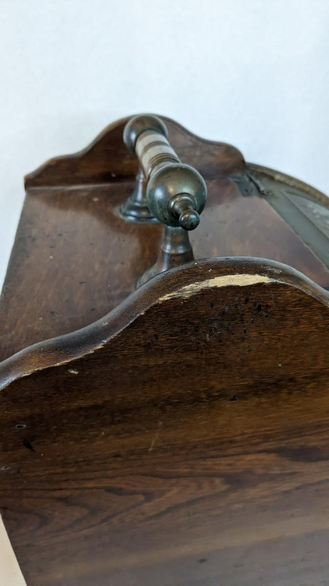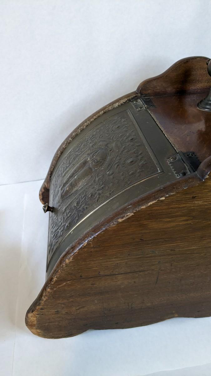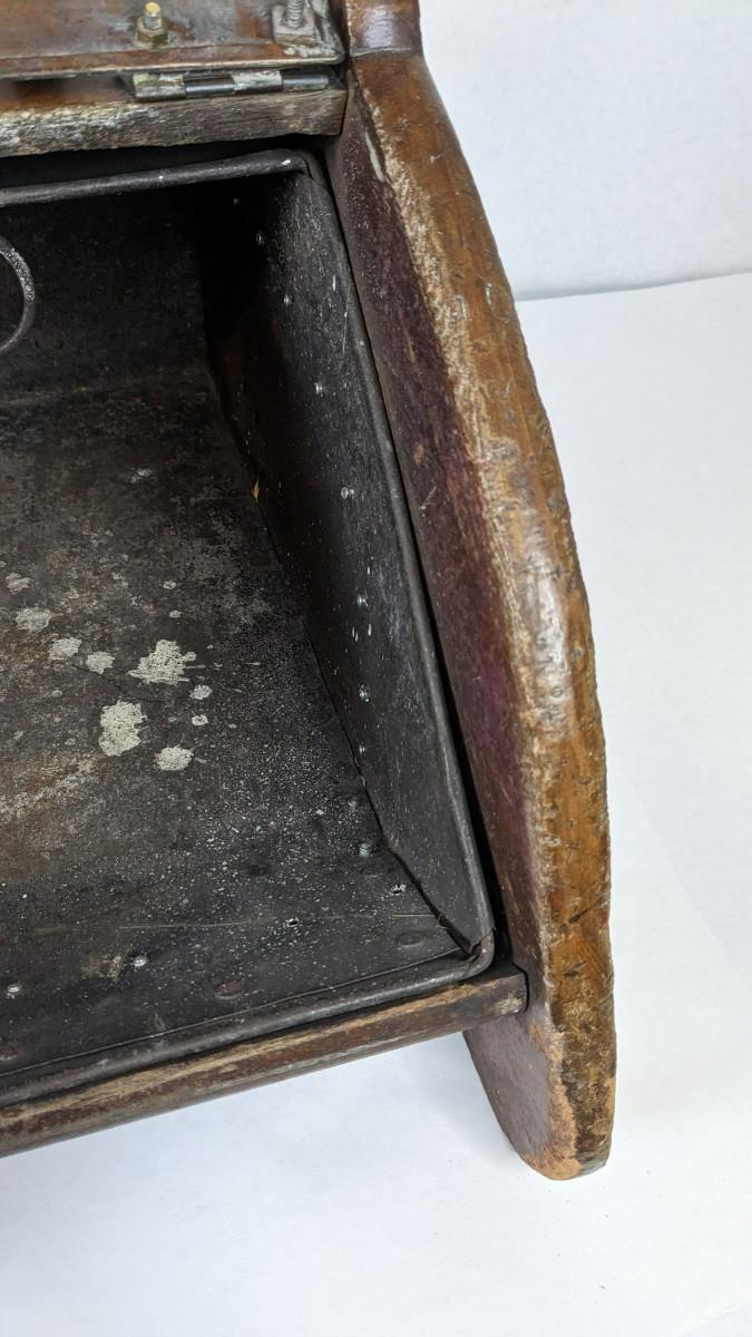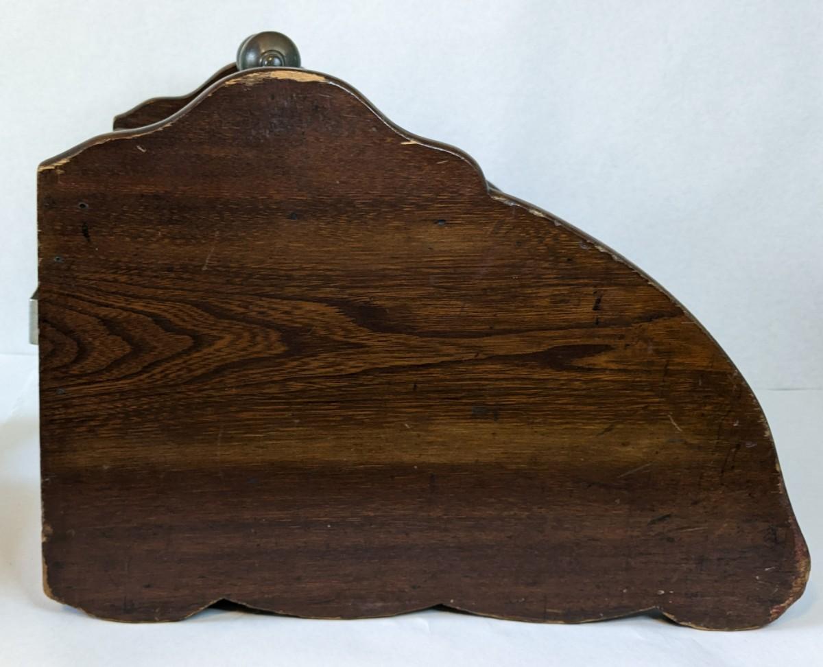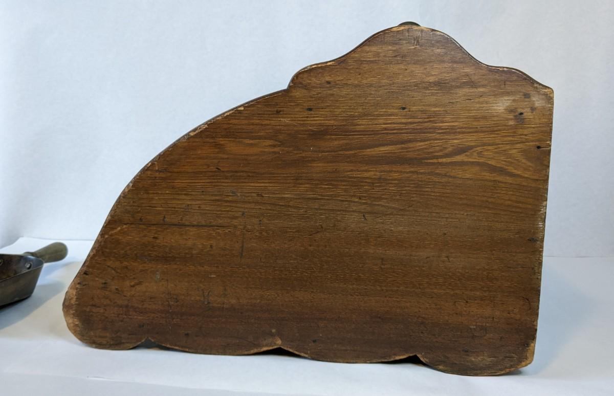 18 5/8"x13.5"x13.5". This beautiful and very rare find features a stunning owl surrounded by arches and foliage stamped into a brass panel. Set into a solid wood frame that is lined with metal for easy coal storage and access. All original with wear showing thoughout the piece. Please note cracking at hinges, various gouges and wear to wood as well as worn edge to scoop.