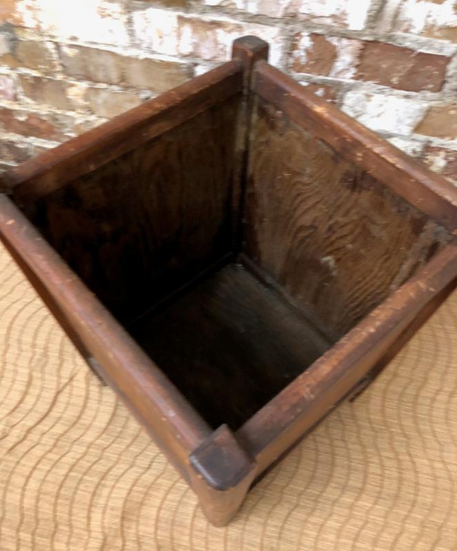 Here is an antique wooden Mission style wastepaper basket...Some age and use wear on finish..still solid..14" high by 12" wide...