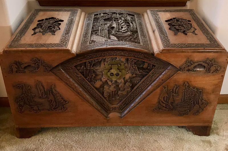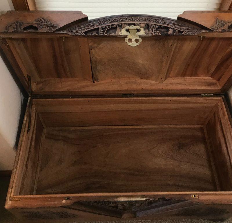 Brass latch, clean interior. Ring wear and 8 inch crack at top of chest, otherwise in very good condition.