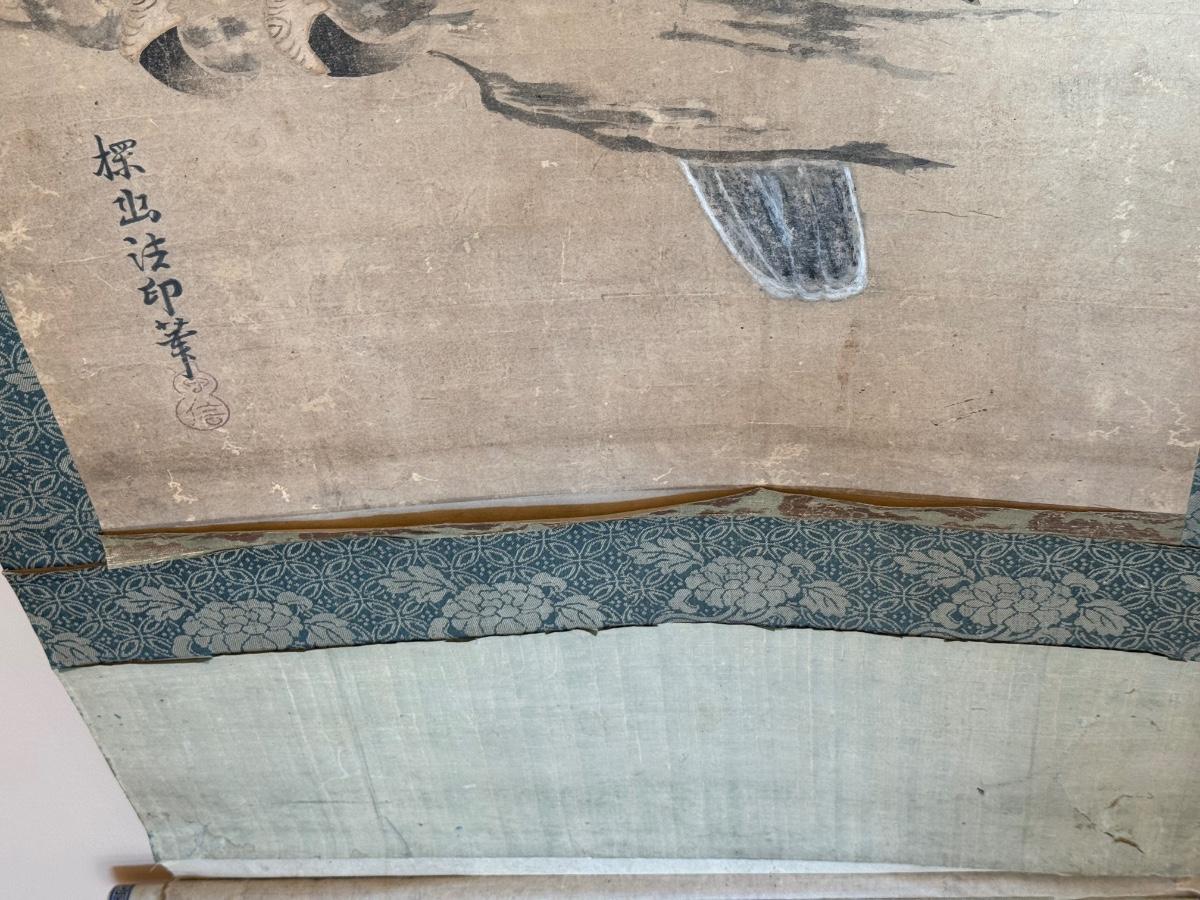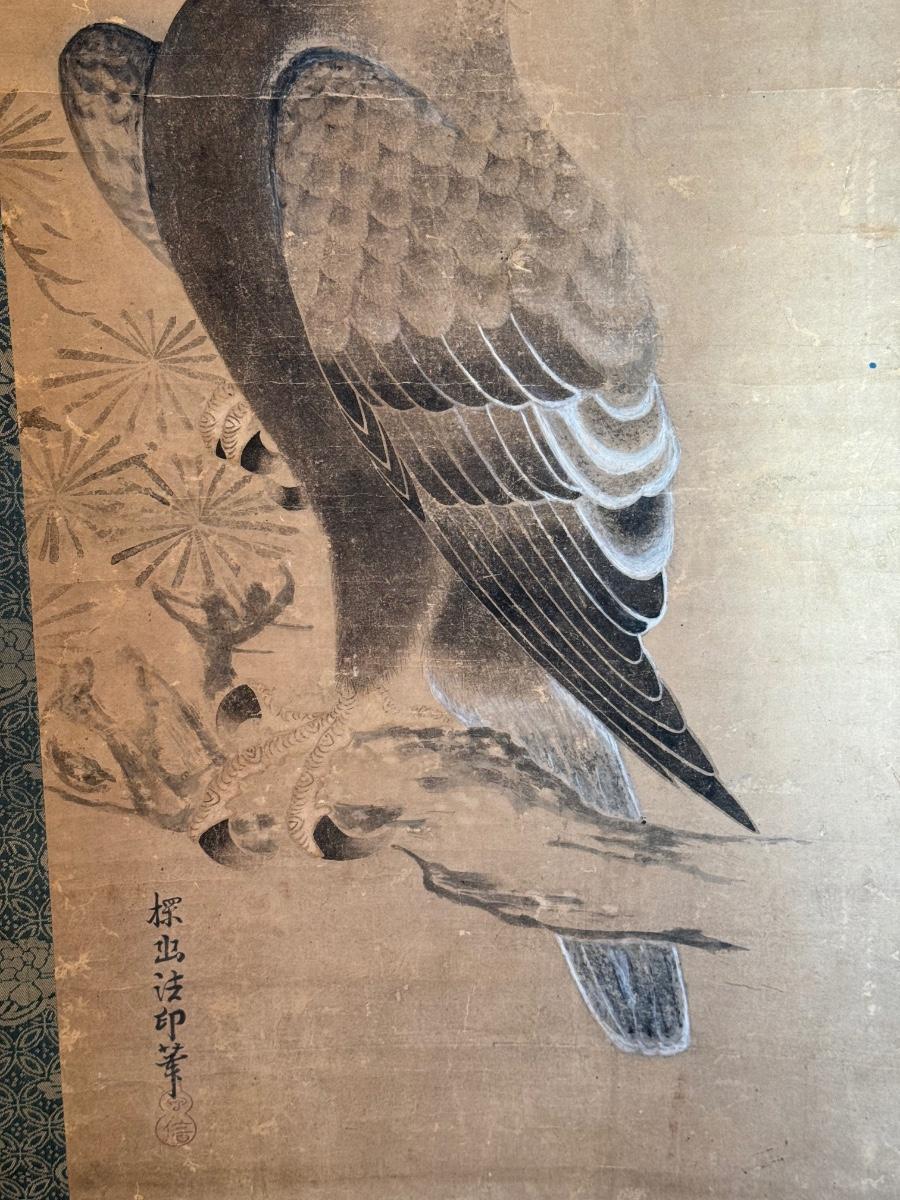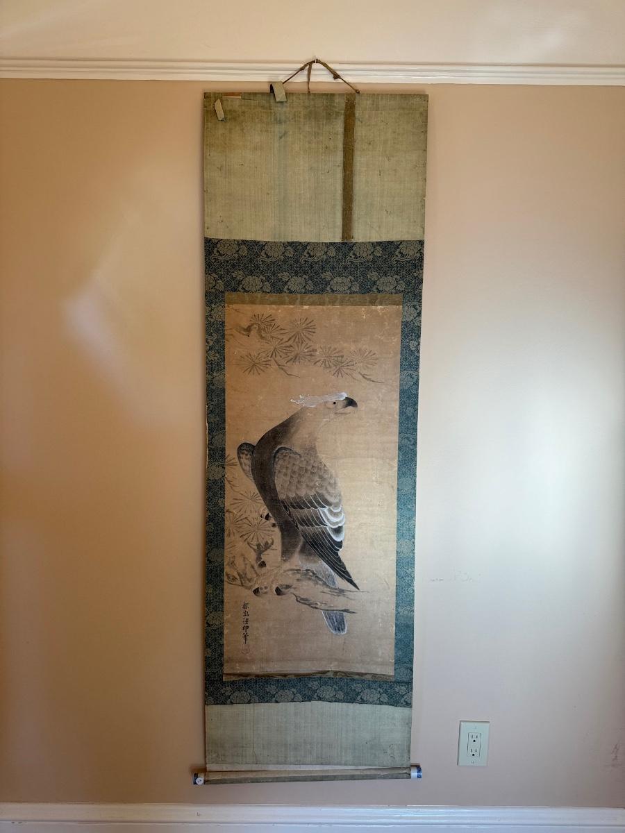 Antique Asian scroll, Hawk/ Eagle, wood box, 70” T x 21” W