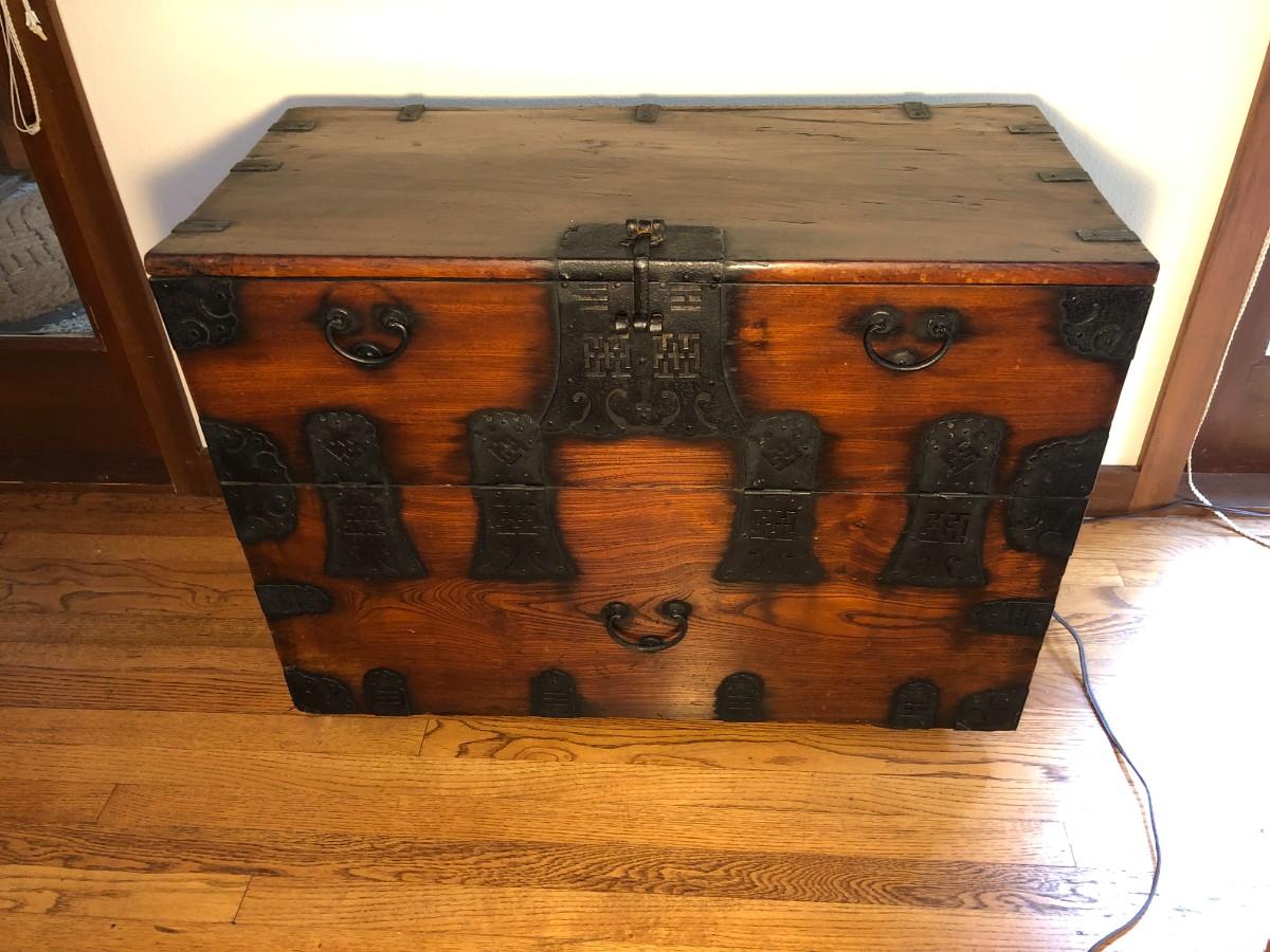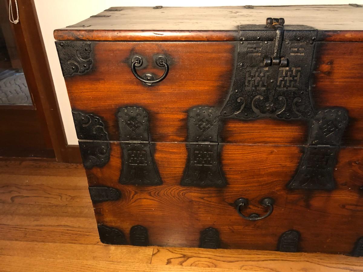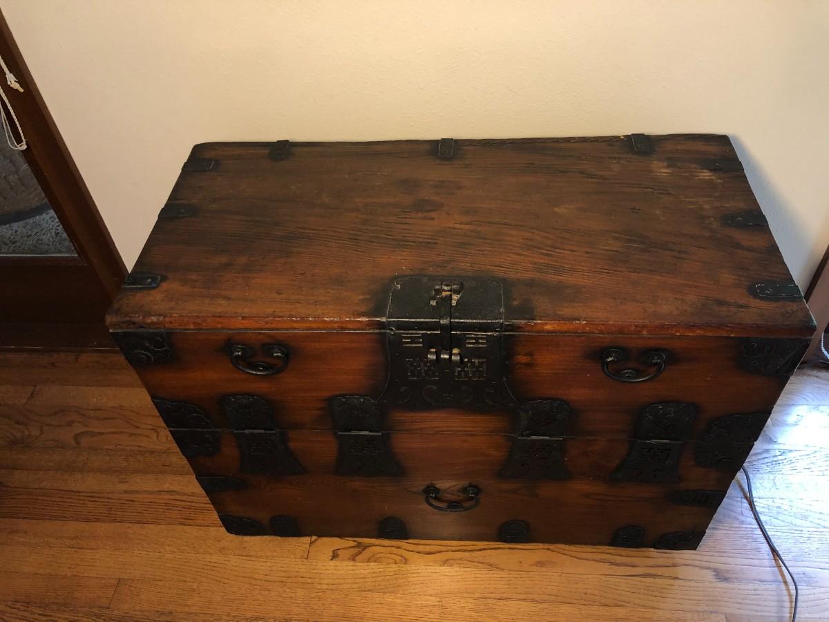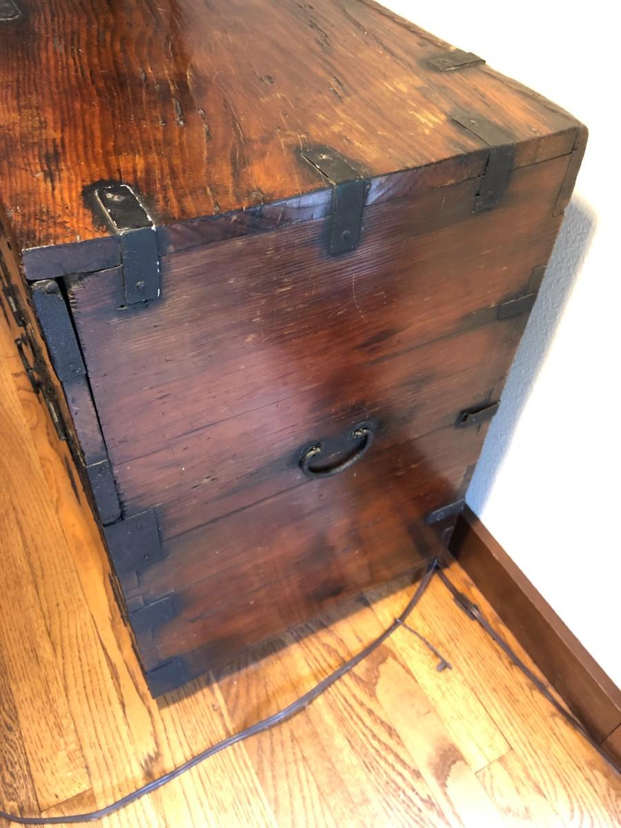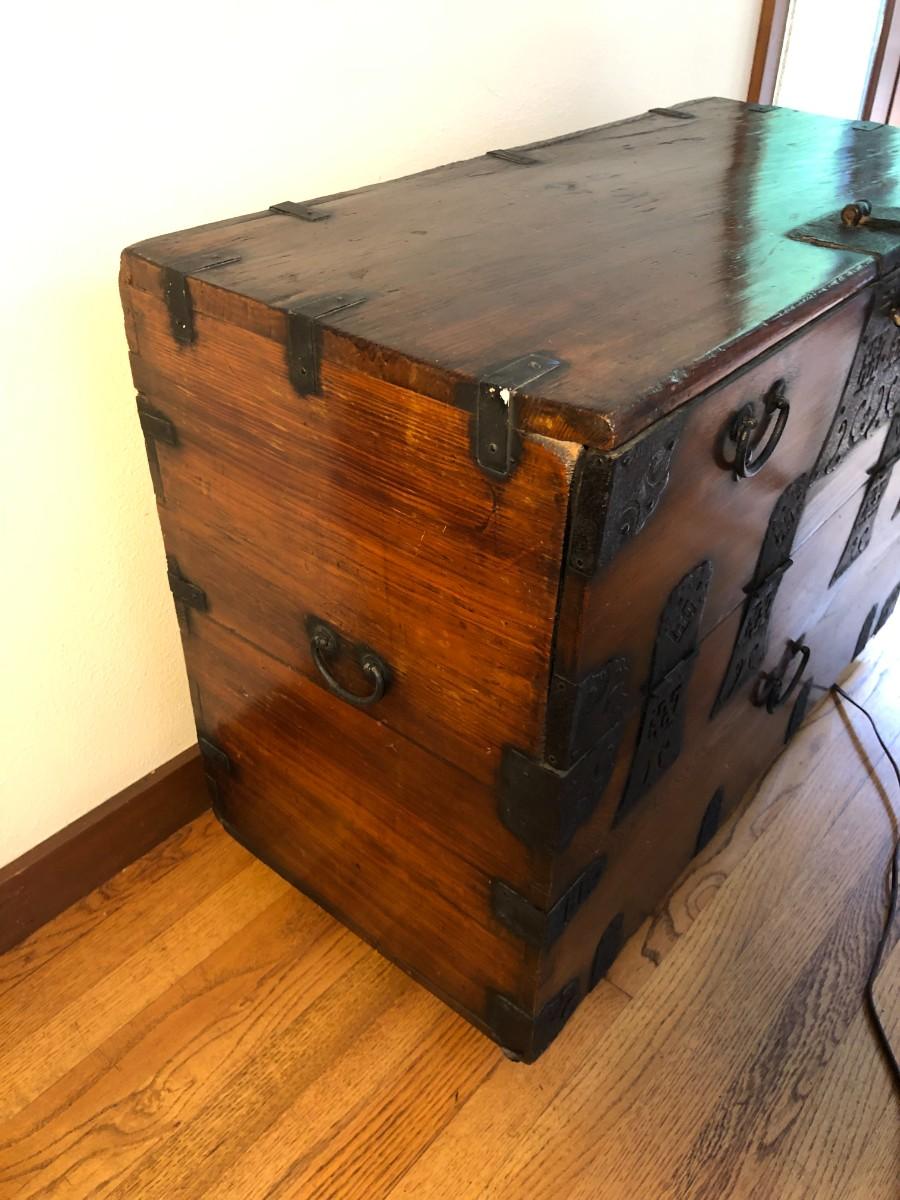 Gorgeous antique wood Japanese Tansu style wood chest. Wood panels and black metal details. In very good condition. One drawer opens into the chest, which is one large compartment.