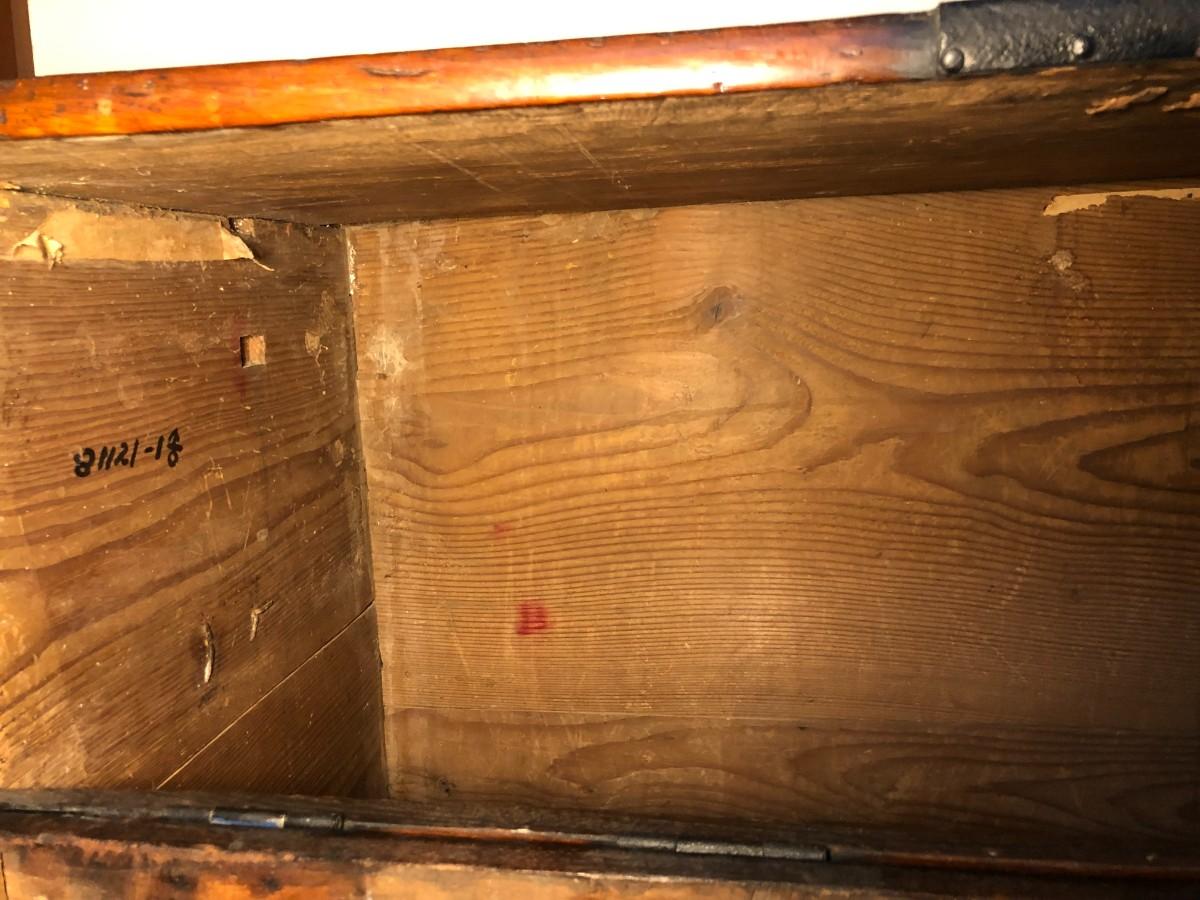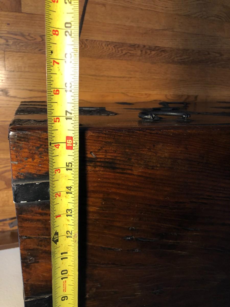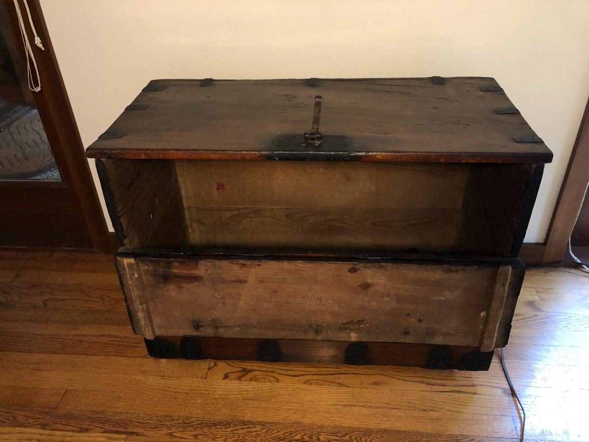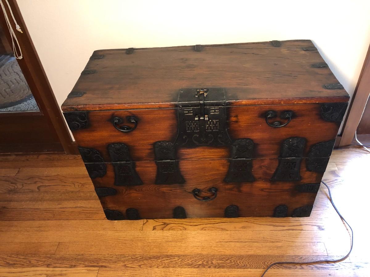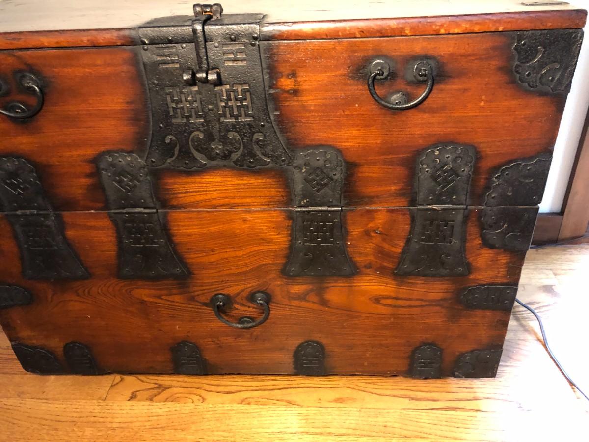 Gorgeous antique wood Japanese Tansu style wood chest. Wood panels and black metal details. In very good condition. One drawer opens into the chest, which is one large compartment.