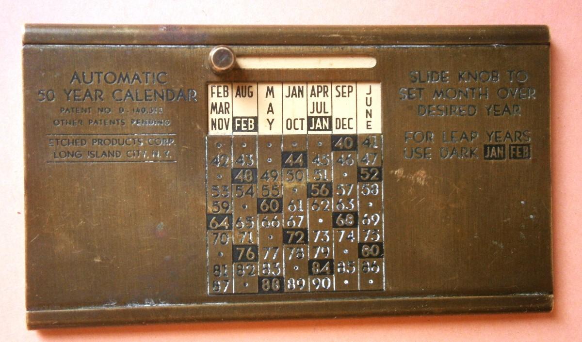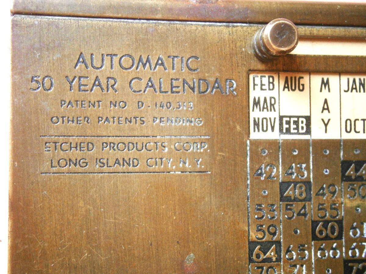 Antique "AUTOMATIC 50 YEAR CALENDAR" by Etched Products Corp., Long Island City, N.Y., from the early 1900's, 3 34 x 2 1/8 in., brass with paper calendar