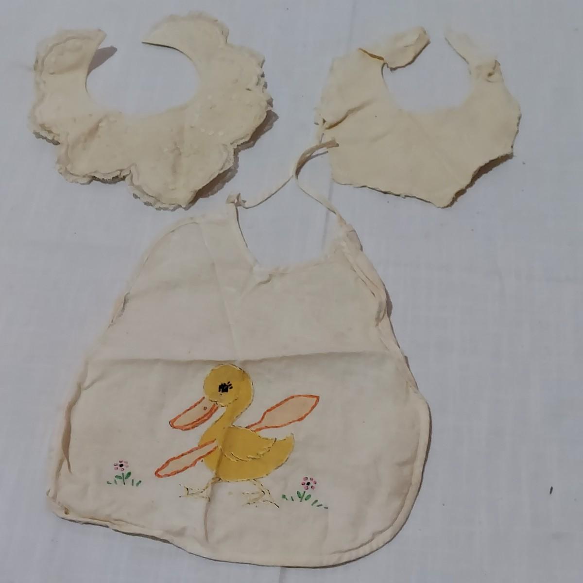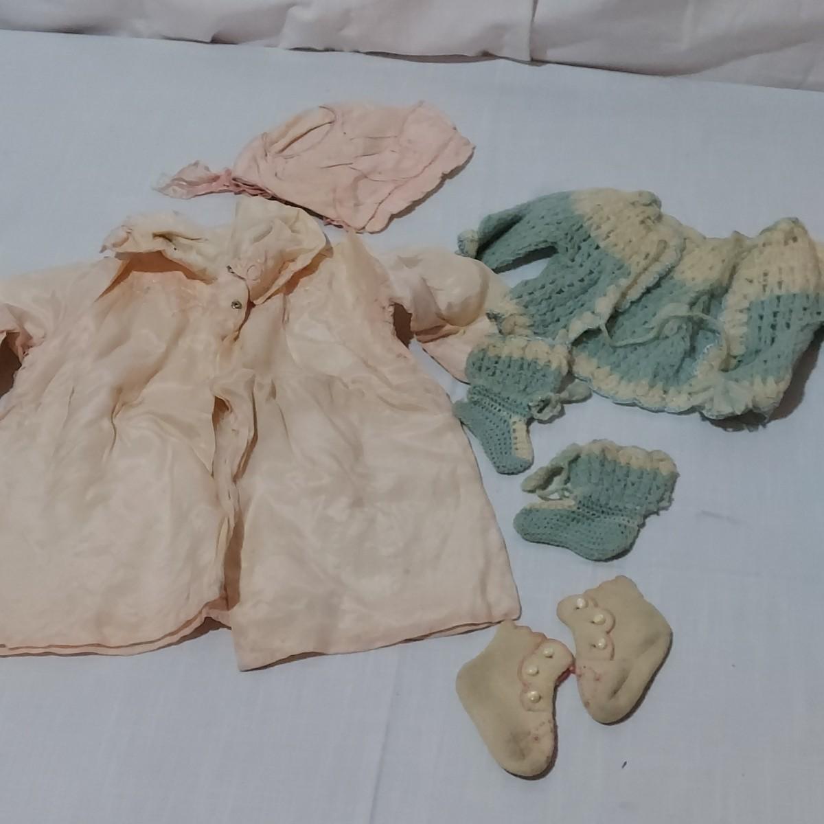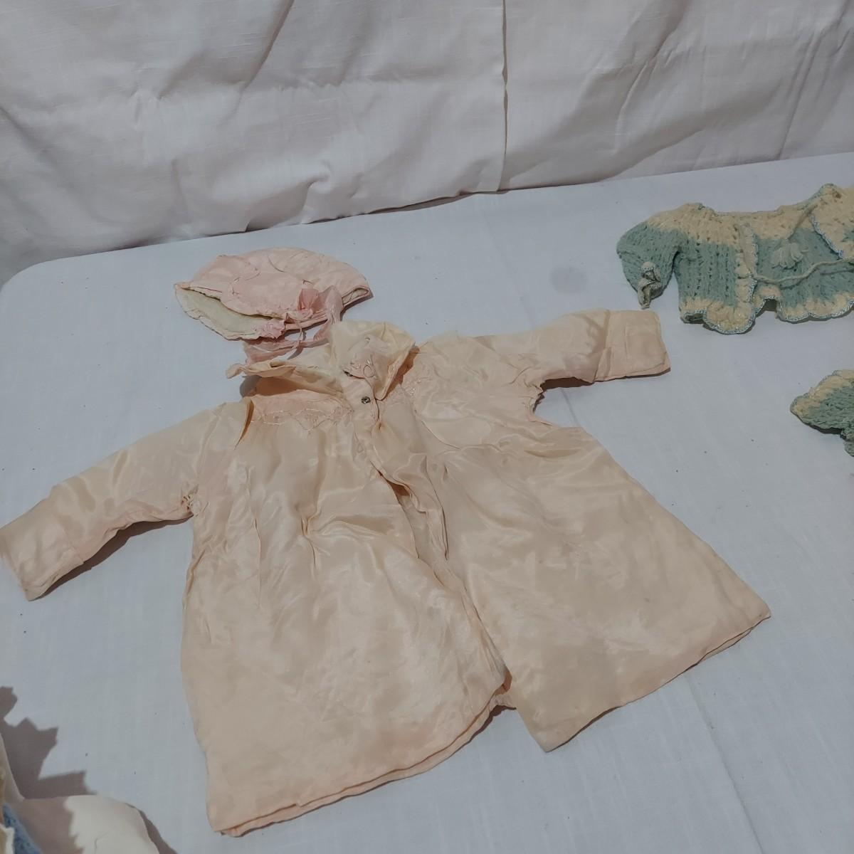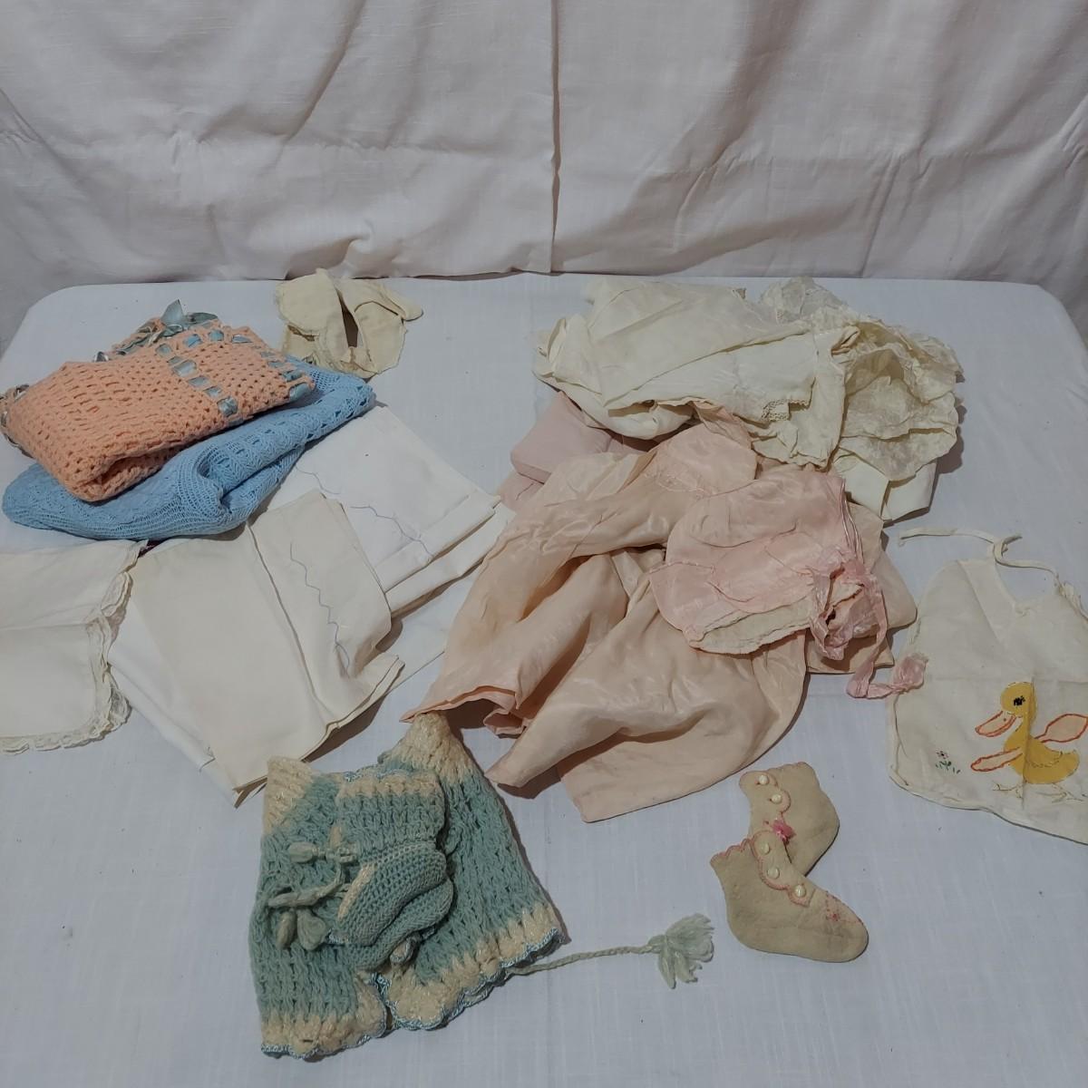 Several pieces of antique and vintage baby clothing including sleeping gowns, cardigans, bibs, bonnets and more. Also includes crib bedding. Items have condition issues due to age. Please see photos for details. Shipping available