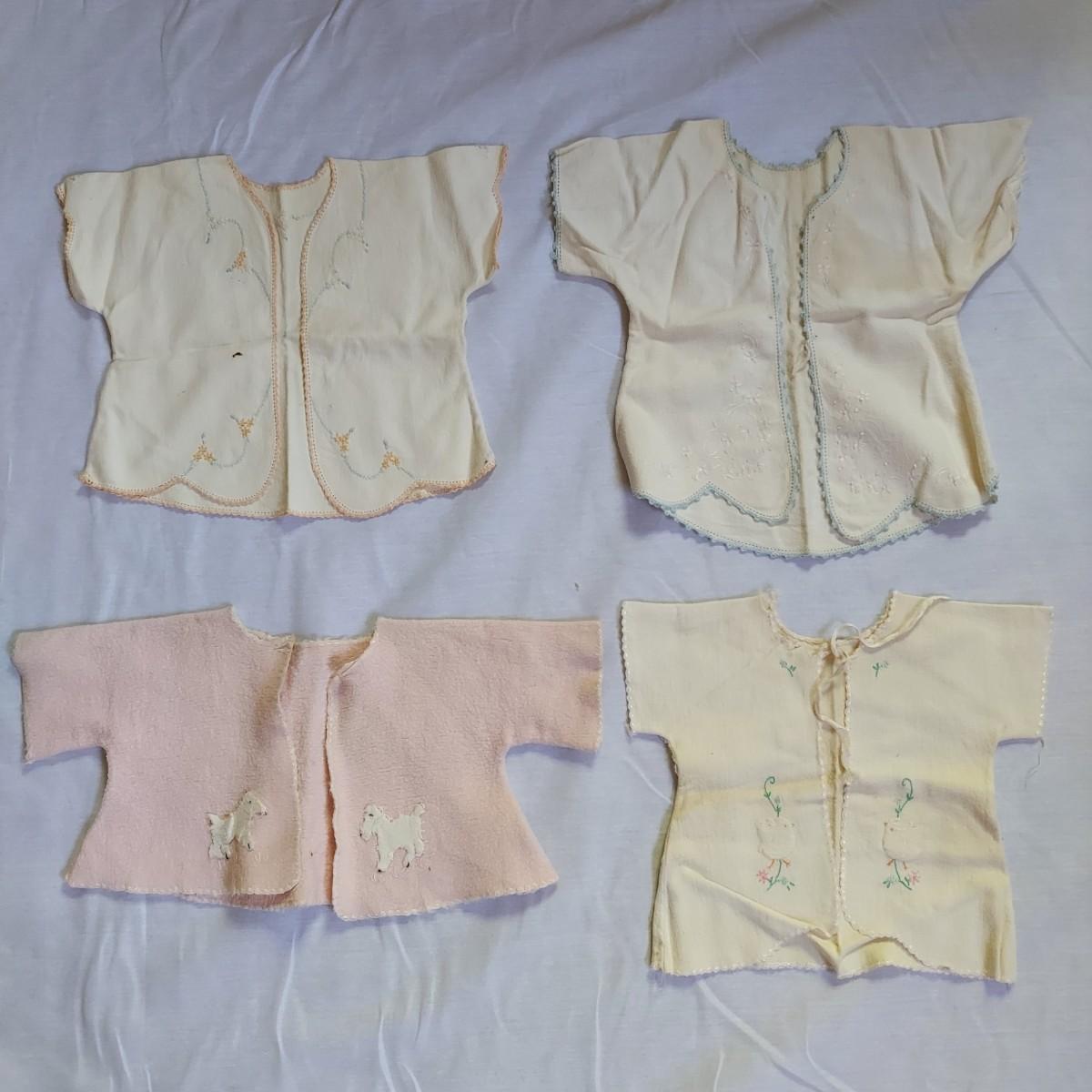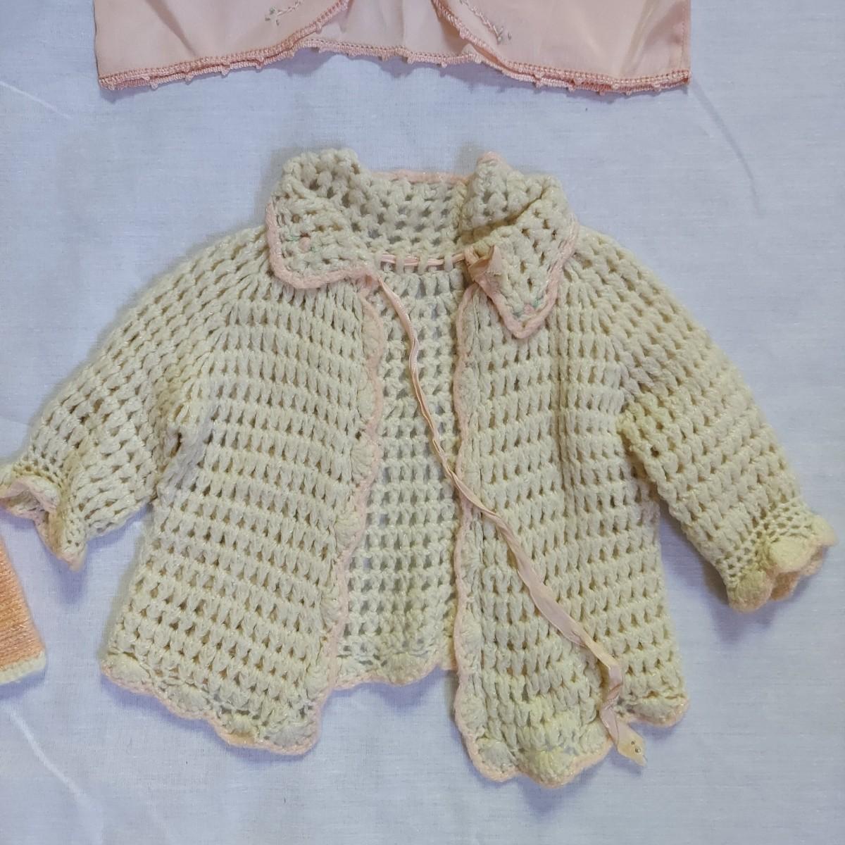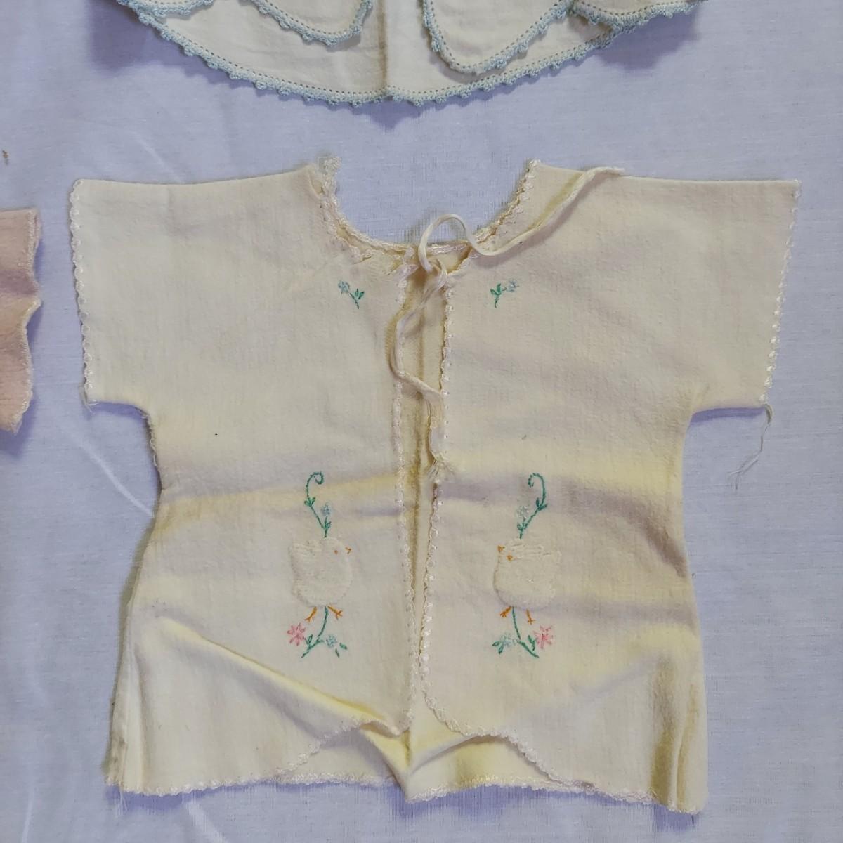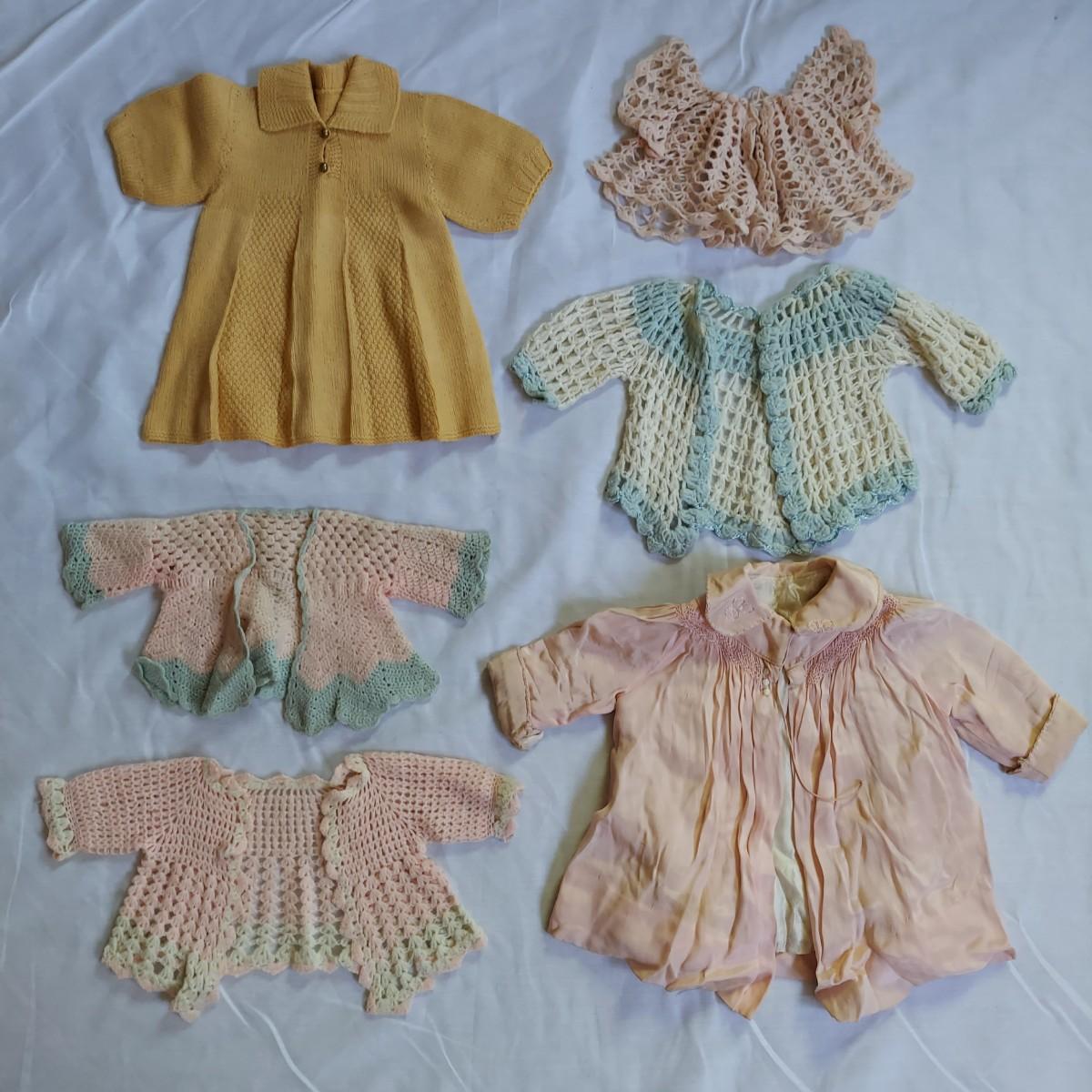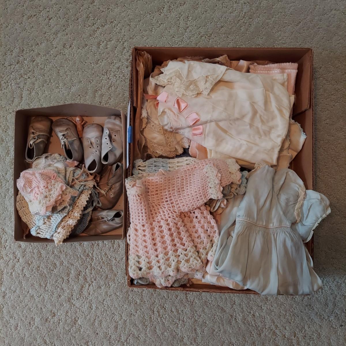 Near antique, vintage baby clothing. These items are likely from the 1930s. Lot includes many silk, knitted and flannel clothing pieces. Plus multiple baby shoes, knitted booties, bonnets and collars. There are some overall stains and holes due to age of items. Shipping available.