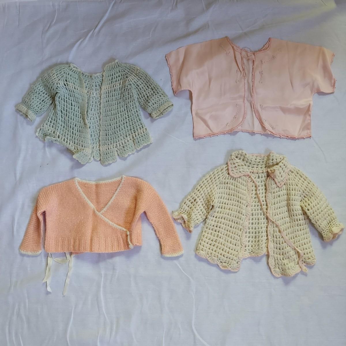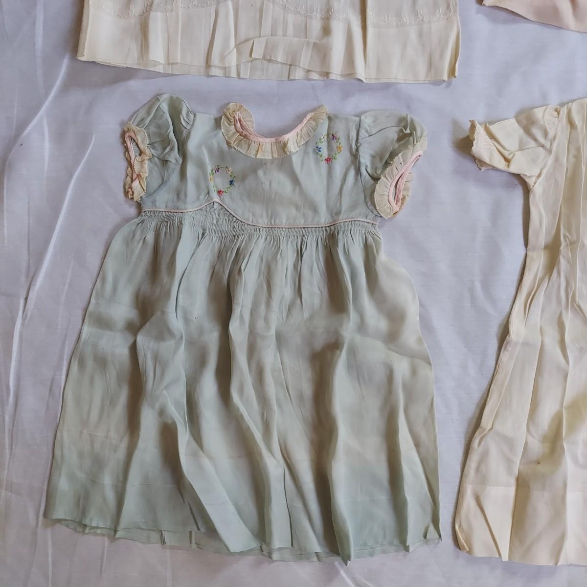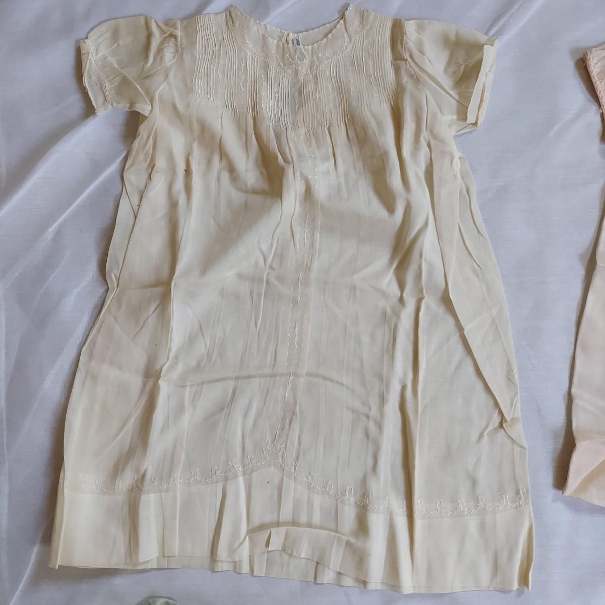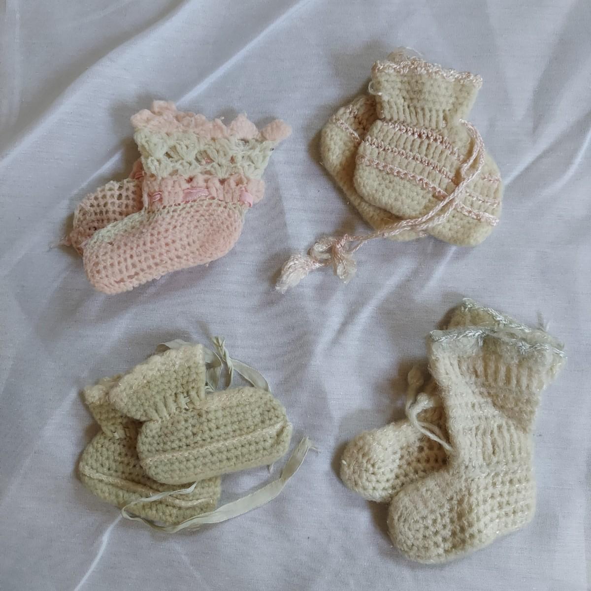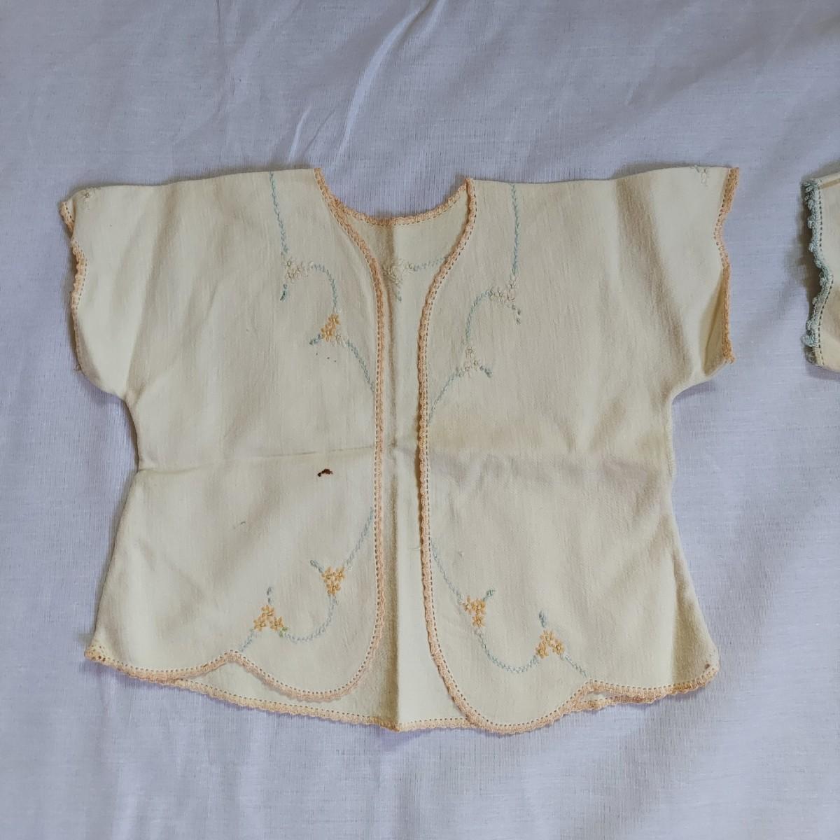 Near antique, vintage baby clothing. These items are likely from the 1930s. Lot includes many silk, knitted and flannel clothing pieces. Plus multiple baby shoes, knitted booties, bonnets and collars. There are some overall stains and holes due to age of items. Shipping available.