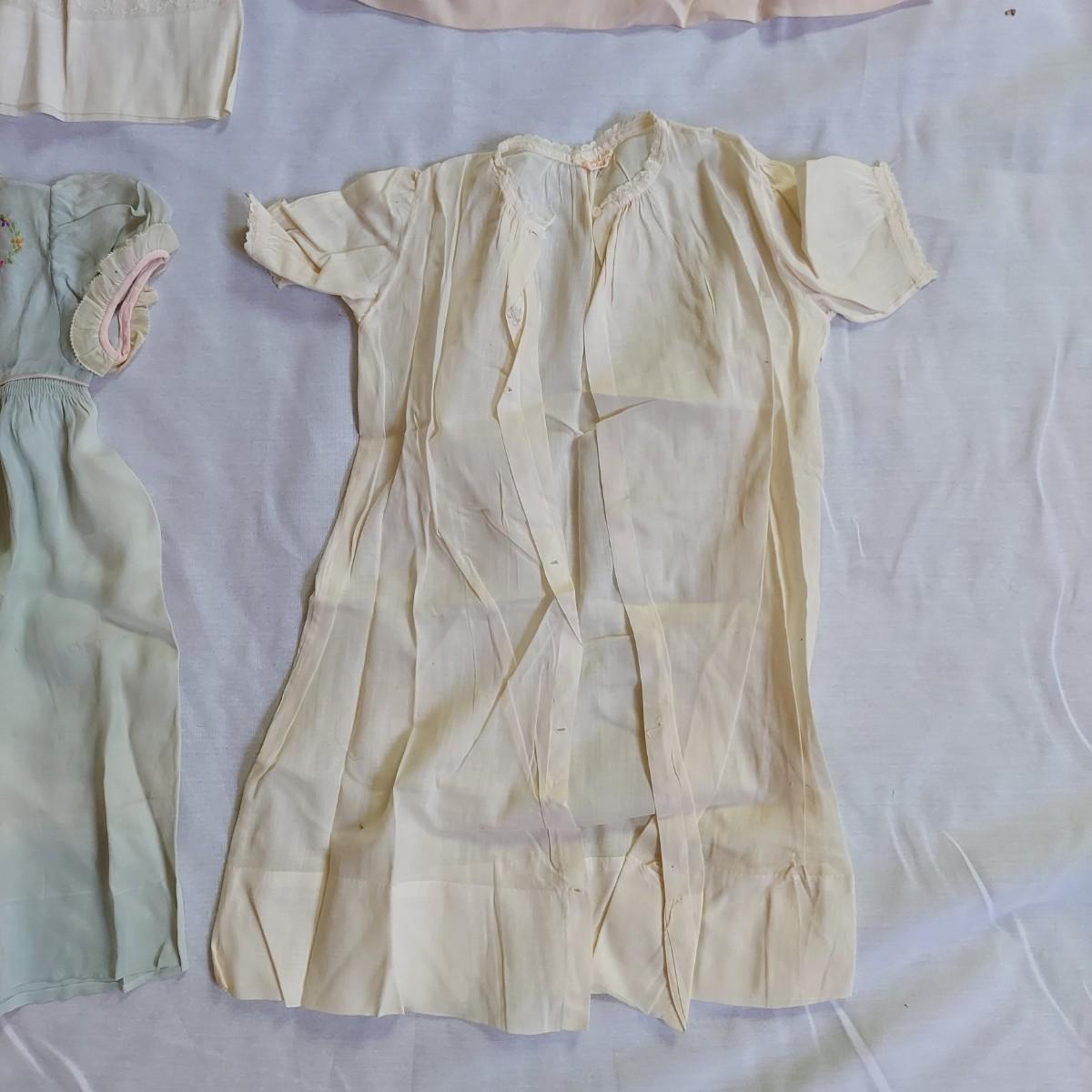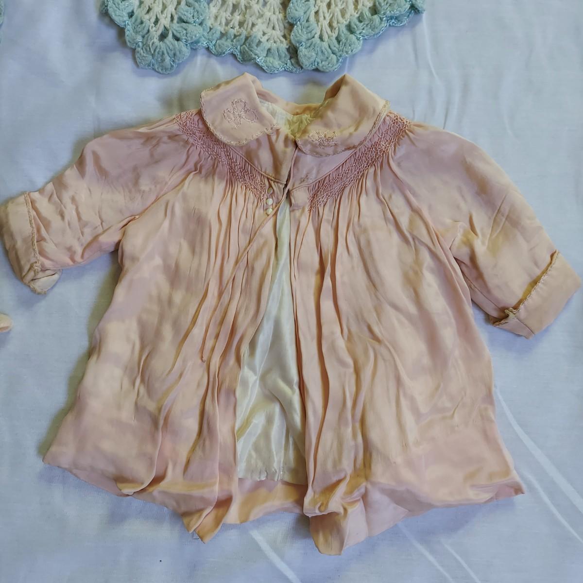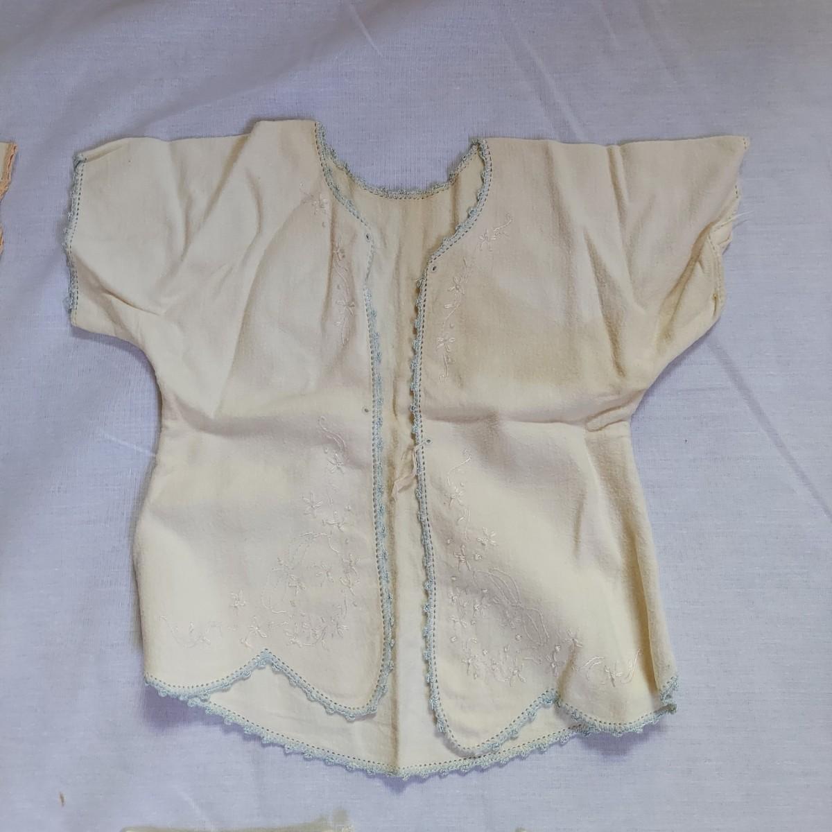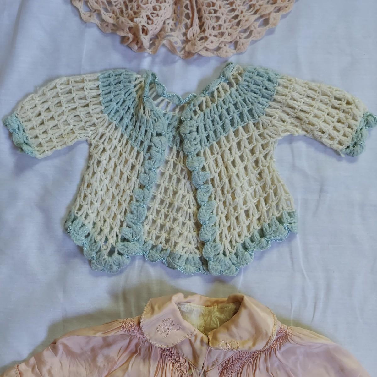 Near antique, vintage baby clothing. These items are likely from the 1930s. Lot includes many silk, knitted and flannel clothing pieces. Plus multiple baby shoes, knitted booties, bonnets and collars. There are some overall stains and holes due to age of items. Shipping available.