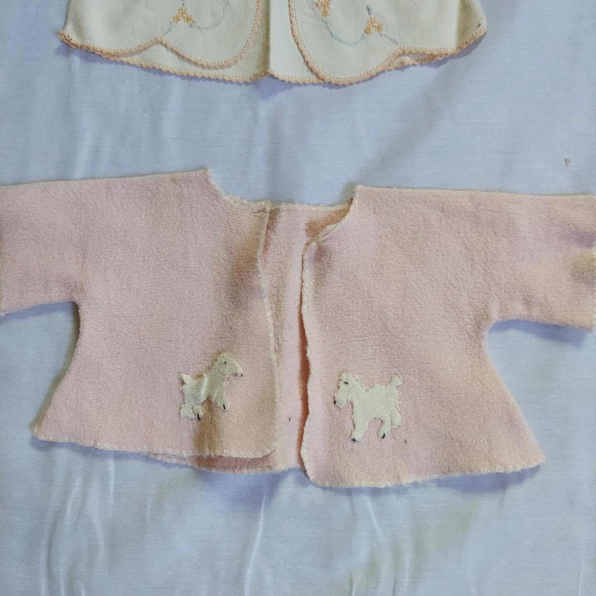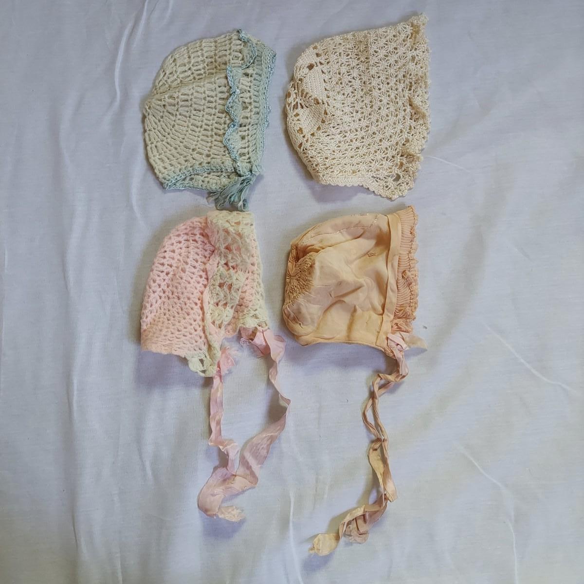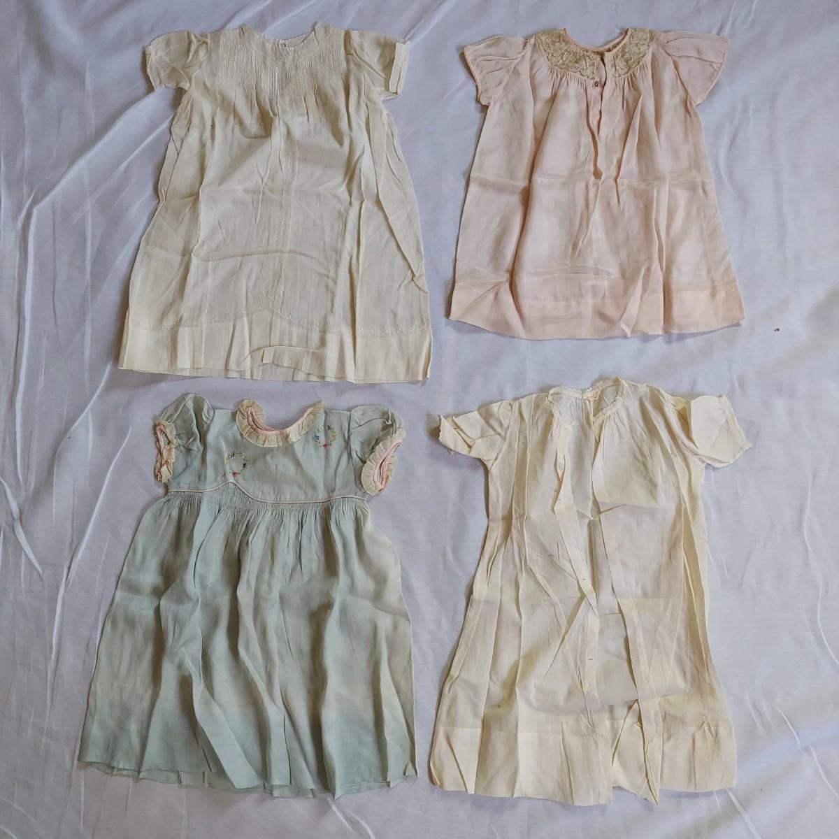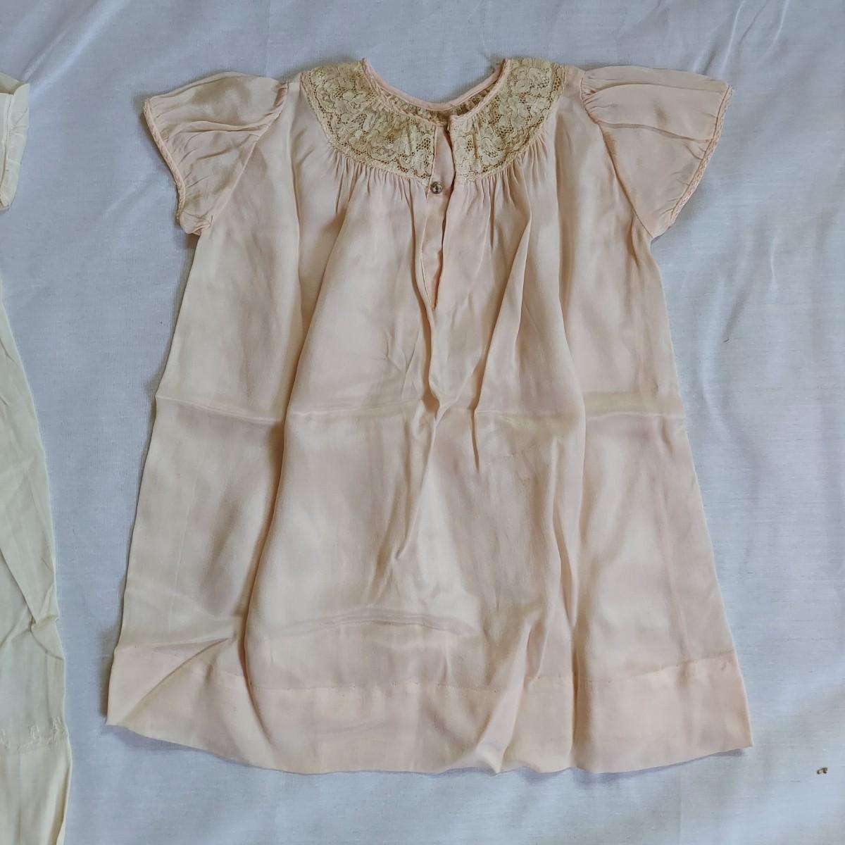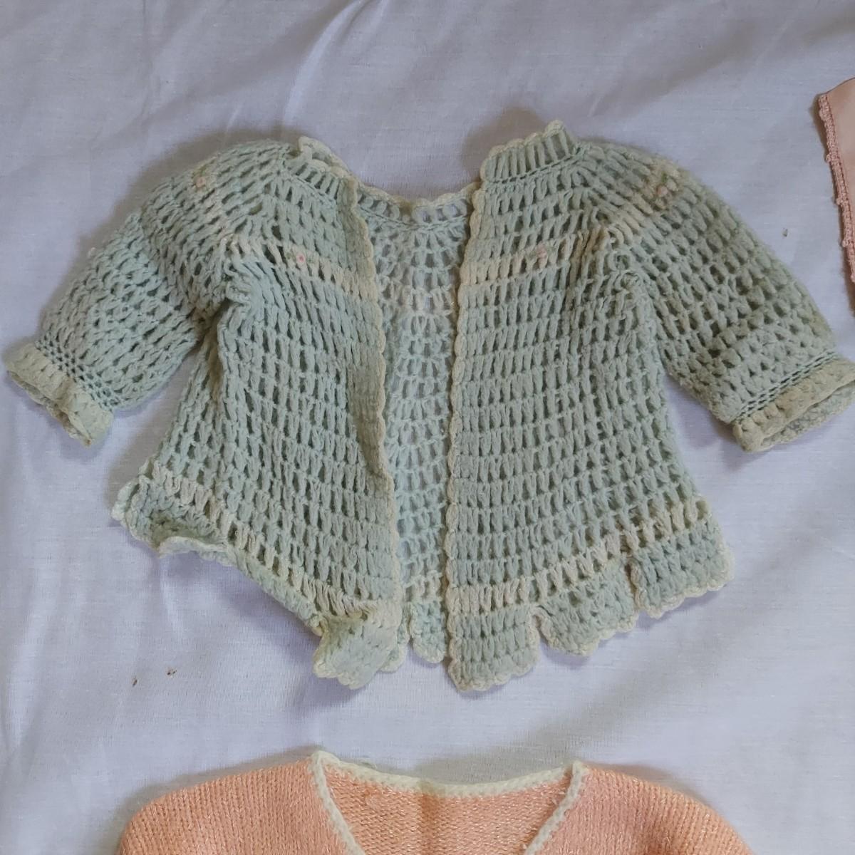 Near antique, vintage baby clothing. These items are likely from the 1930s. Lot includes many silk, knitted and flannel clothing pieces. Plus multiple baby shoes, knitted booties, bonnets and collars. There are some overall stains and holes due to age of items. Shipping available.