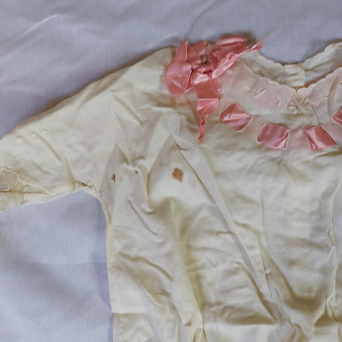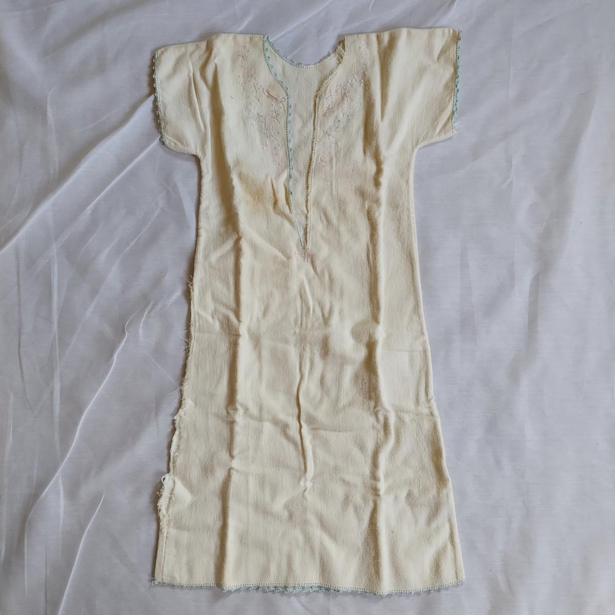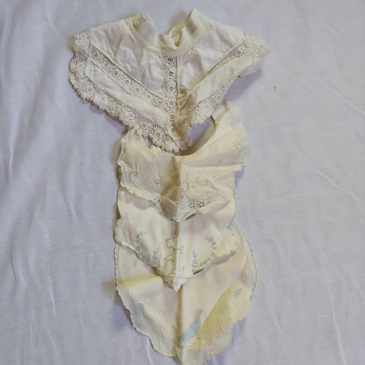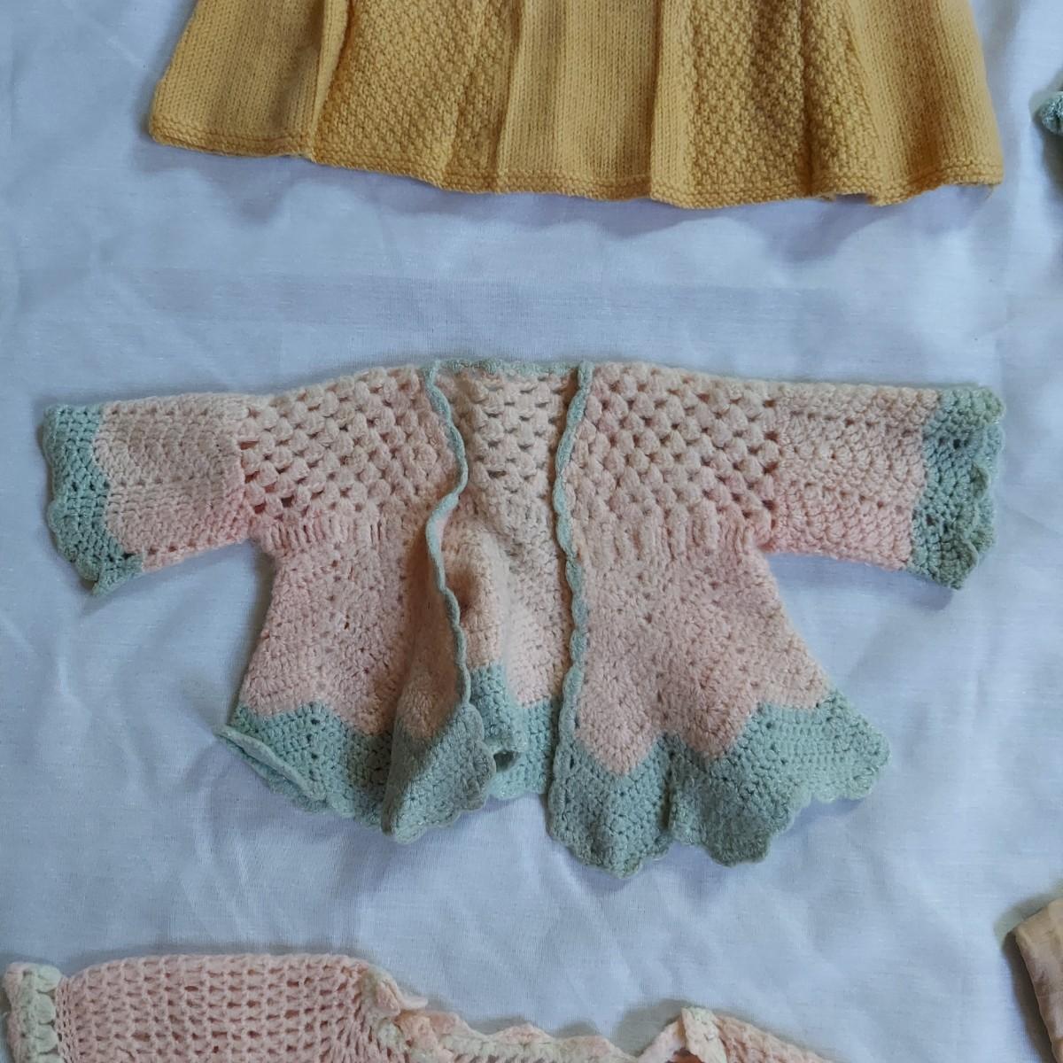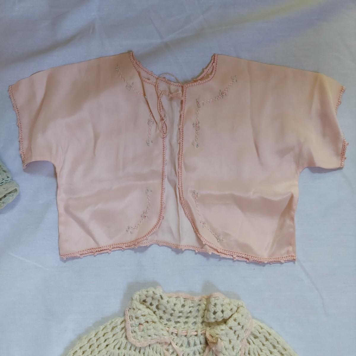 Near antique, vintage baby clothing. These items are likely from the 1930s. Lot includes many silk, knitted and flannel clothing pieces. Plus multiple baby shoes, knitted booties, bonnets and collars. There are some overall stains and holes due to age of items. Shipping available.