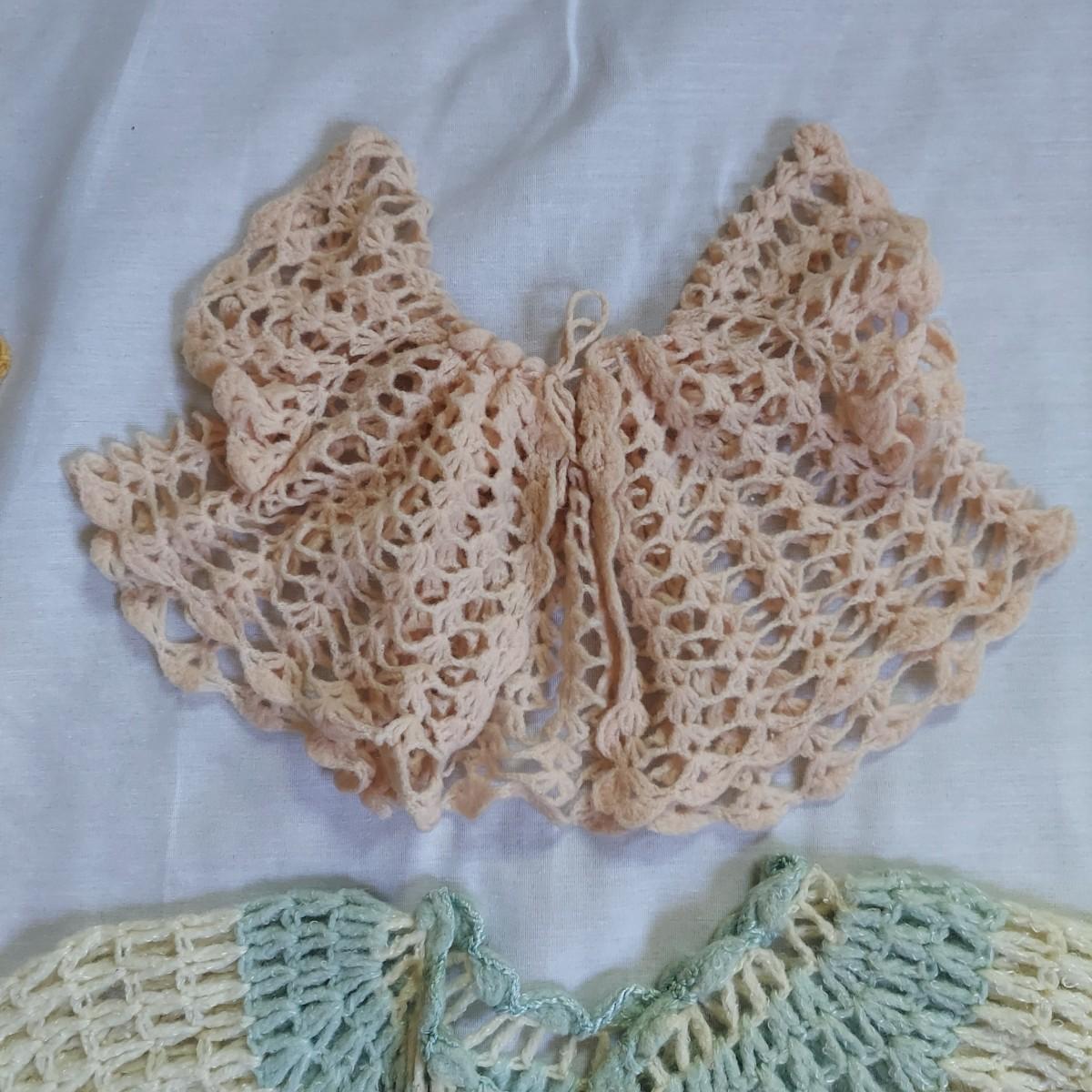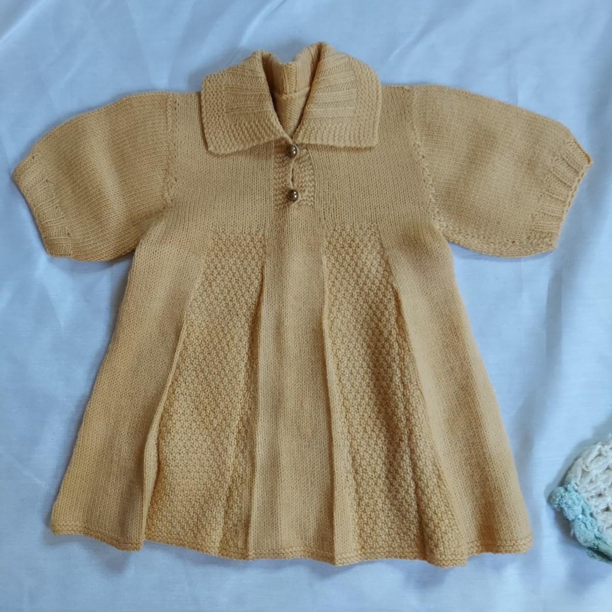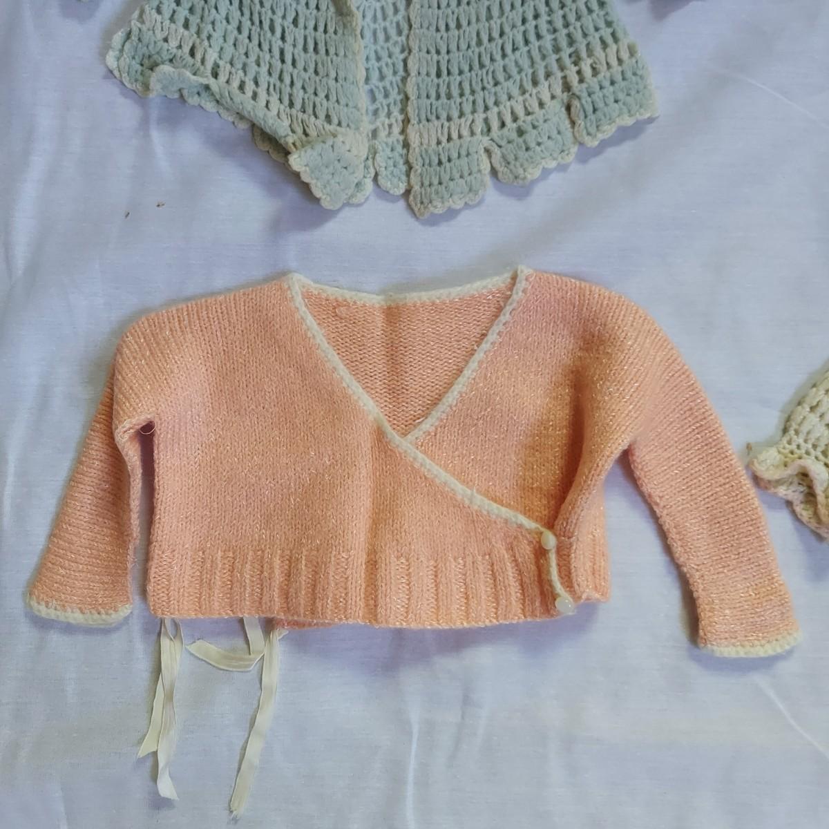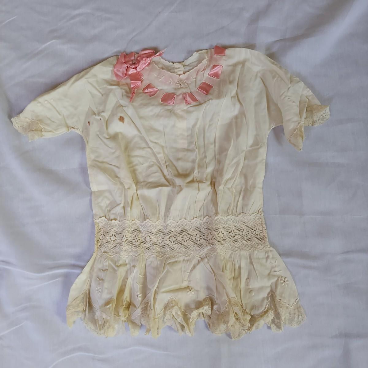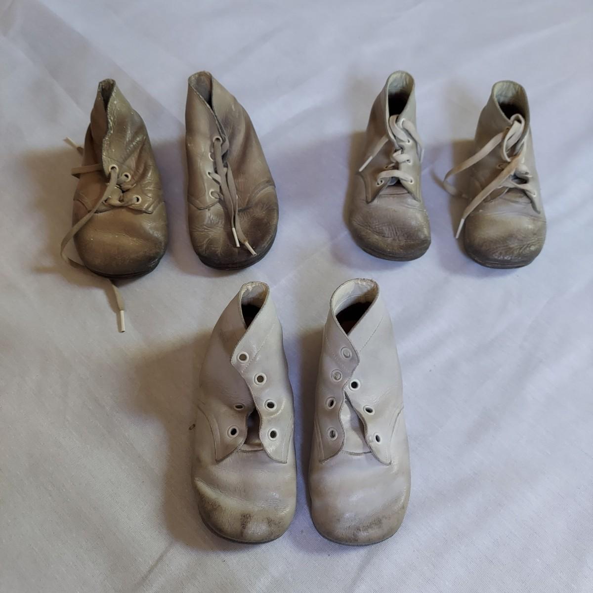 Near antique, vintage baby clothing. These items are likely from the 1930s. Lot includes many silk, knitted and flannel clothing pieces. Plus multiple baby shoes, knitted booties, bonnets and collars. There are some overall stains and holes due to age of items. Shipping available.