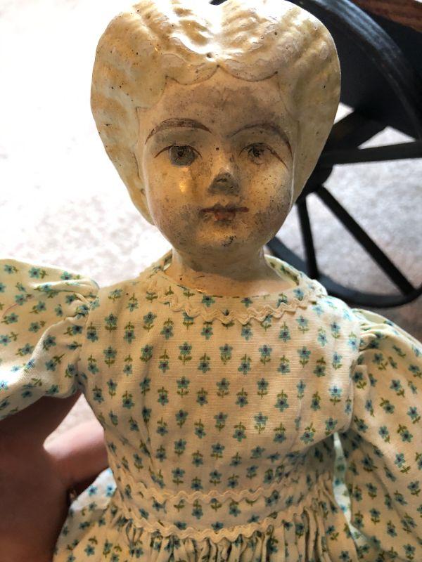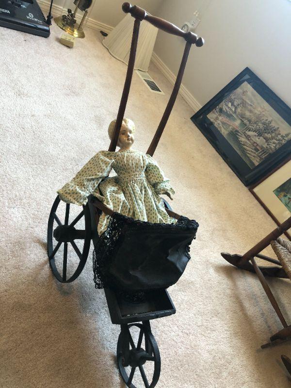 Beautiful antique baby doll and baby carriage. Appears to be Victorian era. In good condition, the carriage rolls along nicely. Please review images carefully.