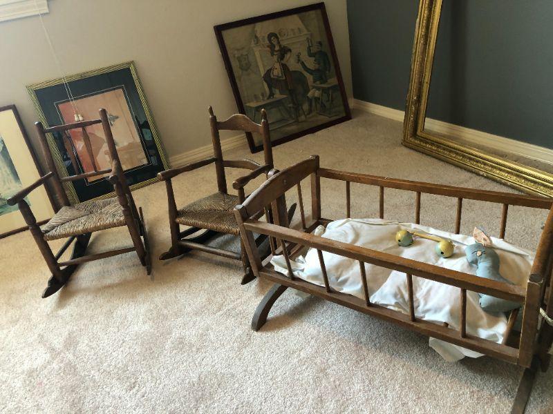 Lovely antique basinet and rocking chairs for dolls. In very good condition. Includes bedding and toys in the basinet.