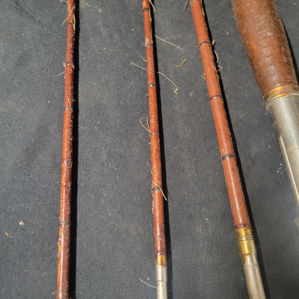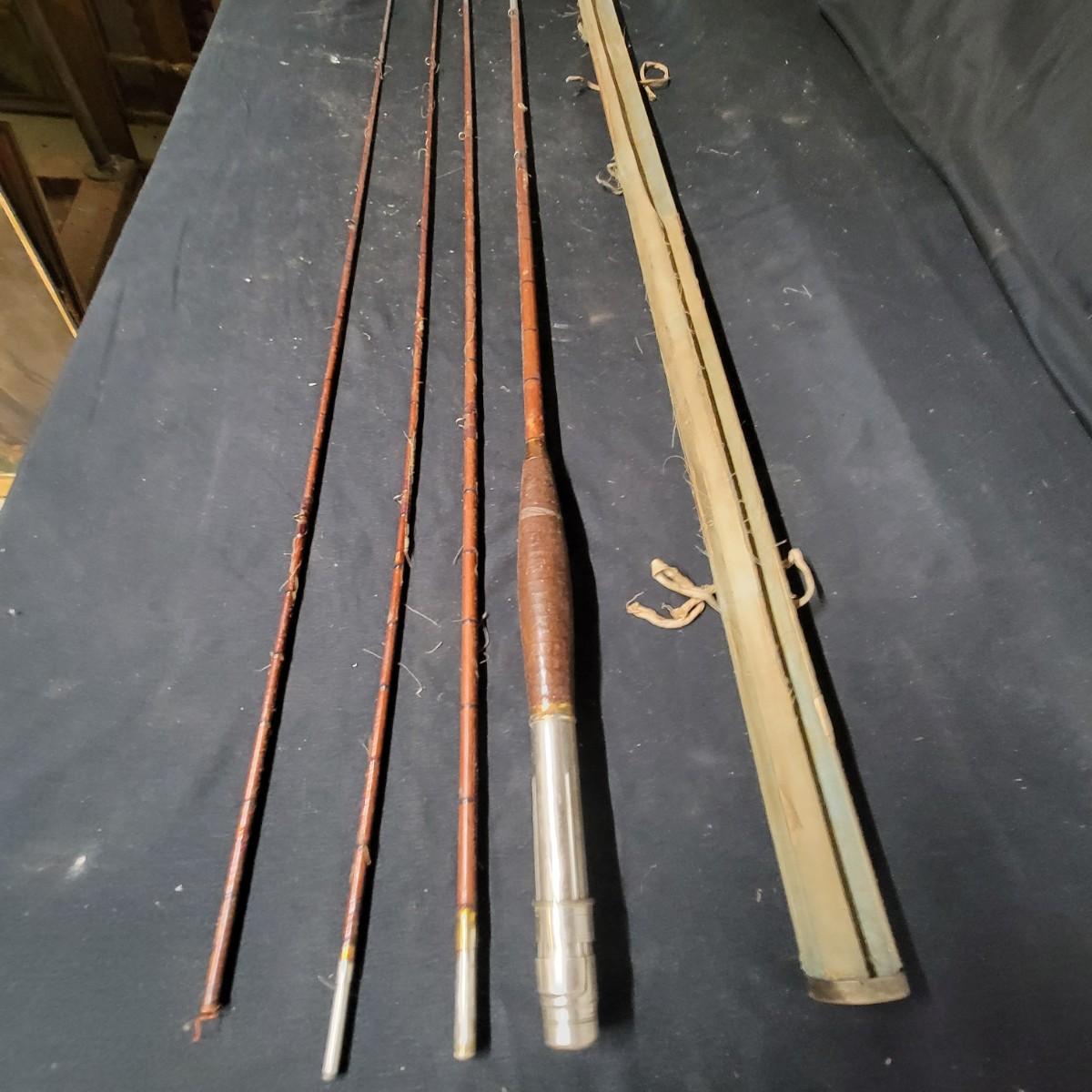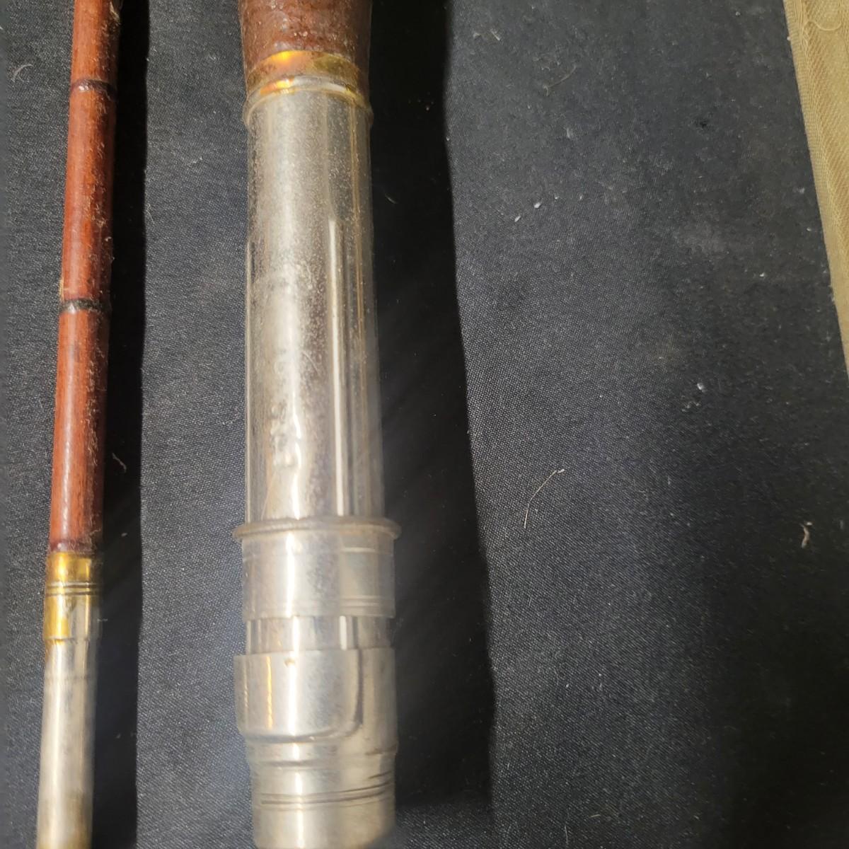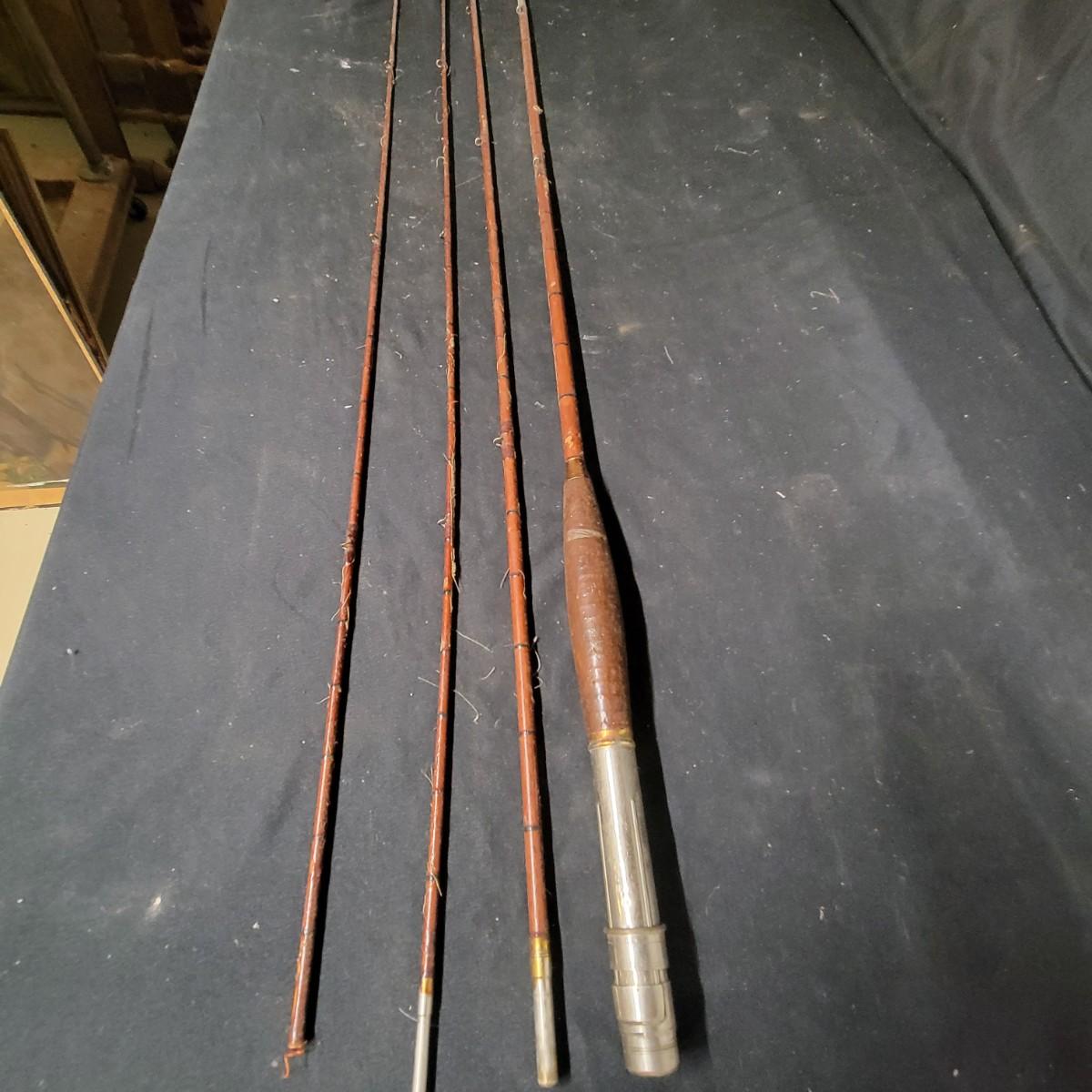 This rod has no markings, but it appears to be a Montique, turned bamboo. Fittings and ferrules are silver nickel, which are rare if this rod is post 1920. Rod is heavily varnished and one tip has a notable warp to it. The extra tip is missing its ferrule. Lot includes rod case and tube. Shipping available but may be costly due to size. Call UPS 828-252-6930 for quote prior to bidding.
