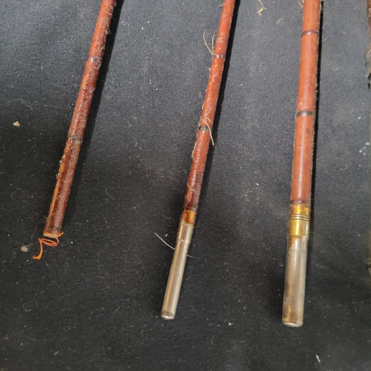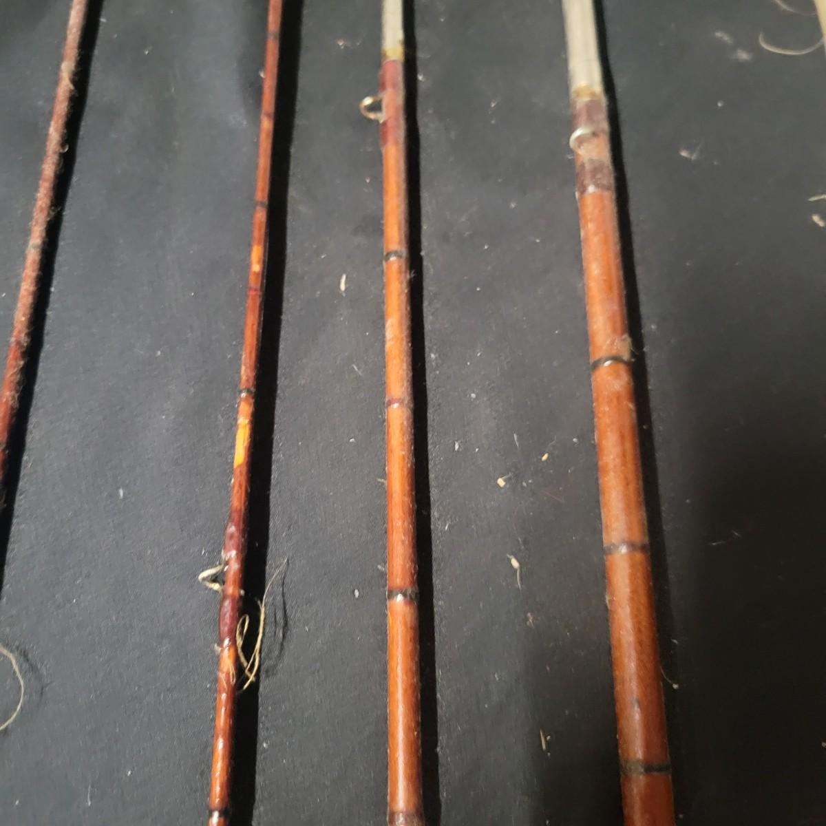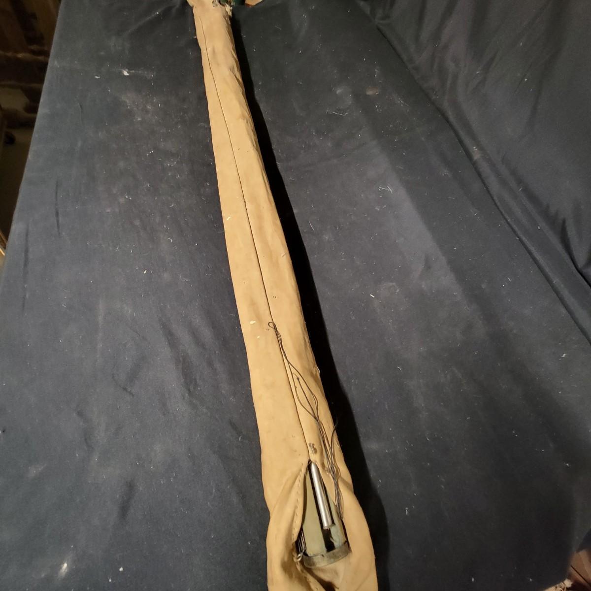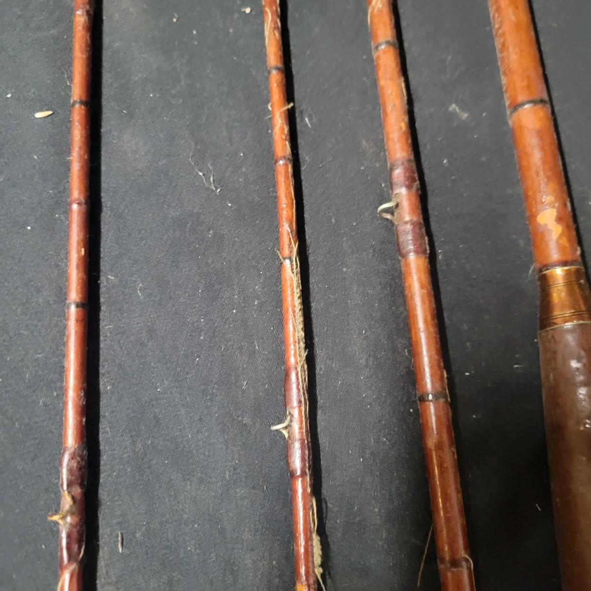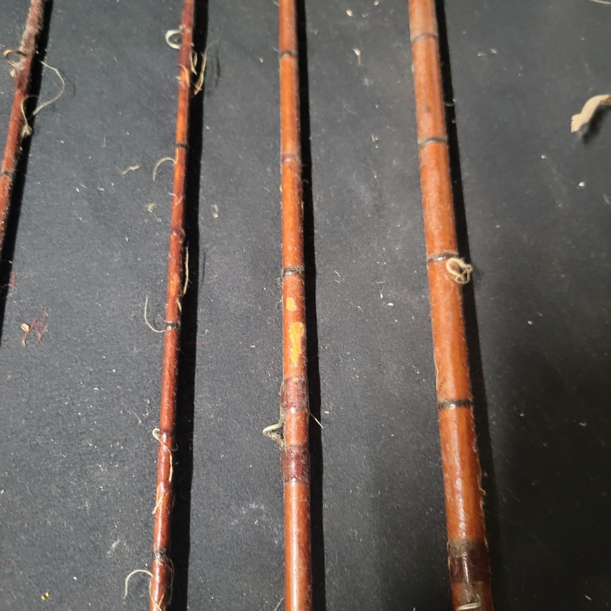 This rod has no markings, but it appears to be a Montique, turned bamboo. Fittings and ferrules are silver nickel, which are rare if this rod is post 1920. Rod is heavily varnished and one tip has a notable warp to it. The extra tip is missing its ferrule. Lot includes rod case and tube. Shipping available but may be costly due to size. Call UPS 828-252-6930 for quote prior to bidding.