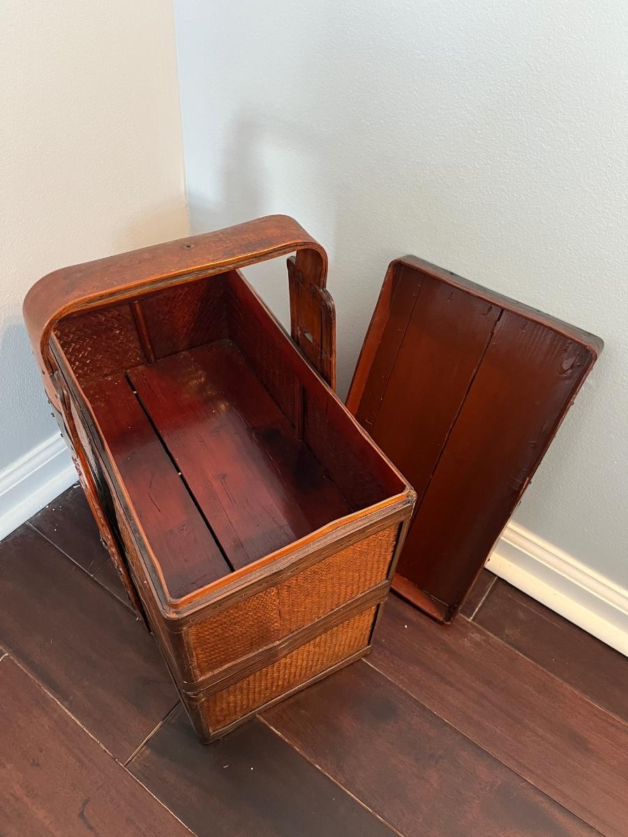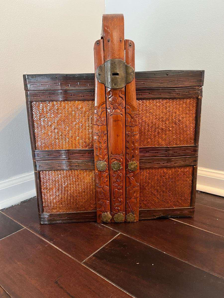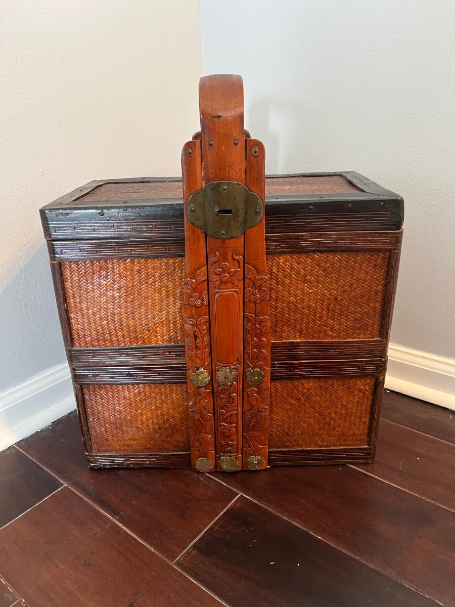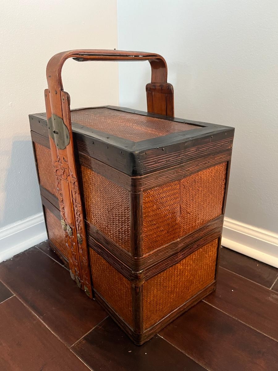 A handsome antique 2 tiered Chinese woven basket with a natural finish and original hardware. It's in excellent condition and dates from the early 20th century.