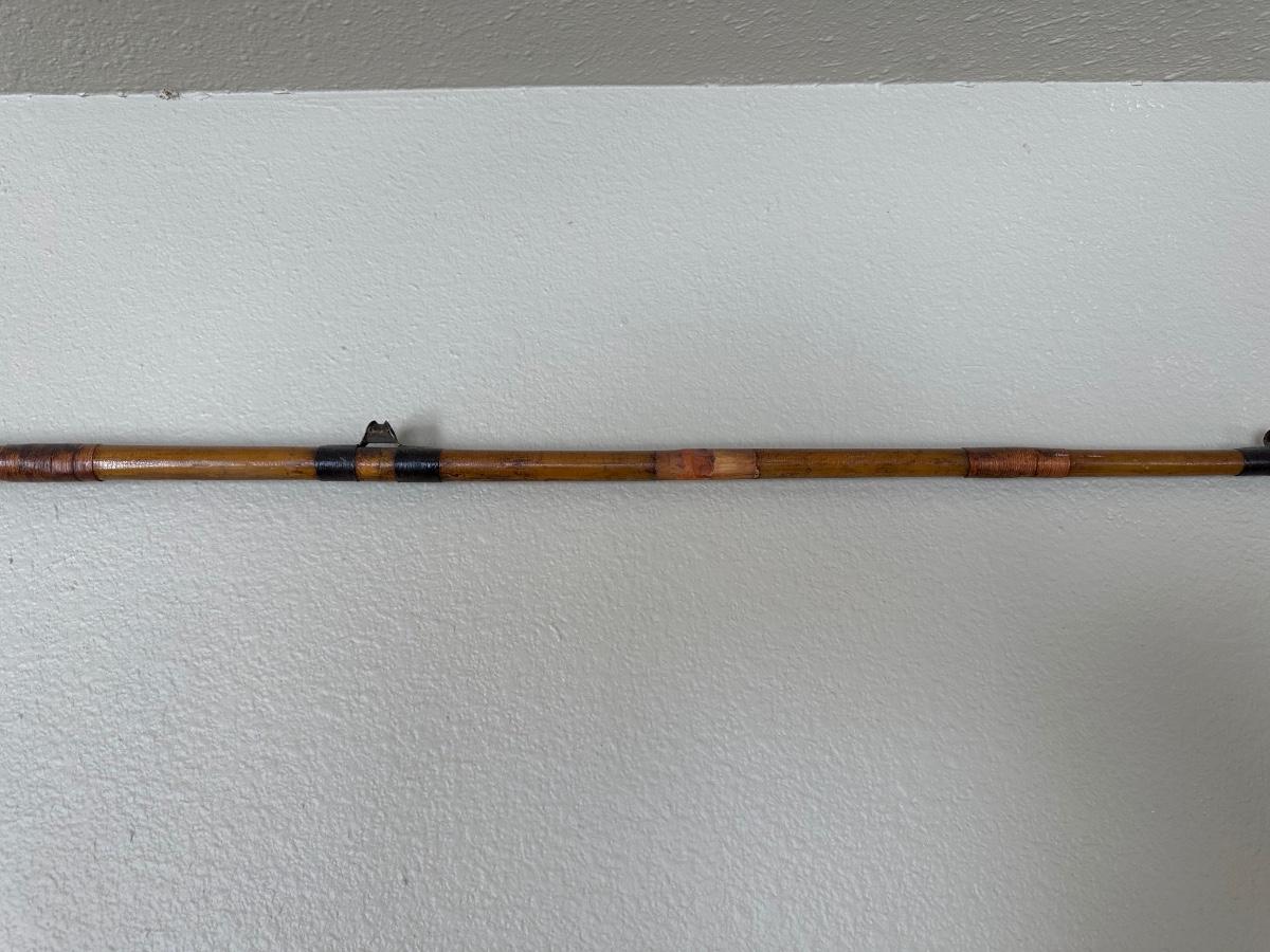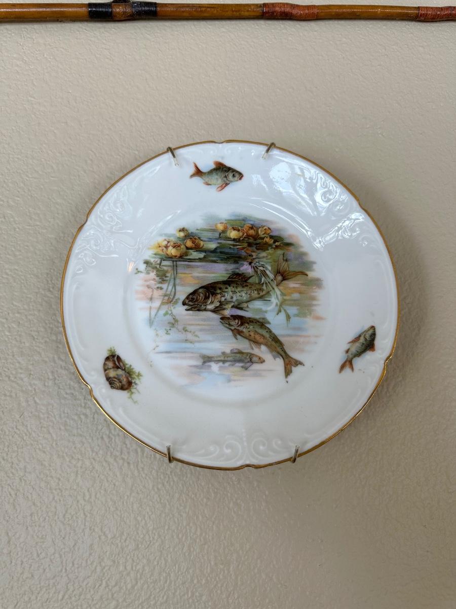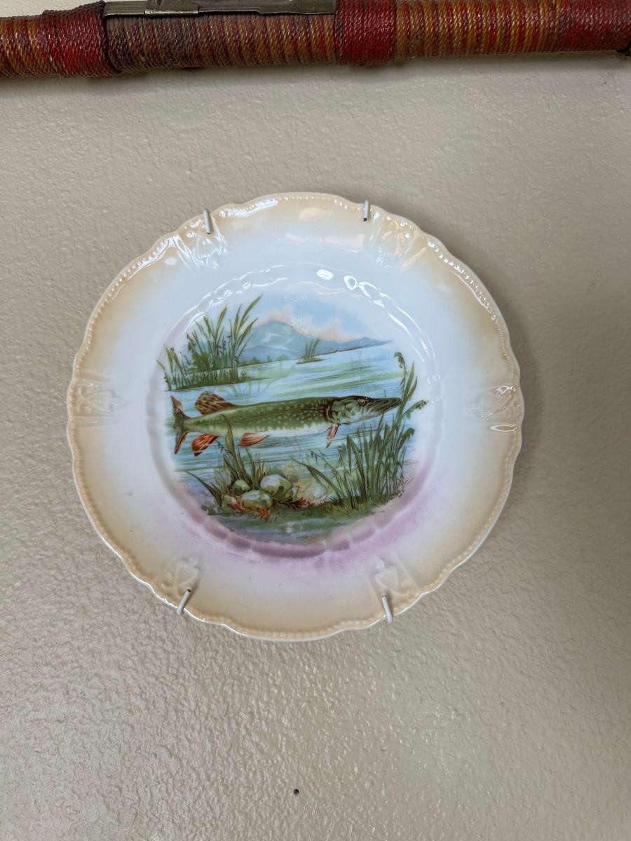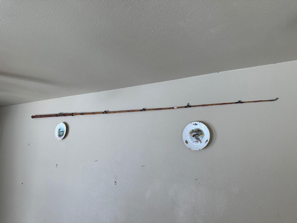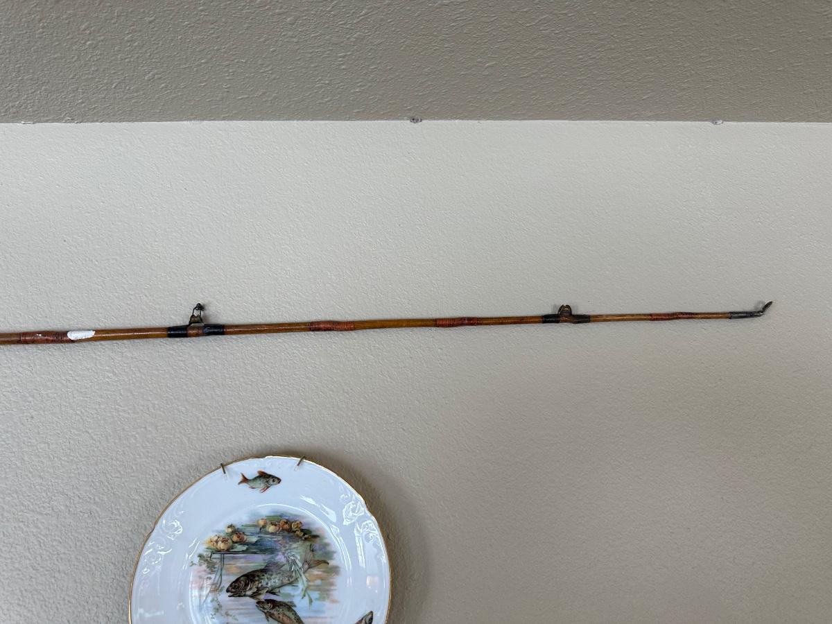 ANTIQUE BAMBOO FISHING POLE AND 2 FISH THEMED PLATES