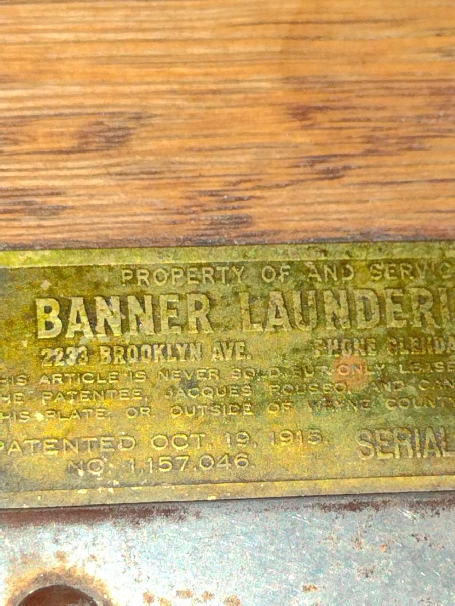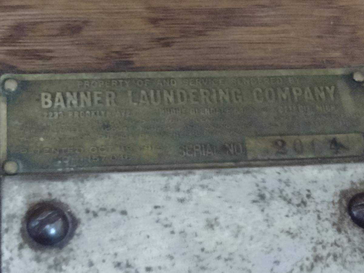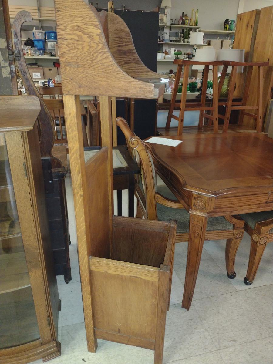 Antique Banner Laundering Company Oak Towel Rack with Laundry Bin. Item was from old Tigers Stadium (Detroit, Michigan) locker room per owner.