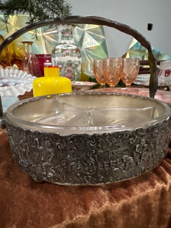 Silver Plate Repousse Relish or Candy Nut Dish Divided Glass Insert for condiments or pickles has Dutch themed in silver plate with three section glass insert