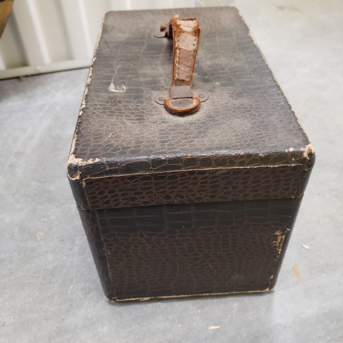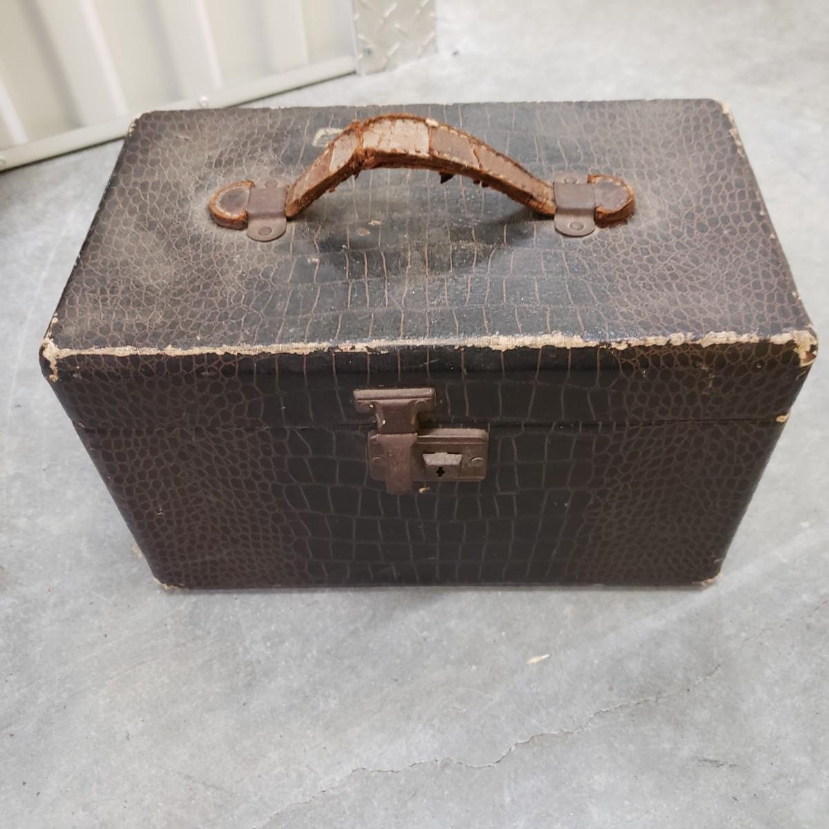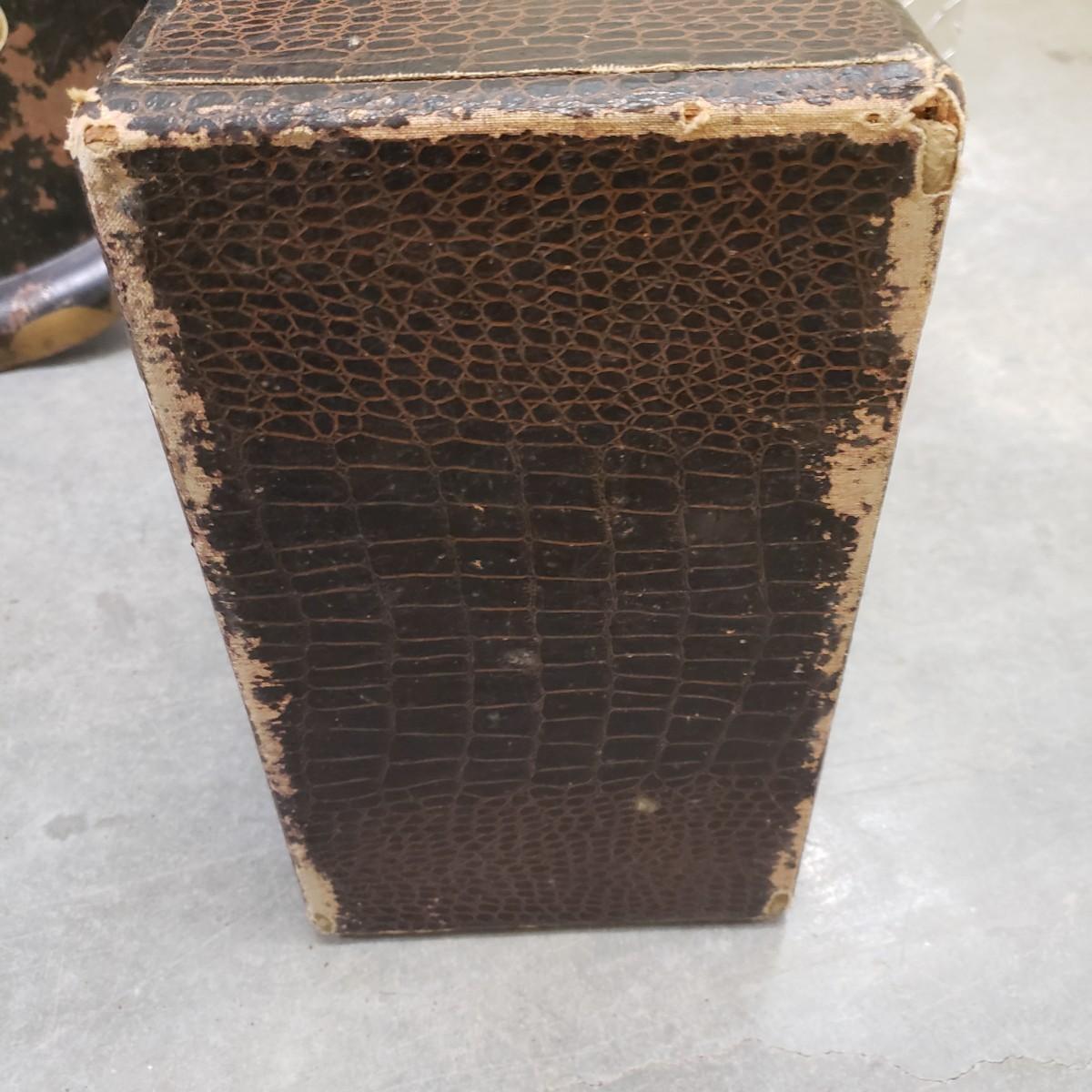 This seven piece (possibly antique) lot features a wooden basket measuring 13" x 22" x 16"H. The alligator wooden box has a leather handle. The sweet grass basket has leather trim. Some of the trim is pulled away from the basket, see picture. The ledger from Weiss still has paper and alphabetical tabs.