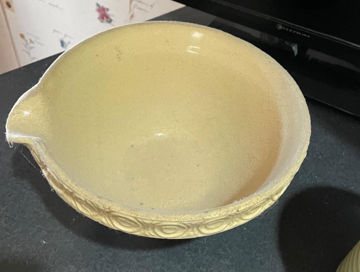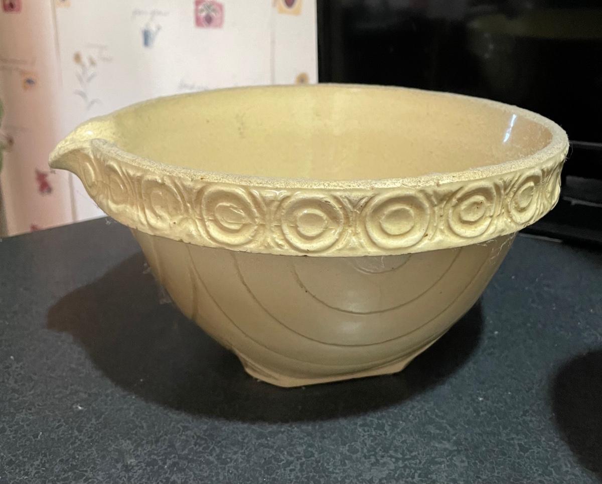 Beautiful 10” yellow ware bowl with spout, has some wear.