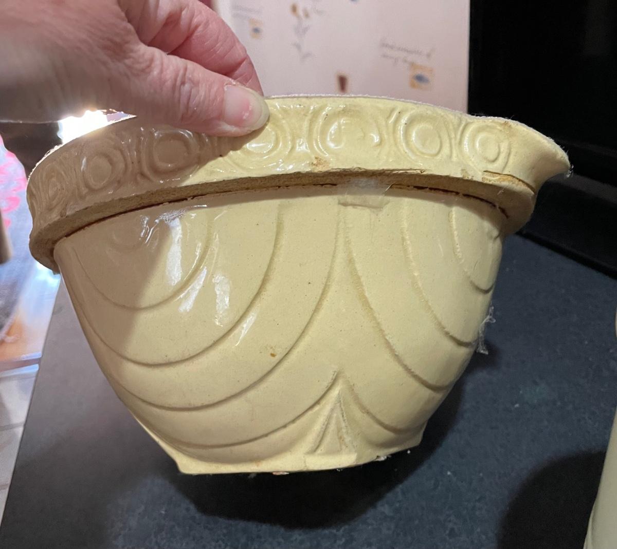Beautiful 10” yellow ware bowl with spout, has some wear.