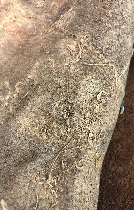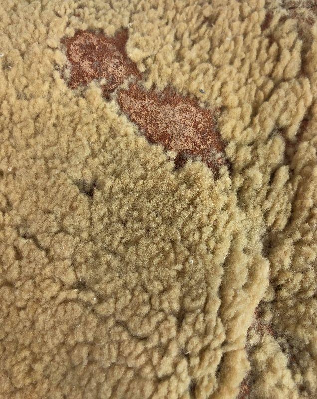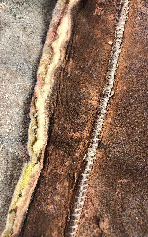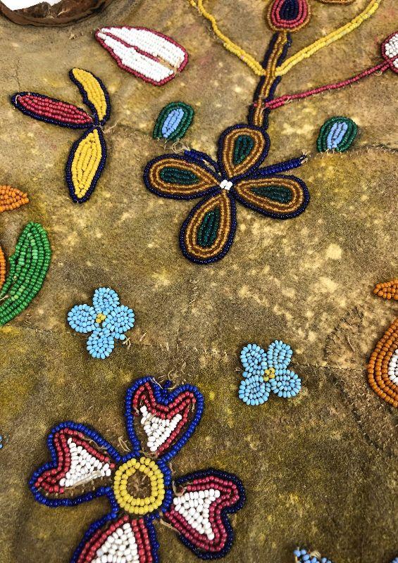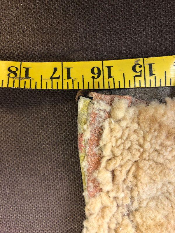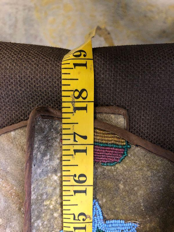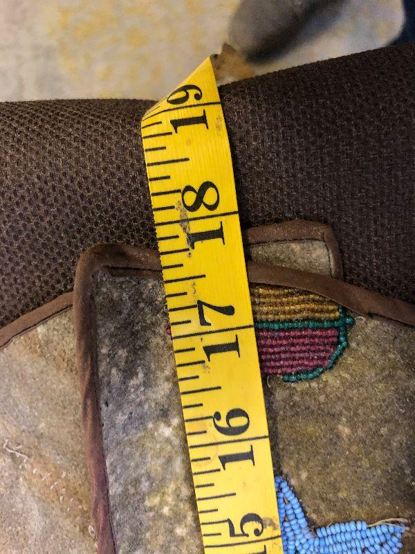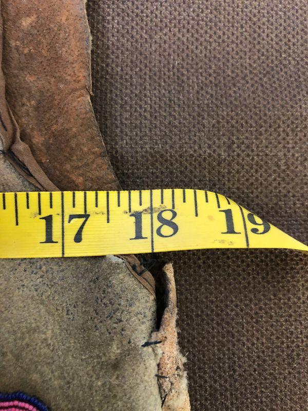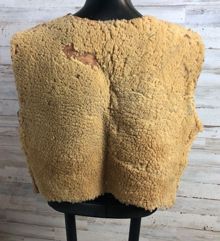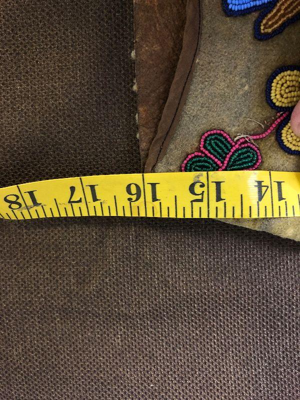 Chest 18” across, shoulder to shoulder 16”, length 18”, bottom opening 17”. Note that it appears to have been let out about 1” on each side at some point in its life. Some beading is missing as well as a couple of bare spots where the wool has fallen off. All leather but the front portion is a different leather possibly buckskin. There is a fabric edging sewn around the front of the arm holes and along the bottom. The thread is a cotton or fiber, not sinew. The beads all appear to be glass.