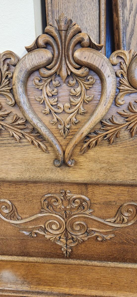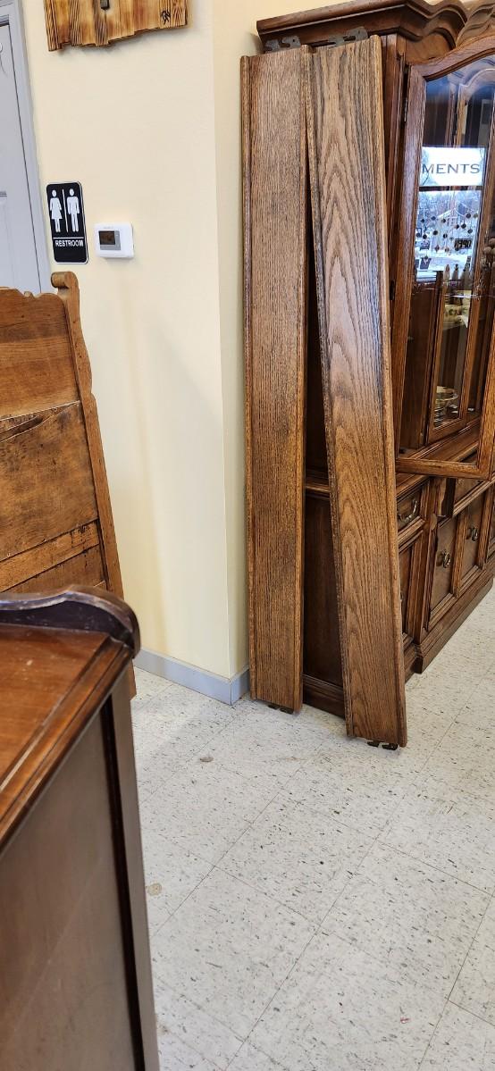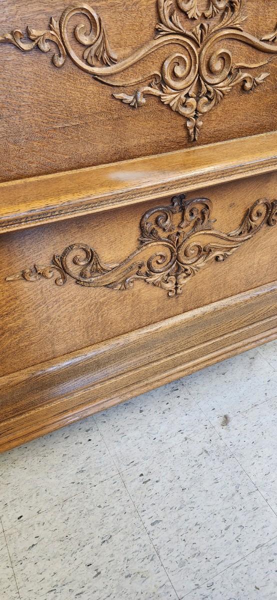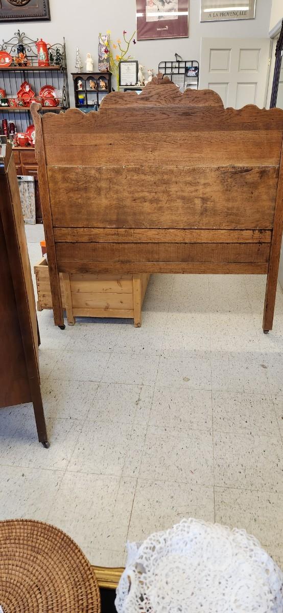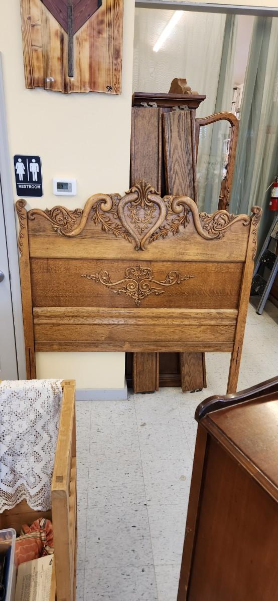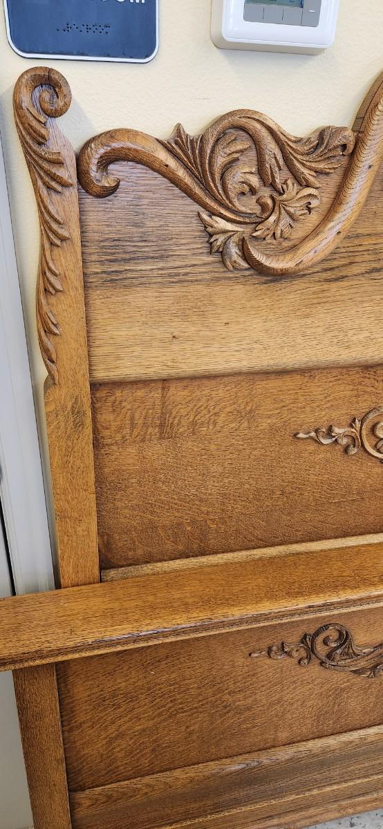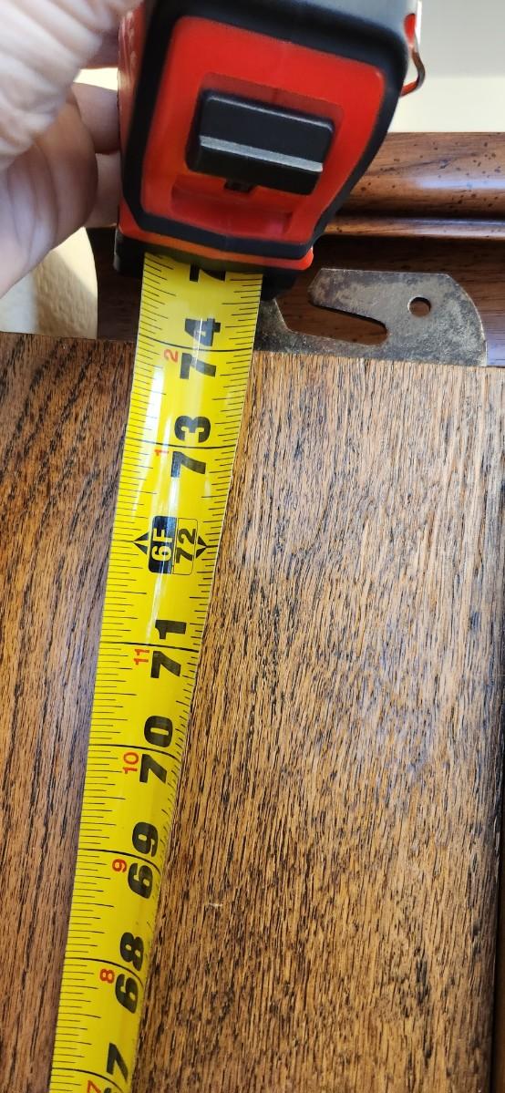 Unbelievable full sized headboard, footboard, rails and slats. This bed is incredible, please feel free to stop by the shop and look at it. 59" wide and the headboard is 61" at it's tallest point. Amazon sells pieces that would allow this headboard and footboard to attach to a queen frame.