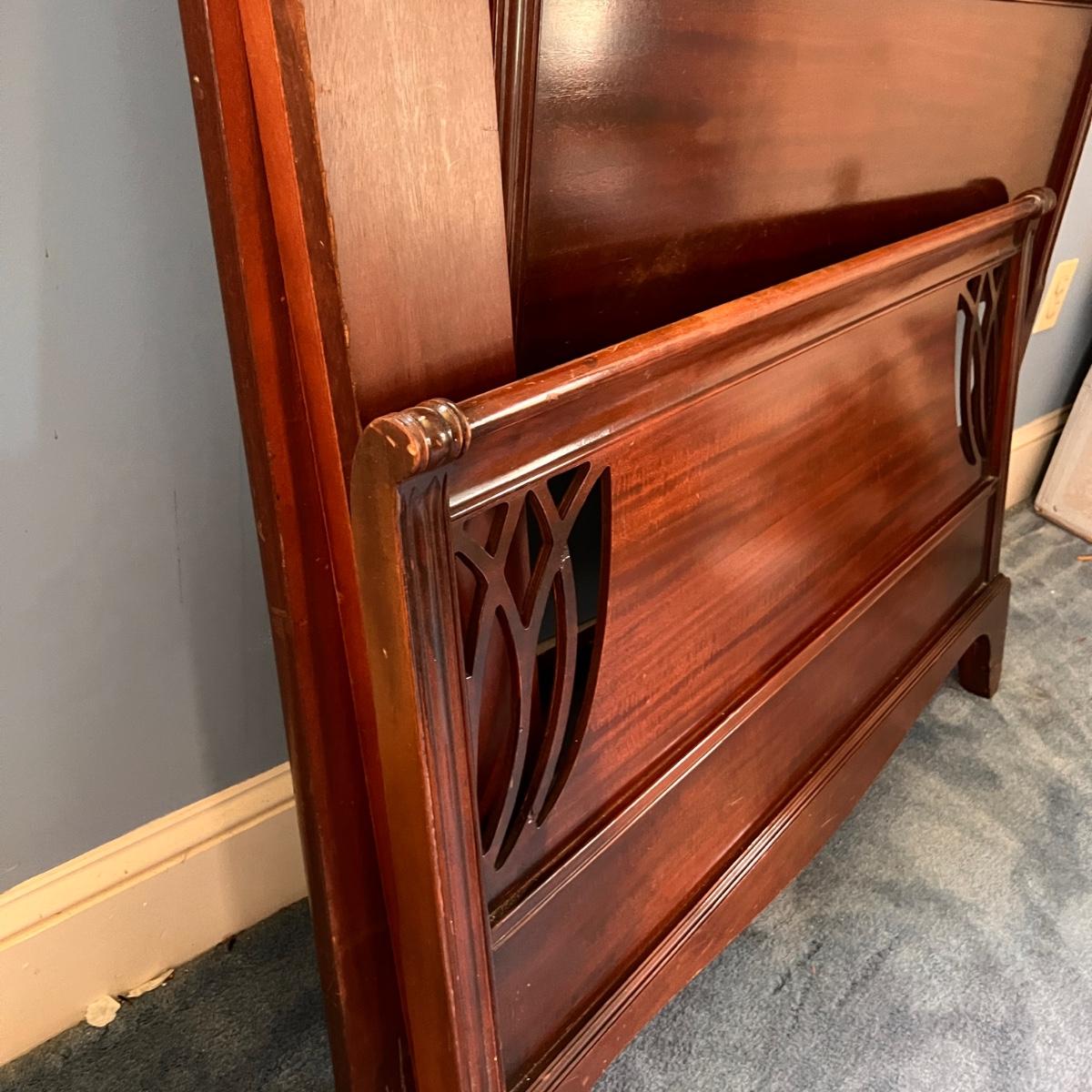 Decorative antique carved wood twin size bed frame. Shows some age, see all pics for condition. Already disassembled, does not come with nails/screws/bits.