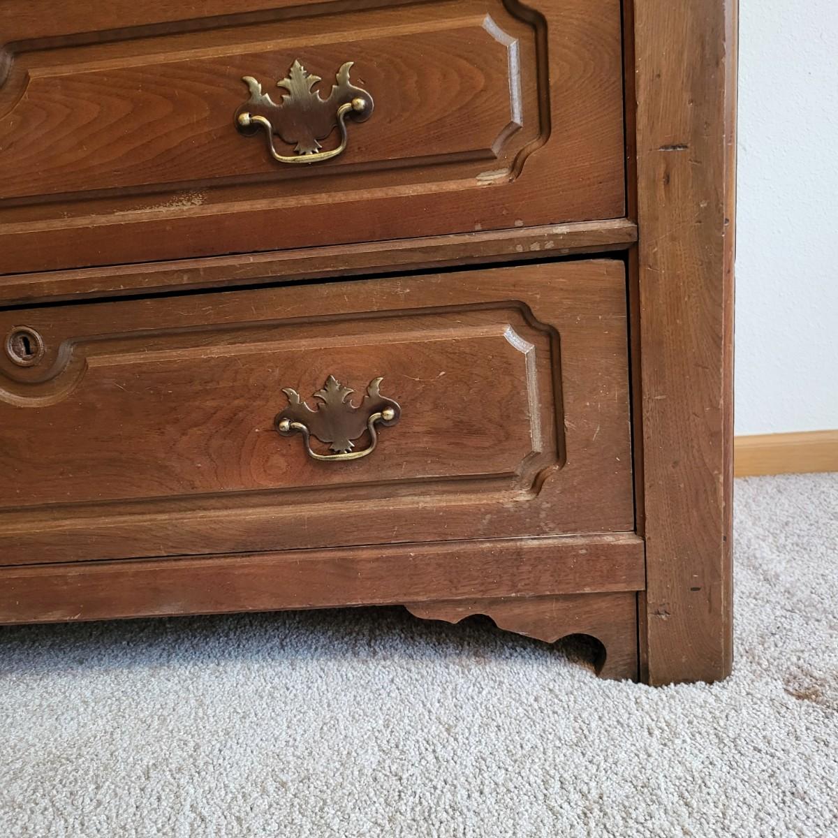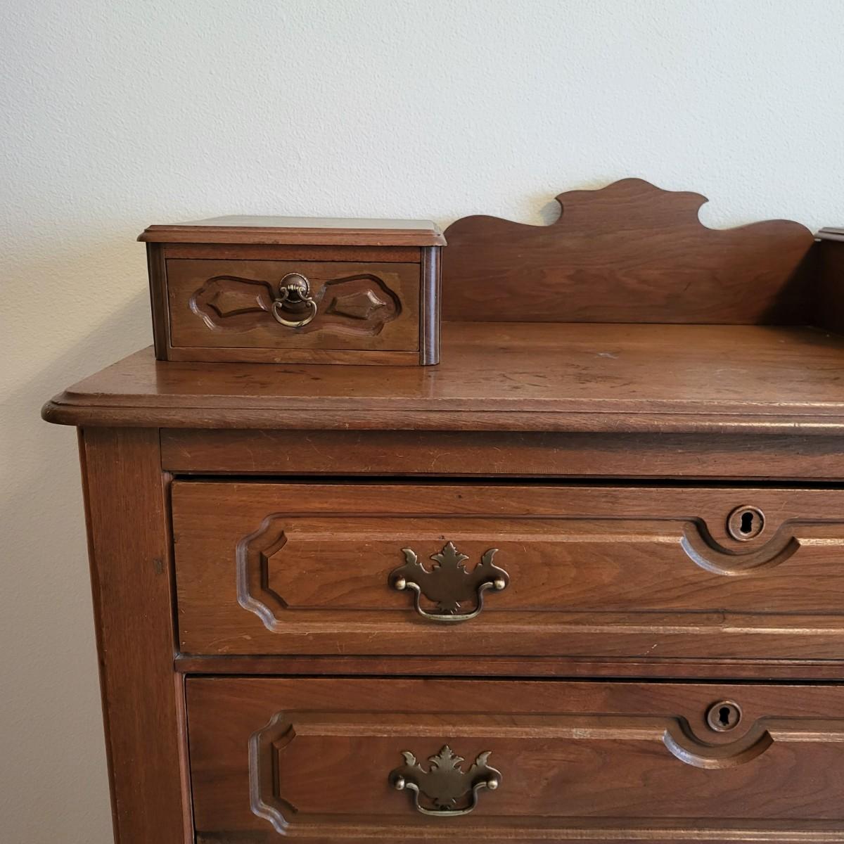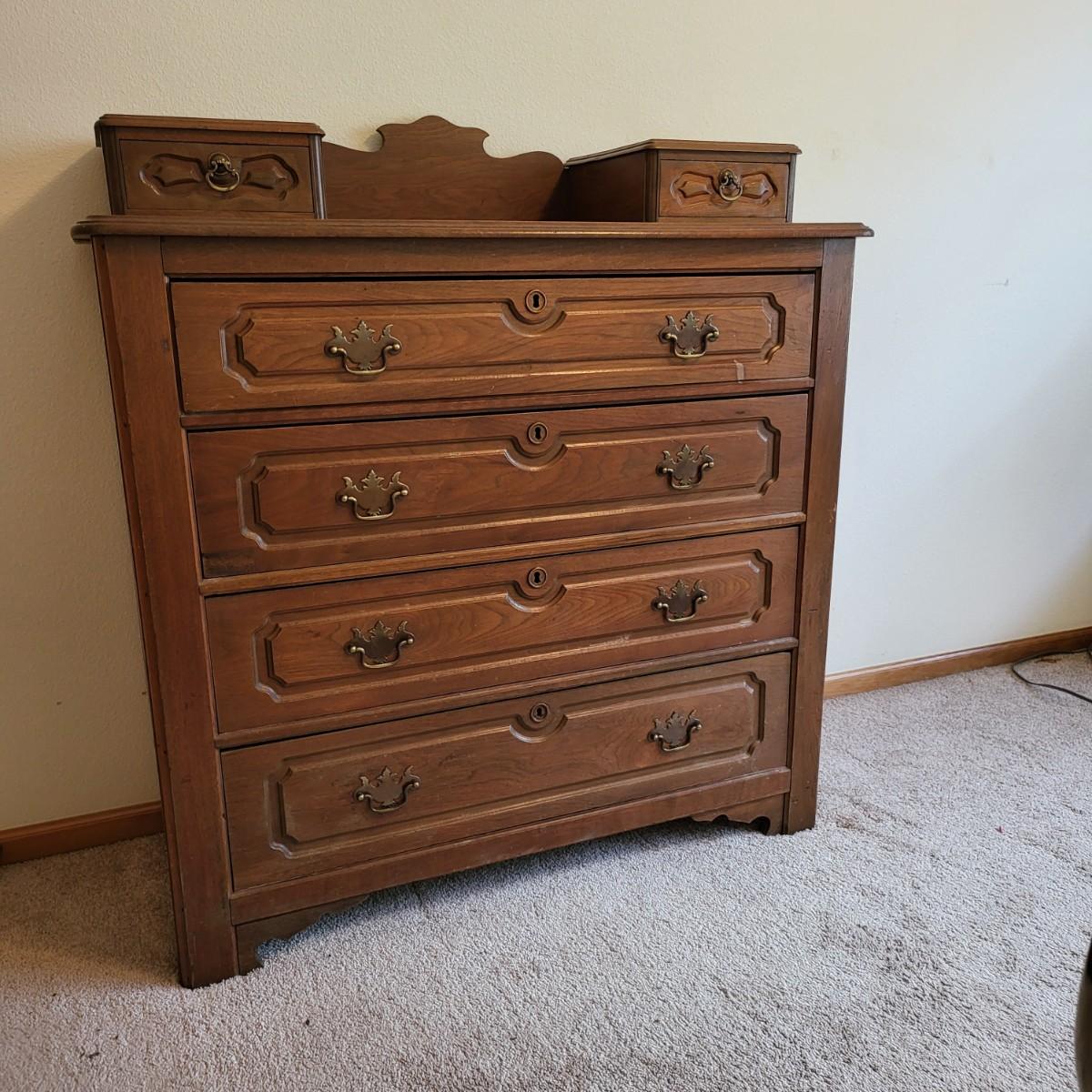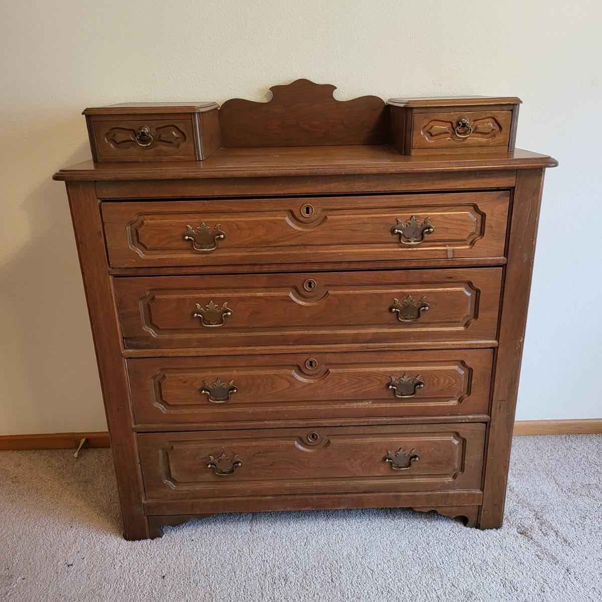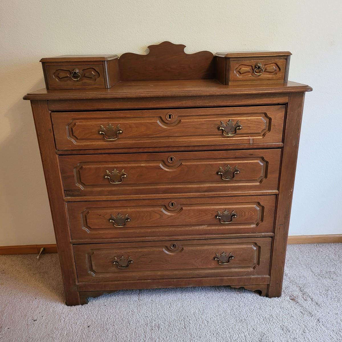 Antique wood bedroom dresser. Four full length drawers on bottom, two small top vanity drawers. Brass colonial style drawer pulls. 42" long x 42" tall x 17" deep.