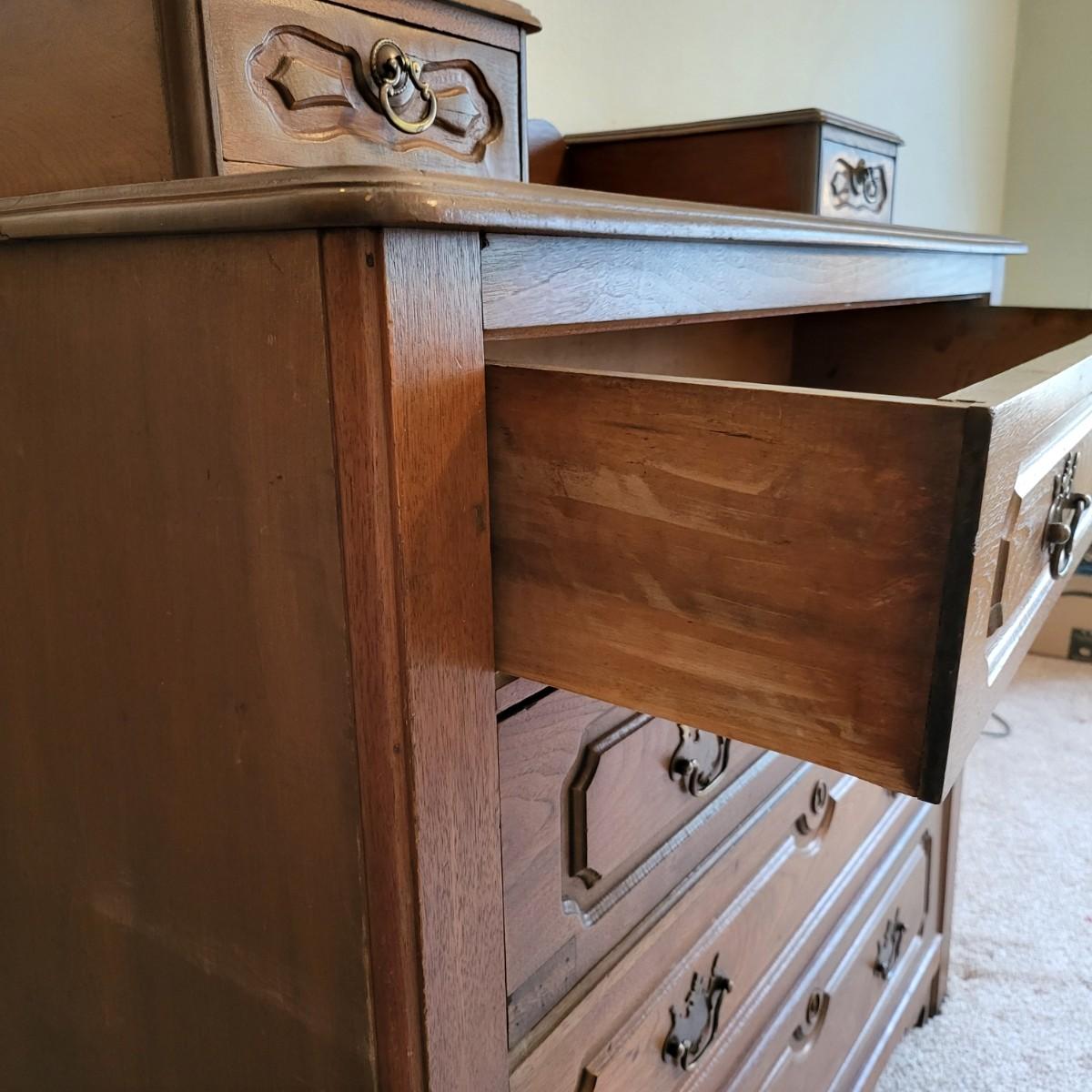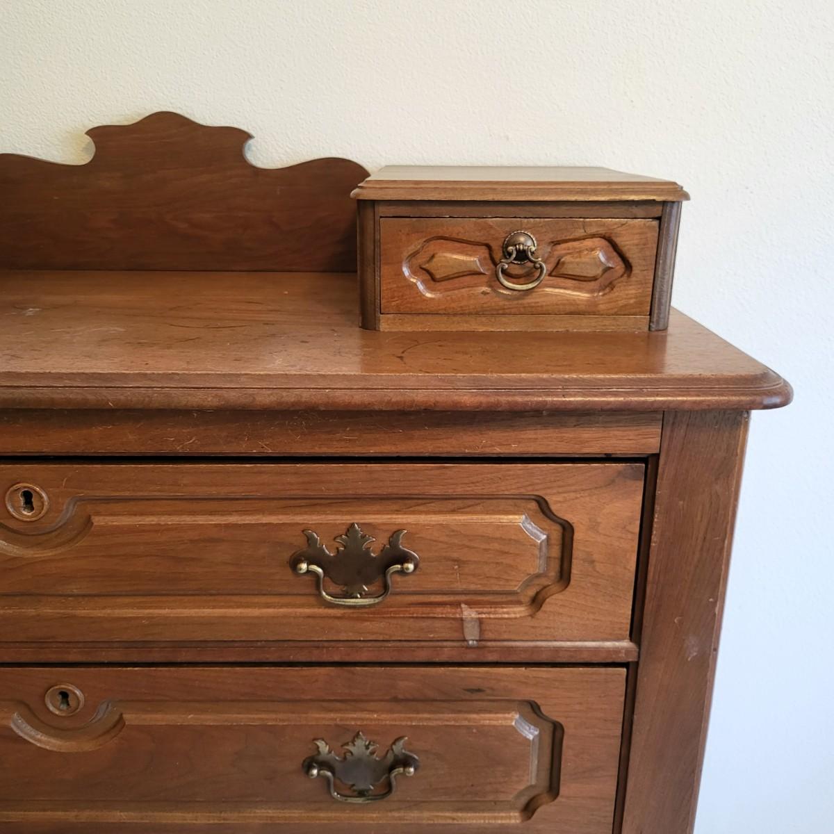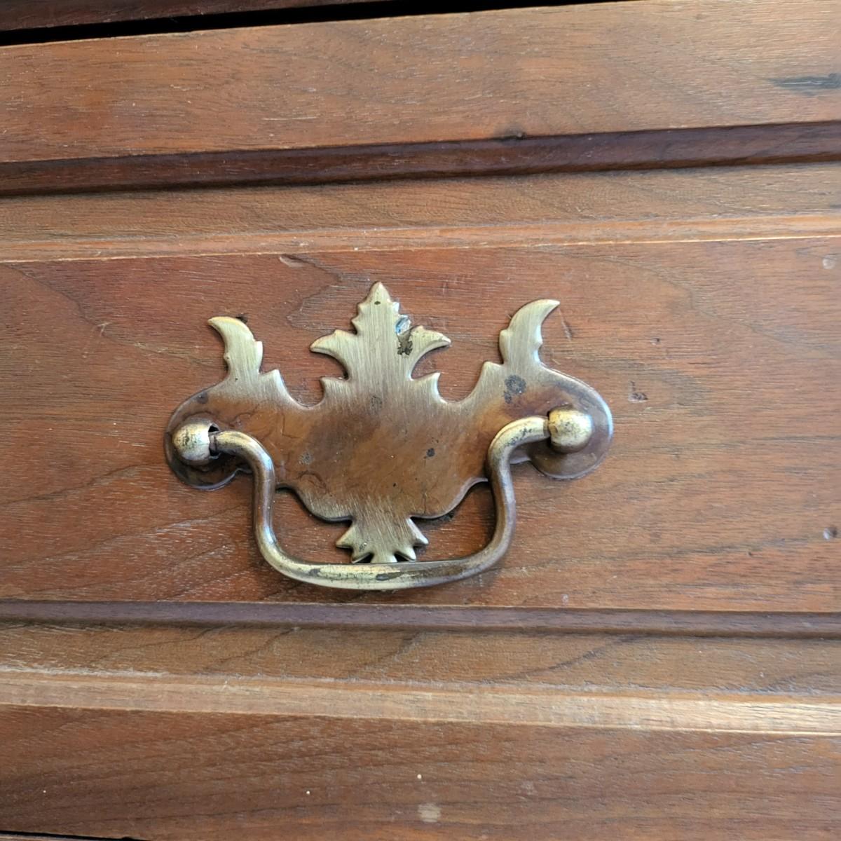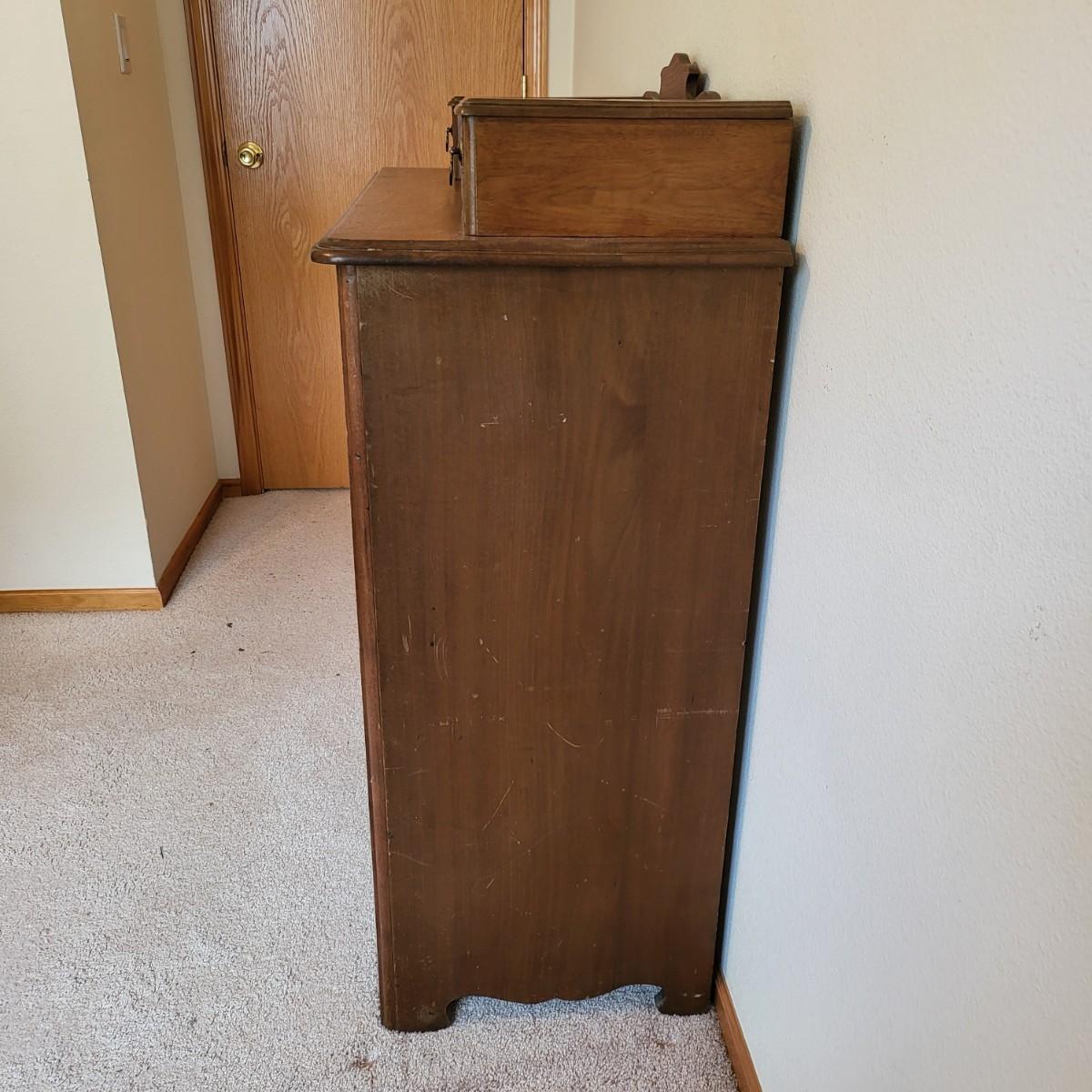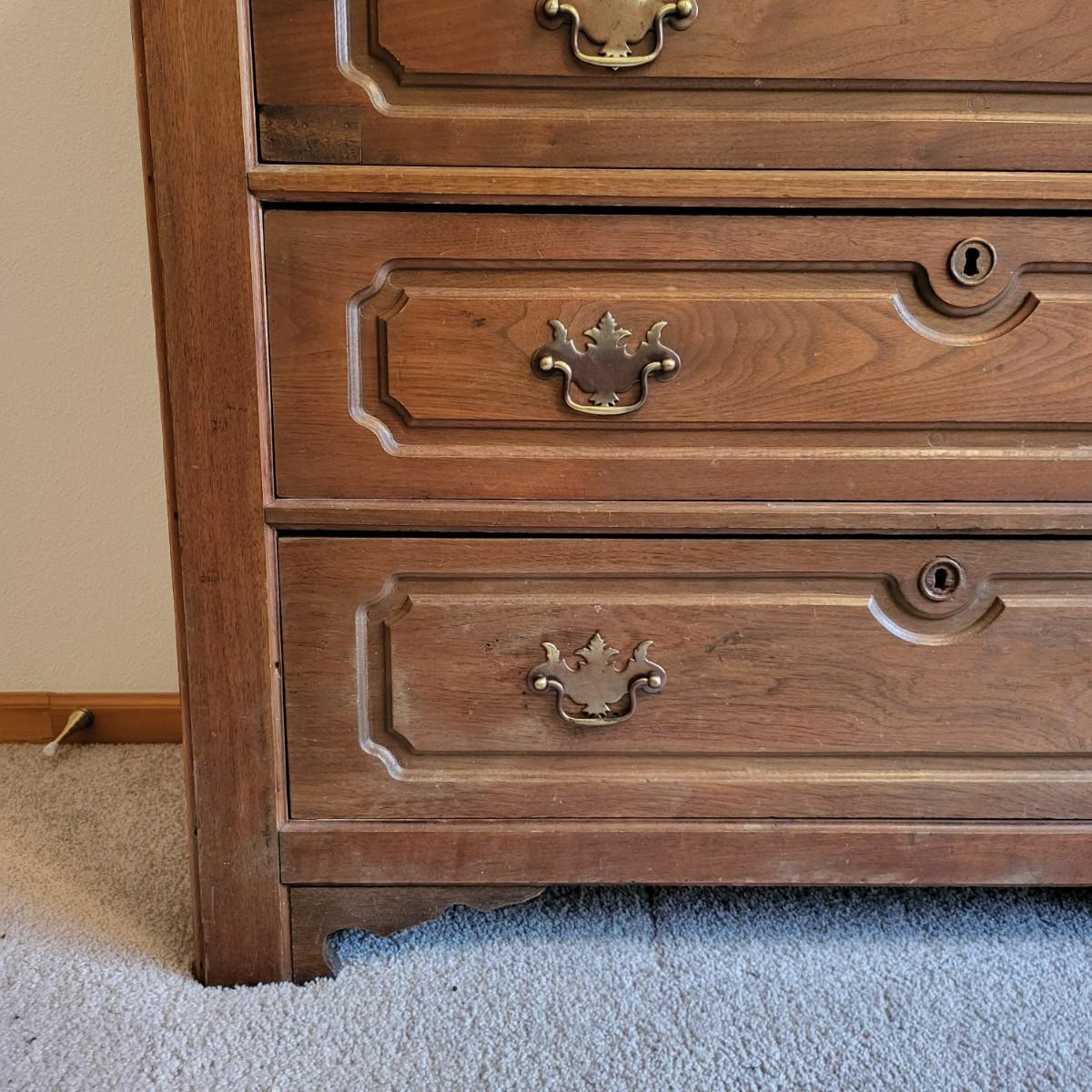 Antique wood bedroom dresser. Four full length drawers on bottom, two small top vanity drawers. Brass colonial style drawer pulls. 42" long x 42" tall x 17" deep.